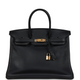 This Birkin is in Black Jonathan leather with gold hardware and has tonal stitching, front flap, two straps with center toggle closure, clochette with lock and two keys, and double rolled handles.