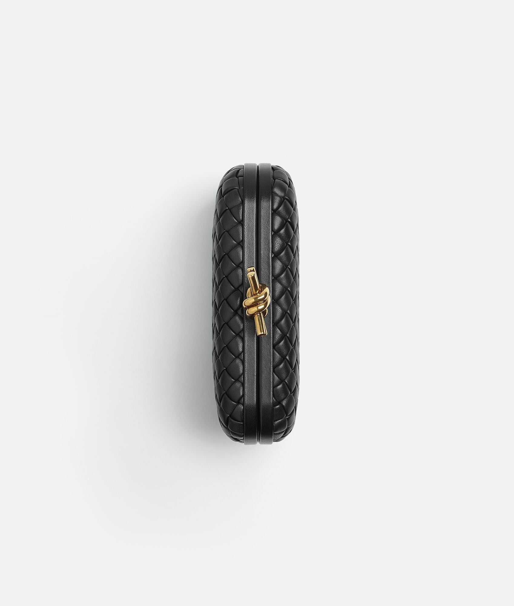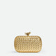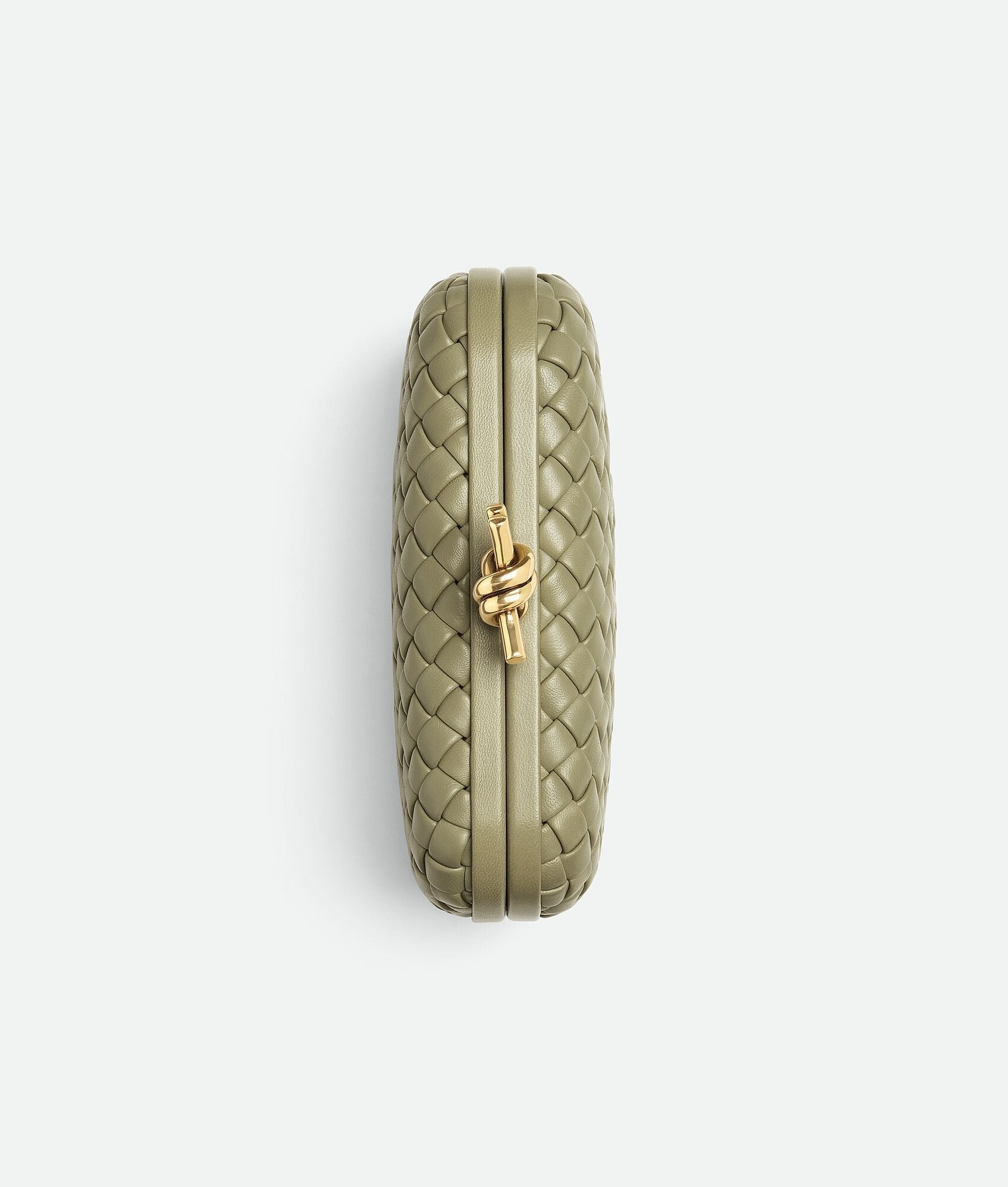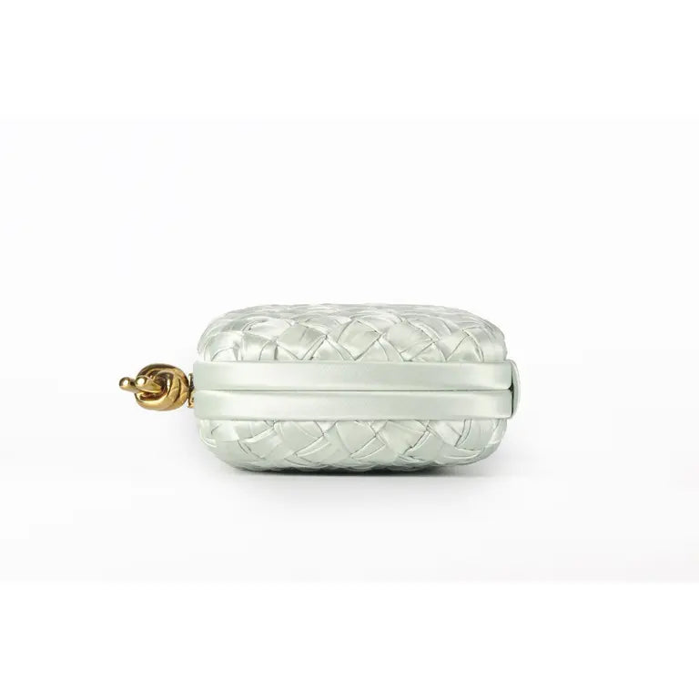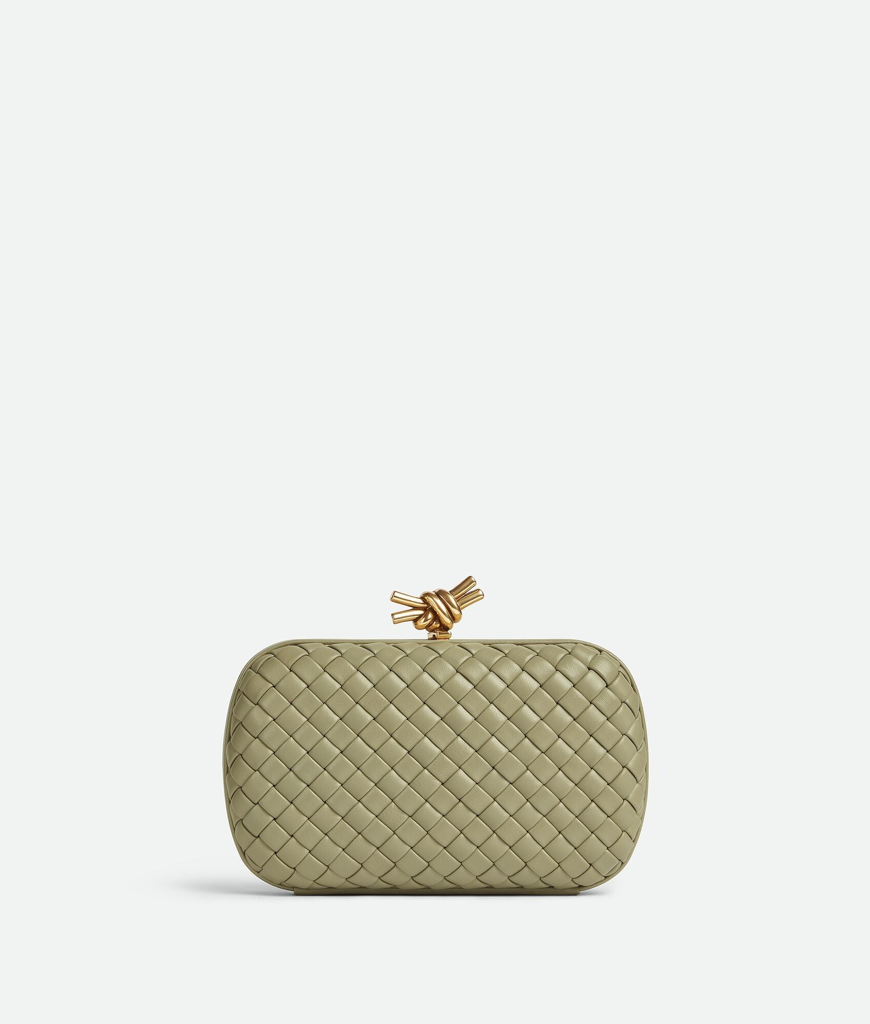 Minaudière clutch in padded Intreccio leather with foggy mirror effect and signature knot closure.