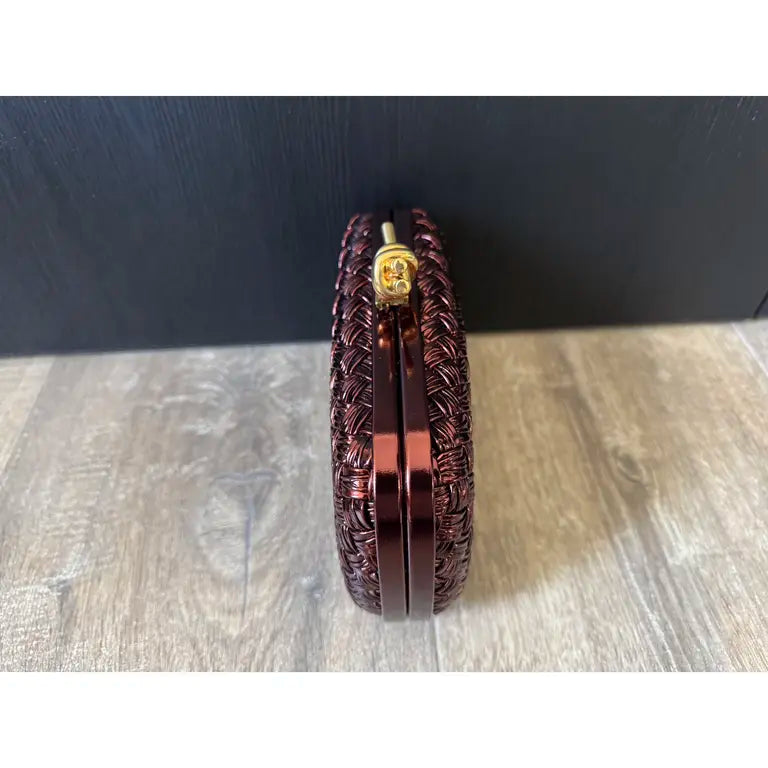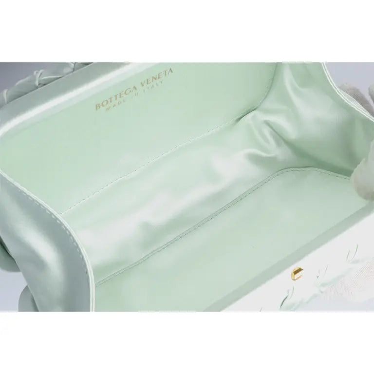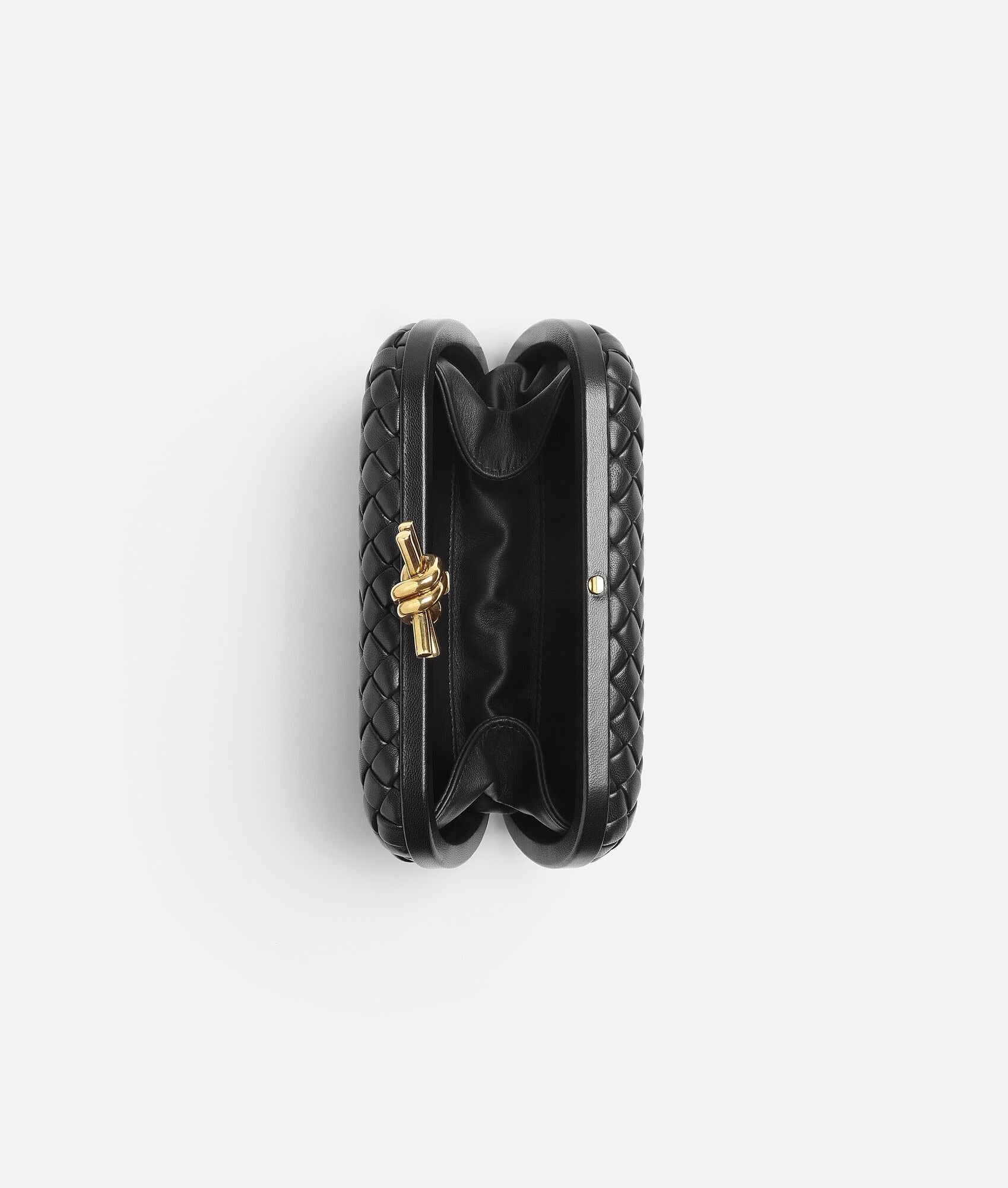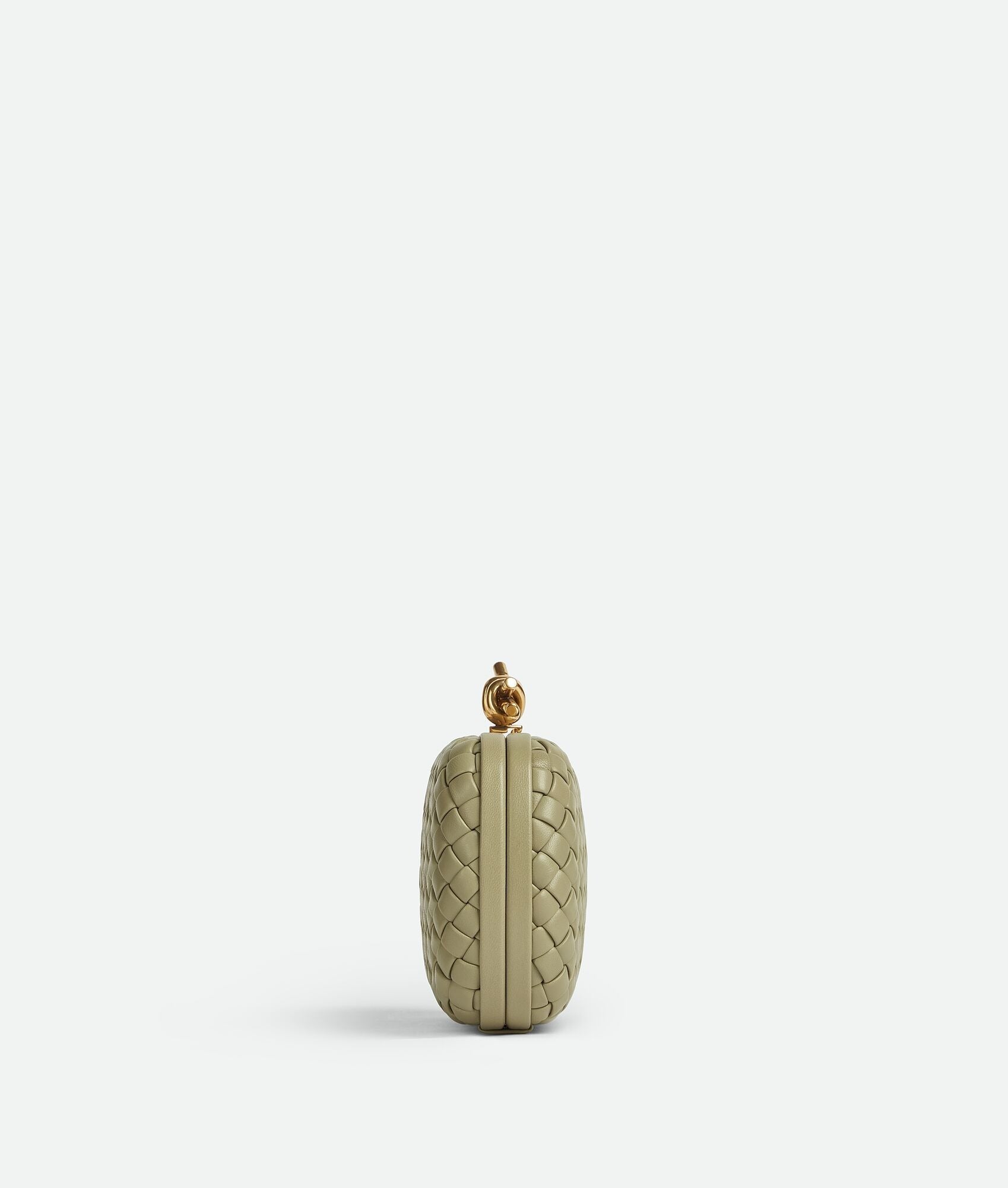 Minaudière clutch in padded Intreccio leather with foggy mirror effect and signature knot closure.