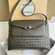 This sophisticated shoulder bag combines classic woven leather craftsmanship with a sleek flap design and metallic rope-style clasp. The wide body and secure closure offer both elegance and functionality, making it ideal for work or weekend wear. A refined statement piece with elevated details and a comfortable adjustable strap.