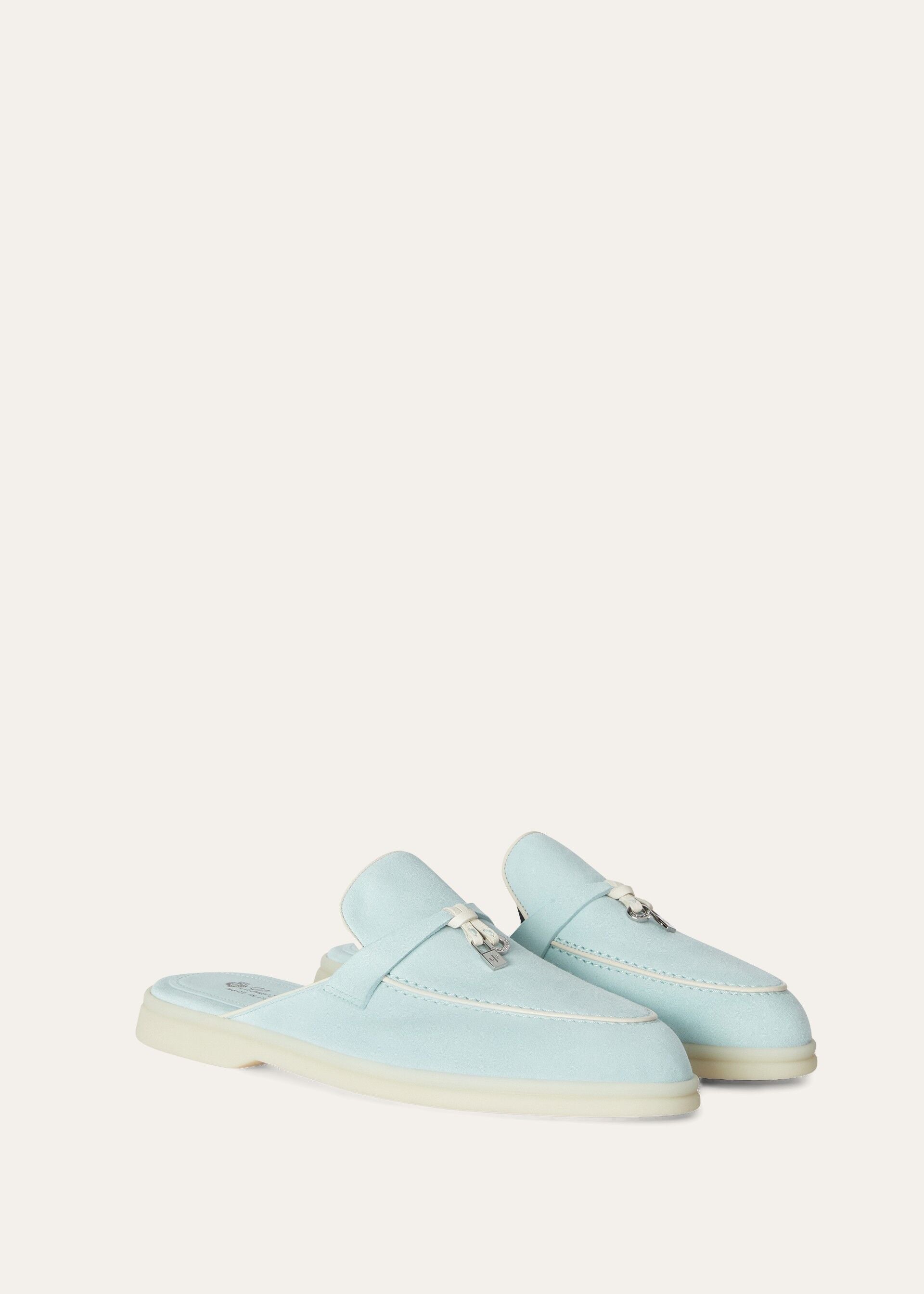 Suede slipper version of the iconic Summer Charms Walk. Nappa leather piping and saddles with Loro Piana My Charms complete the look.