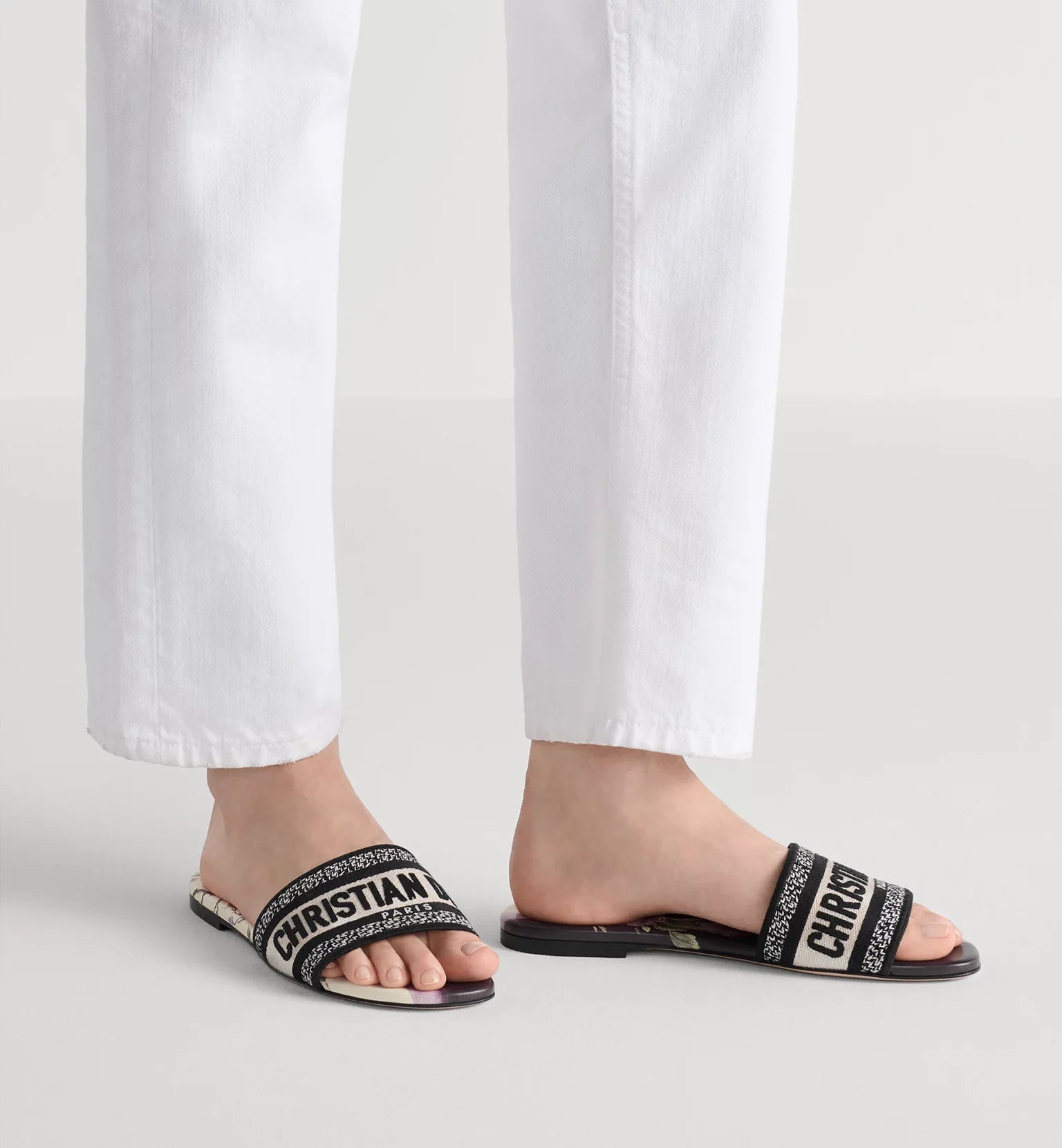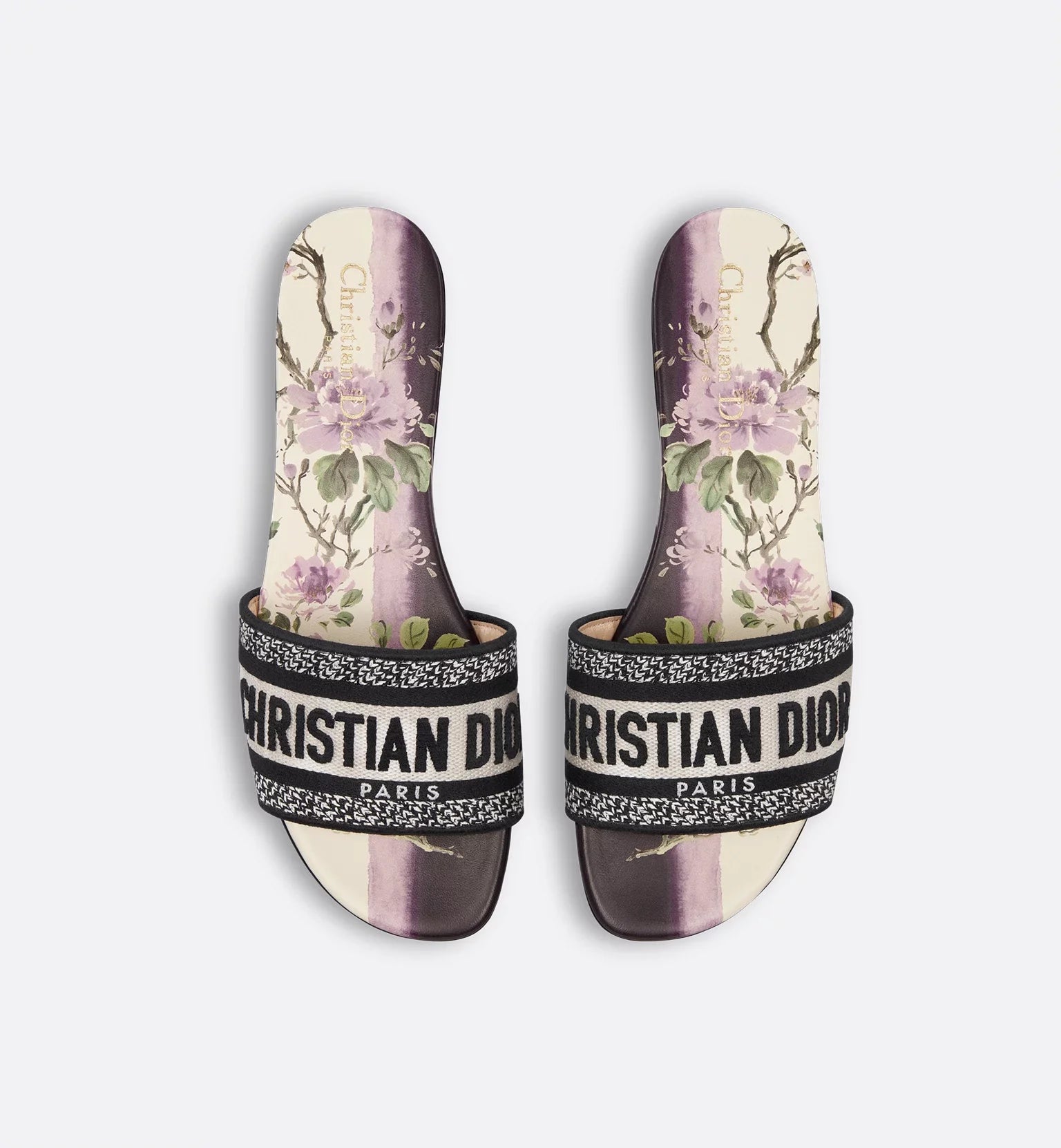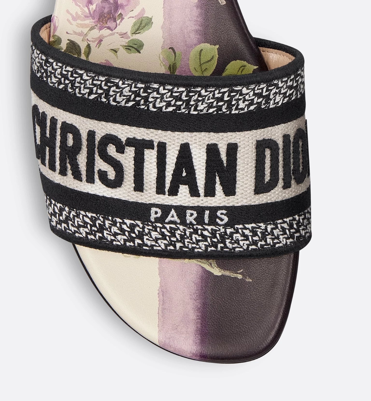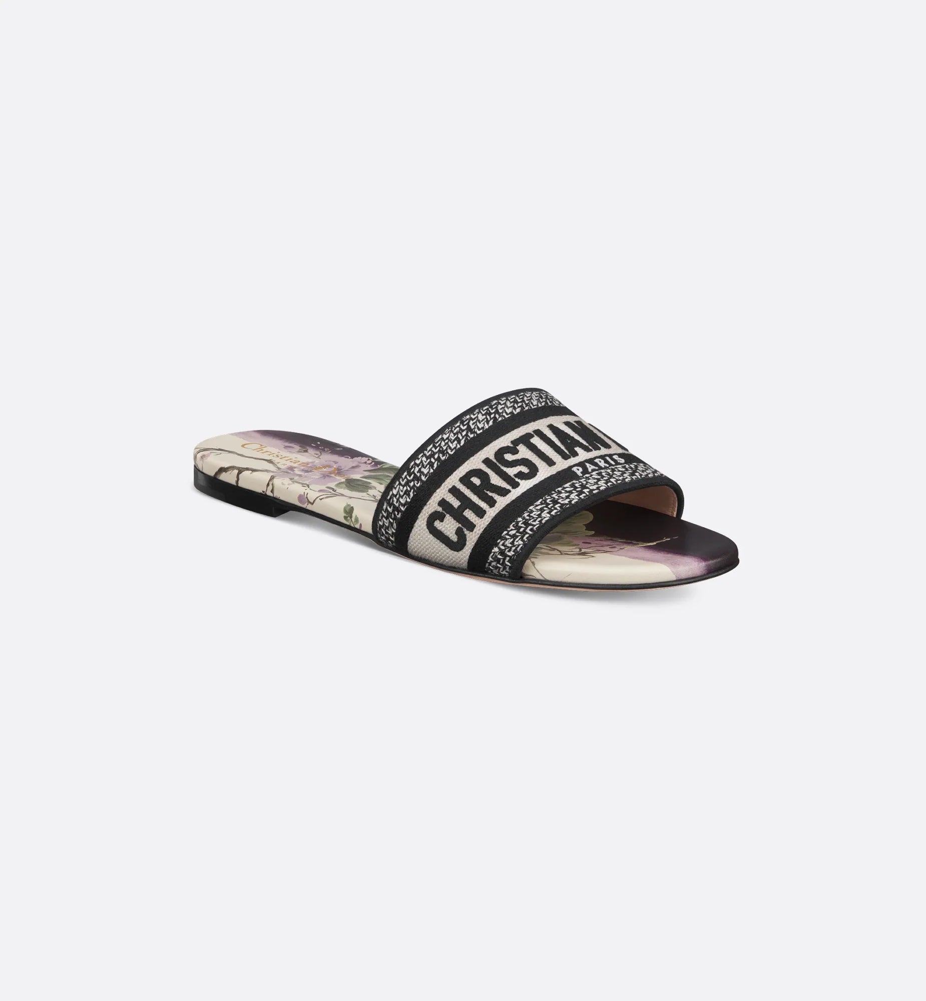 The timeless, hallmark Dway slide features a white and purple Dior Pivoine motif, showcasing a delicate shaded pattern with a flower that symbolizes nobility and prosperity, infused with beauty and strength. The upper is embroidered with the Christian Dior Paris signature for an instantly recognizable touch. The shoe's streamlined silhouette makes it easy to slip on to complete a relaxed look that will pair well with other Dior Pivoine creations from the collection.