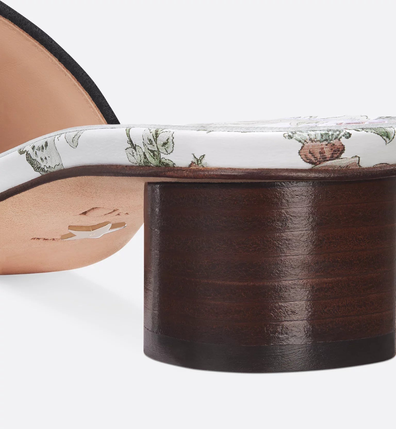 Part of the Dior Lucky capsule, the hallmark Dway heeled slide showcases the sage green Flowers Calendar Allover motif, paying homage to House codes and Mr. Dior's passion for astrology through a bucolic floral design paired with the zodiac signs. The upper is embroidered with the Christian Dior Paris signature for an instantly recognizable touch, while the square toe adds modern appeal. Completed by a 3.5-cm (1.5-inch) cylindrical heel, the slide will bring a contemporary twist to outfits and can be coordinated with other pieces from the Dior Lucky capsule.