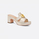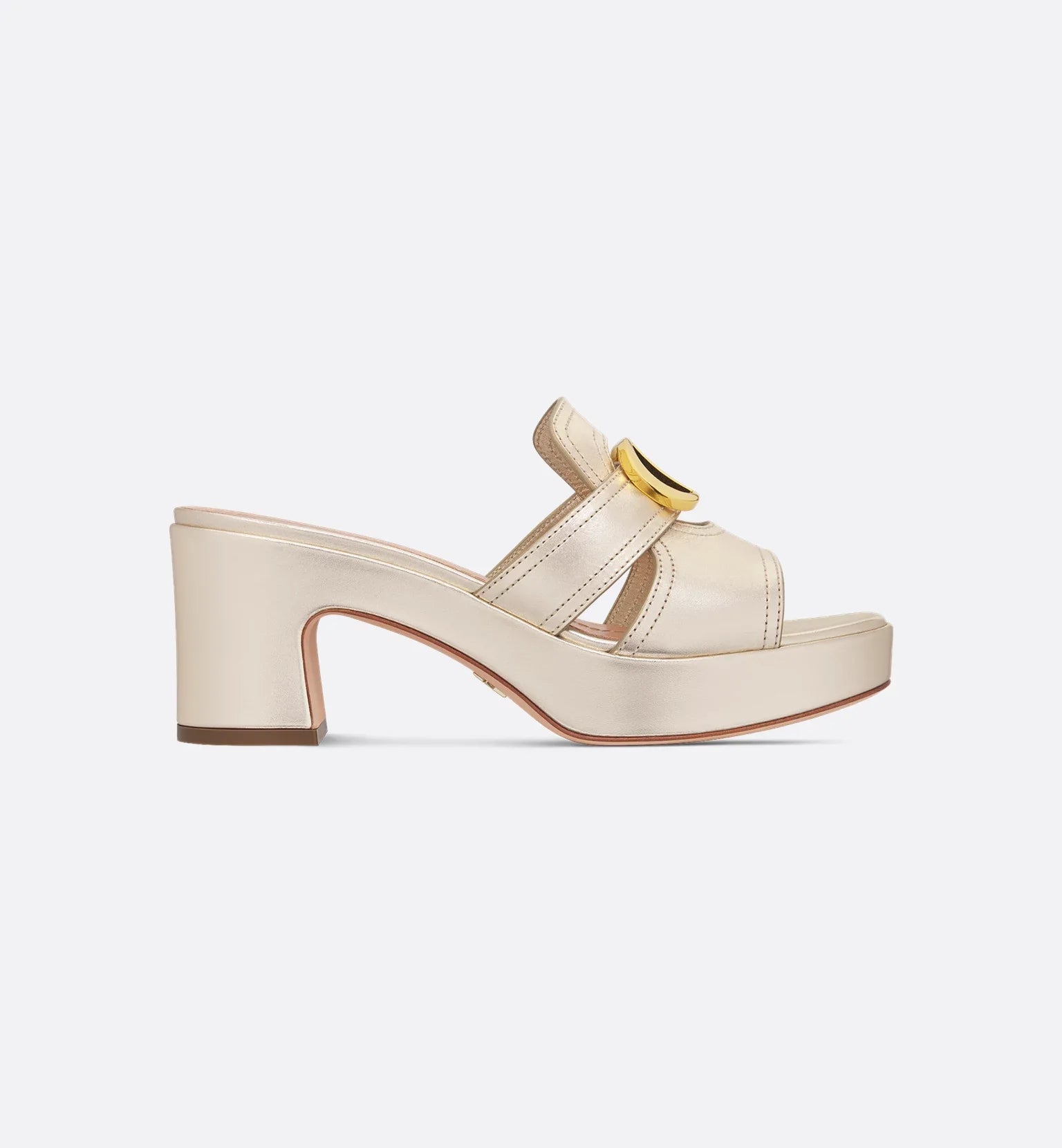 Part of the Dior Or capsule, the 30 Montaigne platform slide is an essential Dior wardrobe piece. The gold-finish metal CD signature highlights the silhouette and elevates the gold-tone laminated calfskin. Featuring timeless lines, with an elegant 7-cm (3-inch) thick heel and 2.5-cm (1-inch) platform in front, the slide will pair effortlessly with a multitude of styles and can be coordinated with other creations from the Dior Or capsule.