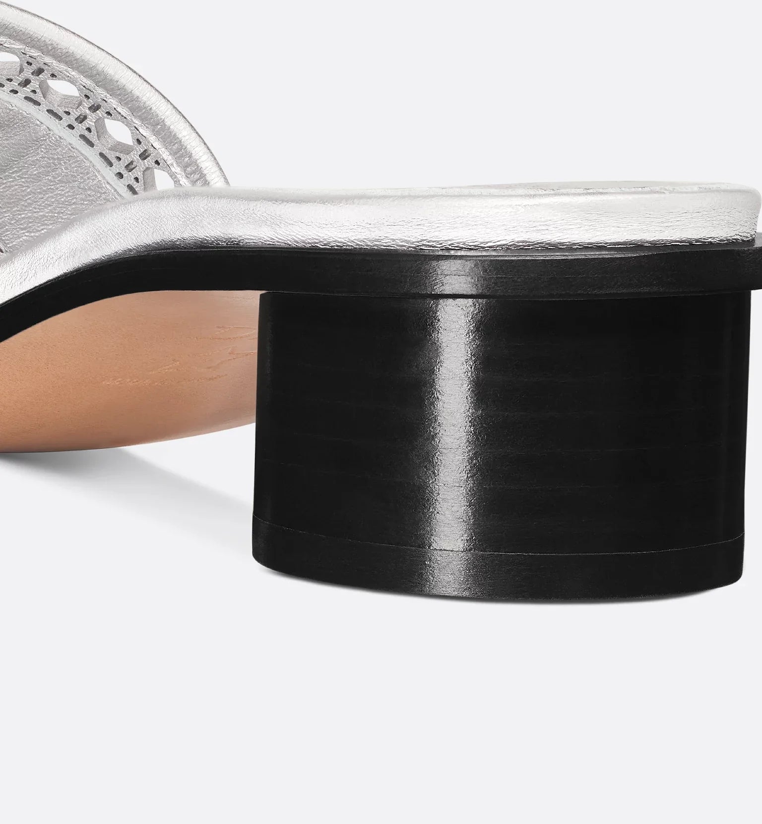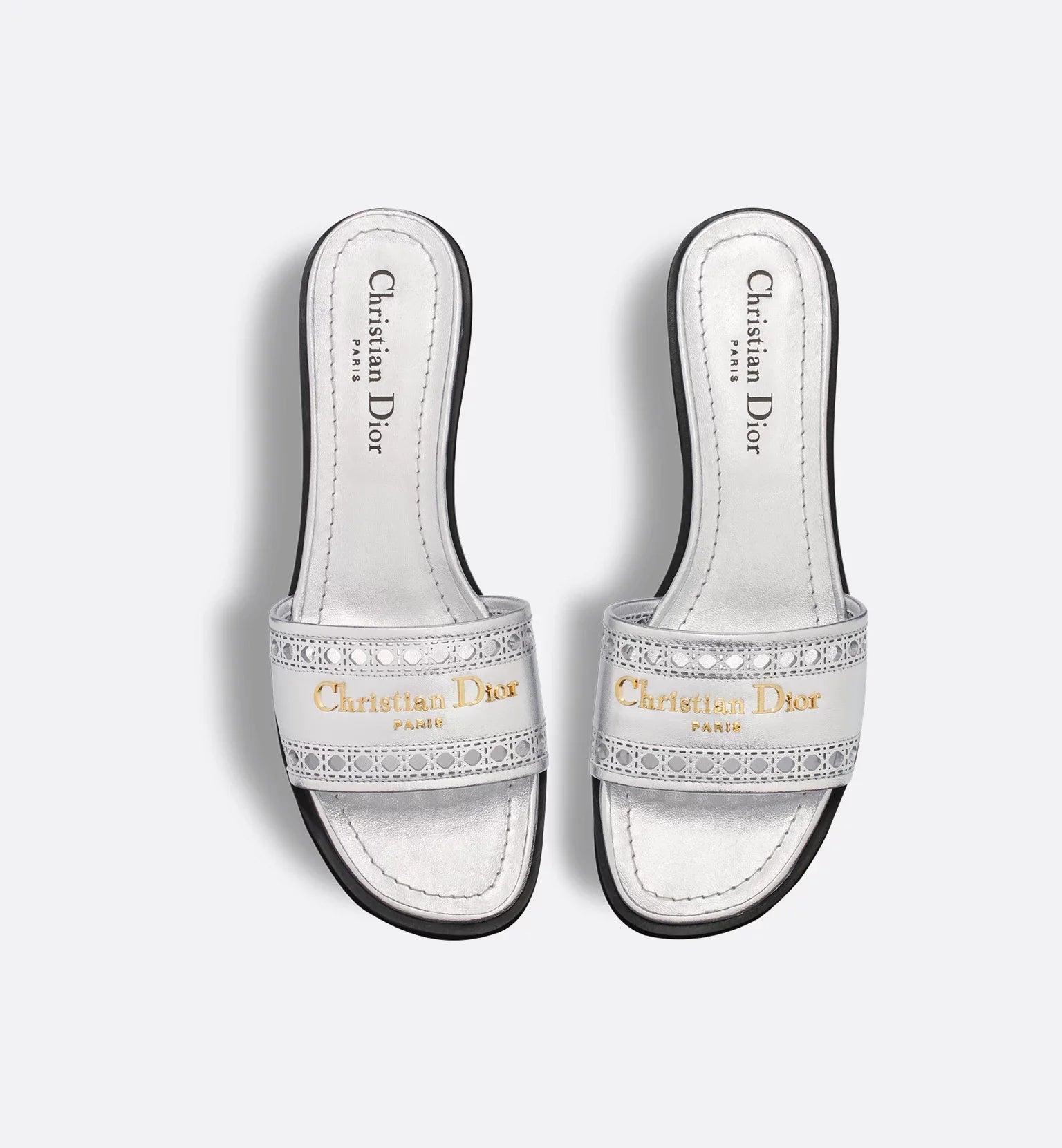 Part of the Dior Or capsule, the D-Lane heeled slide is an emblematic style with a timeless look. The silver-tone openwork Microcannage laminated calfskin upper is adorned with a gold-finish metal Christian Dior Paris signature, adding an instantly recognizable touch. The padded insole offers ultimate comfort while the 3.5-cm (1.5-inch) cylindrical heel accentuates its elegant appeal. The shoe can be coordinated with other creations from the Dior Or capsule.