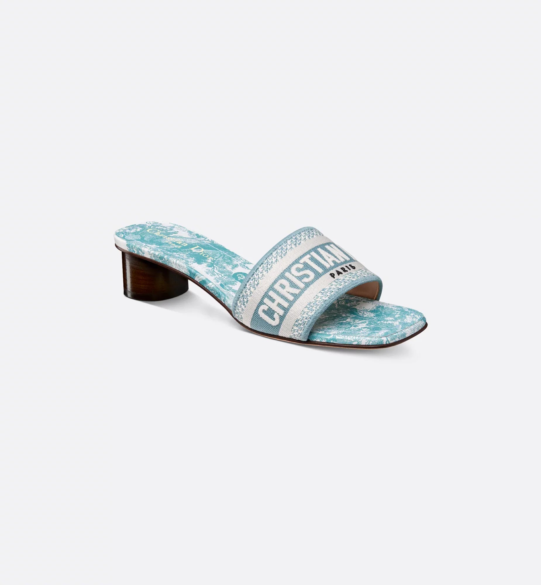 Part of the Dioriviera capsule, the hallmark Dway heeled slide honors the iconic Toile de Jouy Sauvage motif. The sky blue upper is embroidered with the Christian Dior Paris signature for an instantly recognizable touch, while the square toe adds modern appeal. Completed by a 3.5-cm (1.5-inch) cylindrical heel, the slide will bring a contemporary twist to outfits and can be coordinated with other pieces from the Dioriviera capsule.
