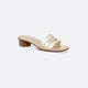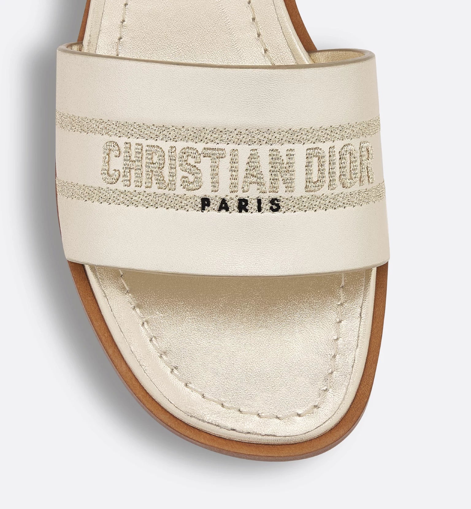 The Dway heeled slide revisits a hallmark and timeless design. The laminated calfskin upper is embroidered with the Christian Dior Paris signature in gold-tone metallic thread, lending an instantly recognizable touch. Completed by a 3.5-cm (1.5-inch) cylindrical heel and softly squared toe, the slide will elevate outfits with a modern touch.