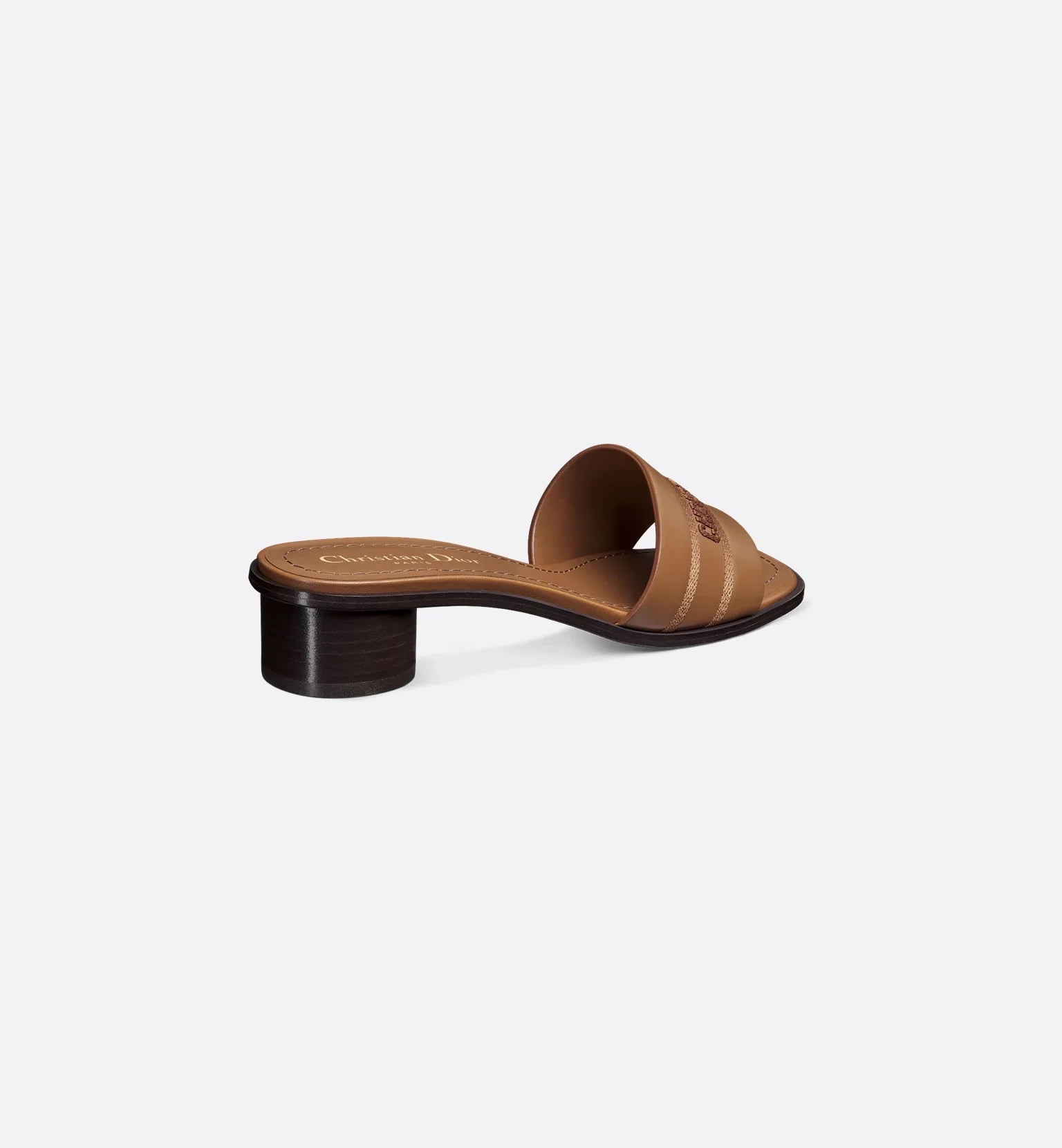The Dway heeled slide revisits a hallmark and timeless design. The camel calfskin and cotton upper is embroidered with the Christian Dior Paris signature, lending an instantly recognizable touch. Completed by a 3.5-cm (1.5-inch) cylindrical heel and softly squared toe, the slide will elevate outfits with a modern touch.