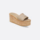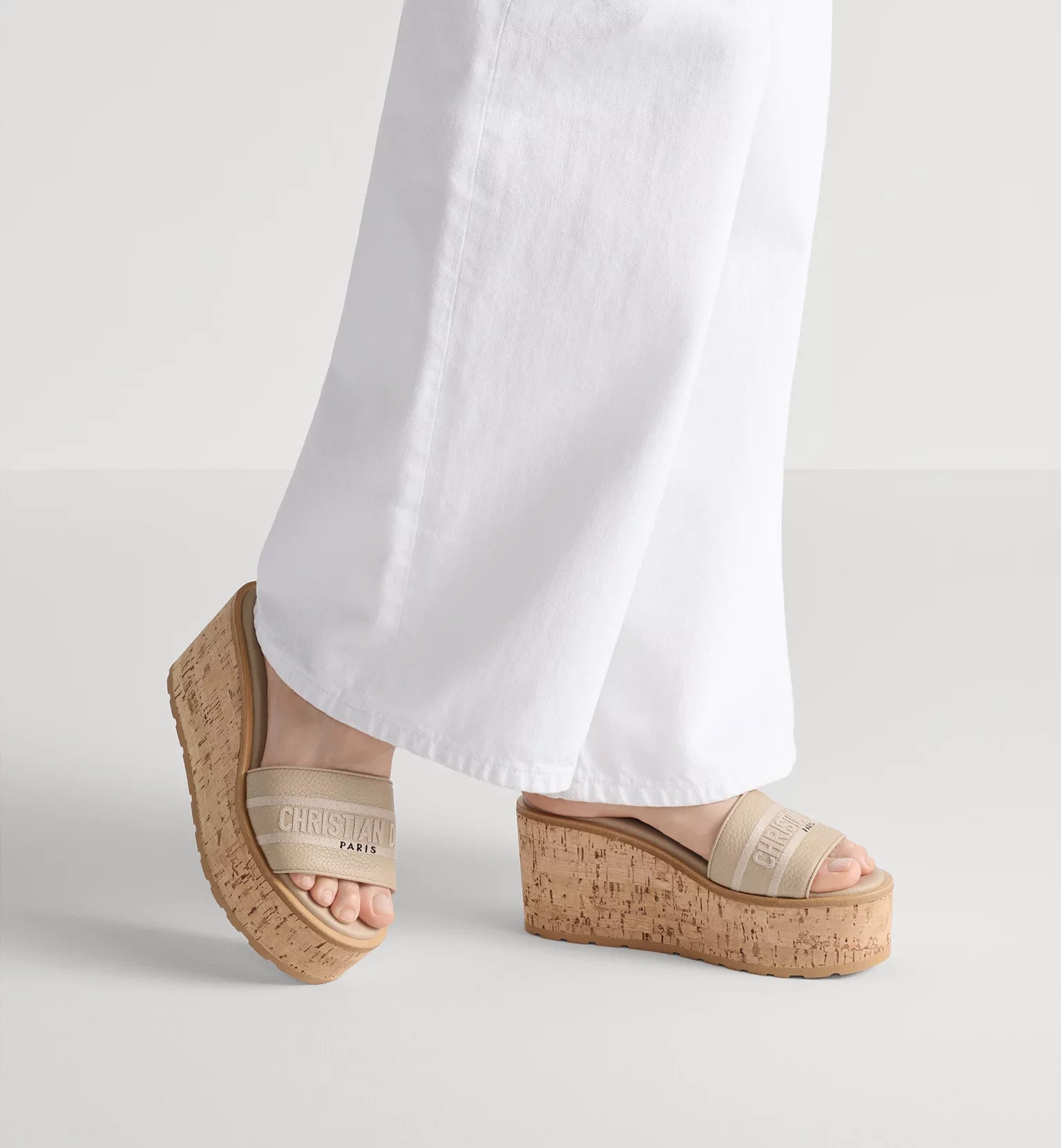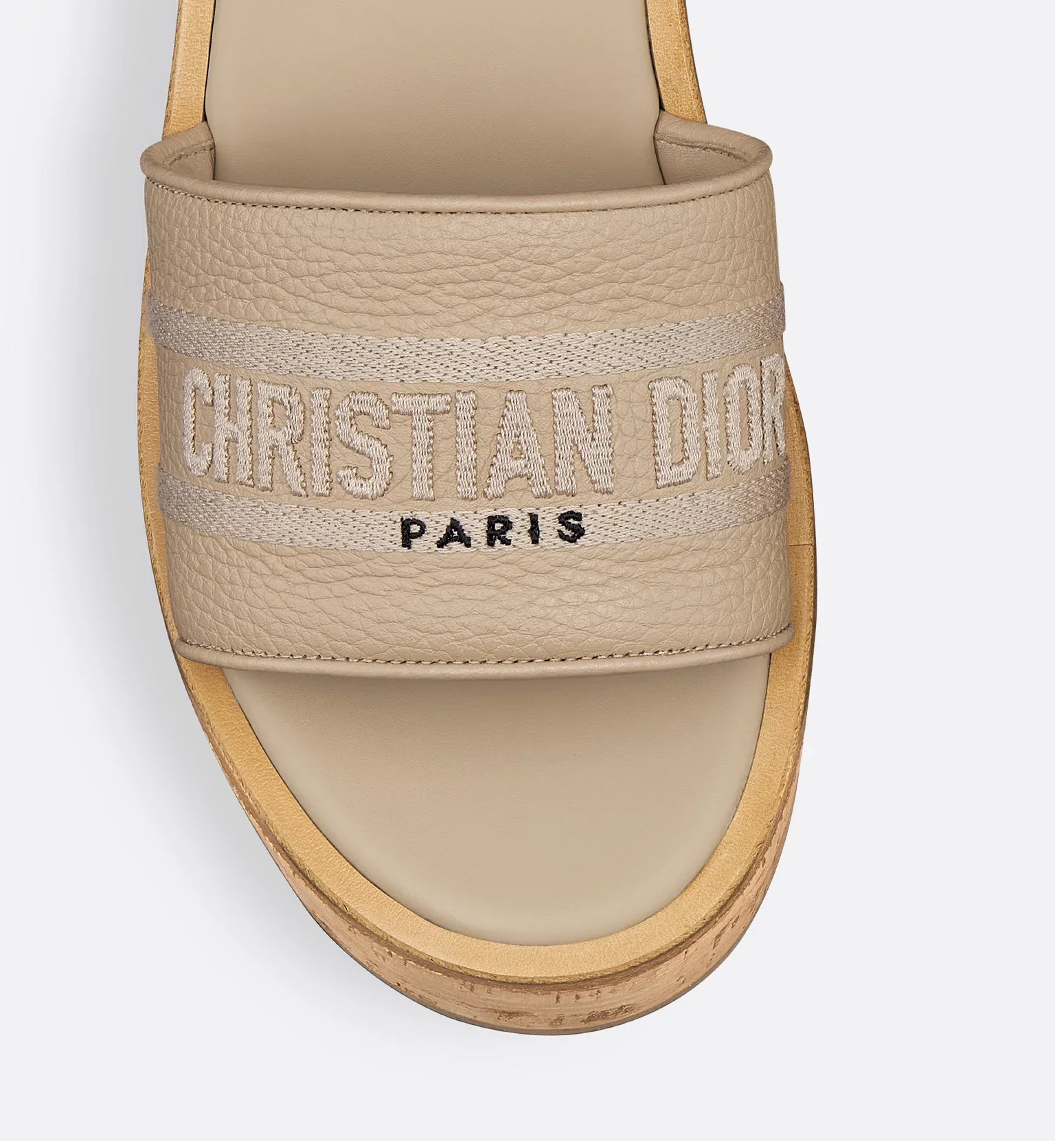The Dway platform slide showcases a modern and elegant look. The powder beige grained calfskin upper is embroidered with a tonal Christian Dior Paris signature for an instantly recognizable touch. Completed by an ultralightweight cork platform and padded insole for optimum comfort, the shoe will enhance any of the season's outfits.