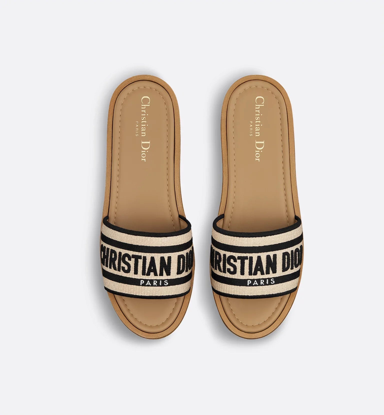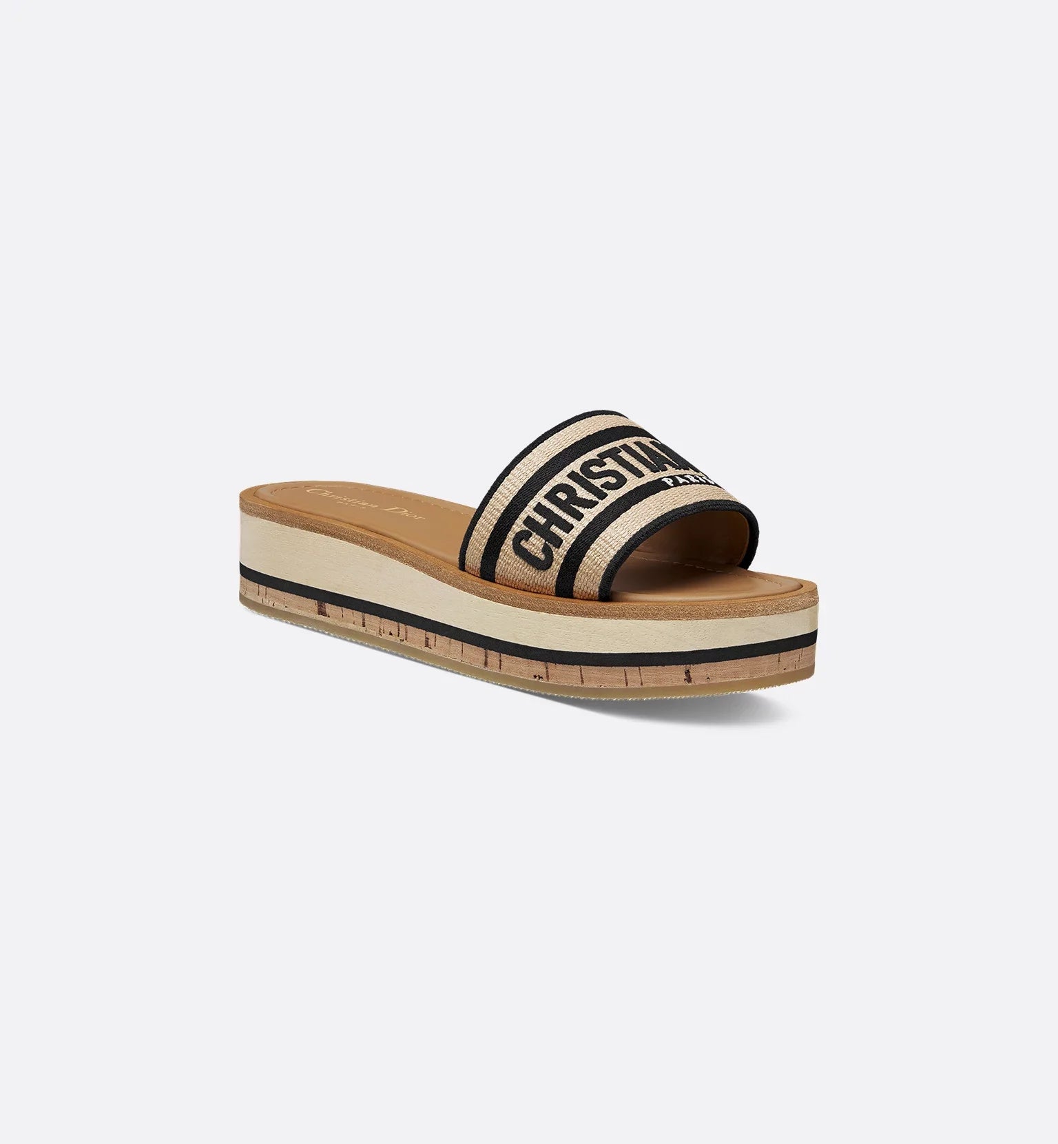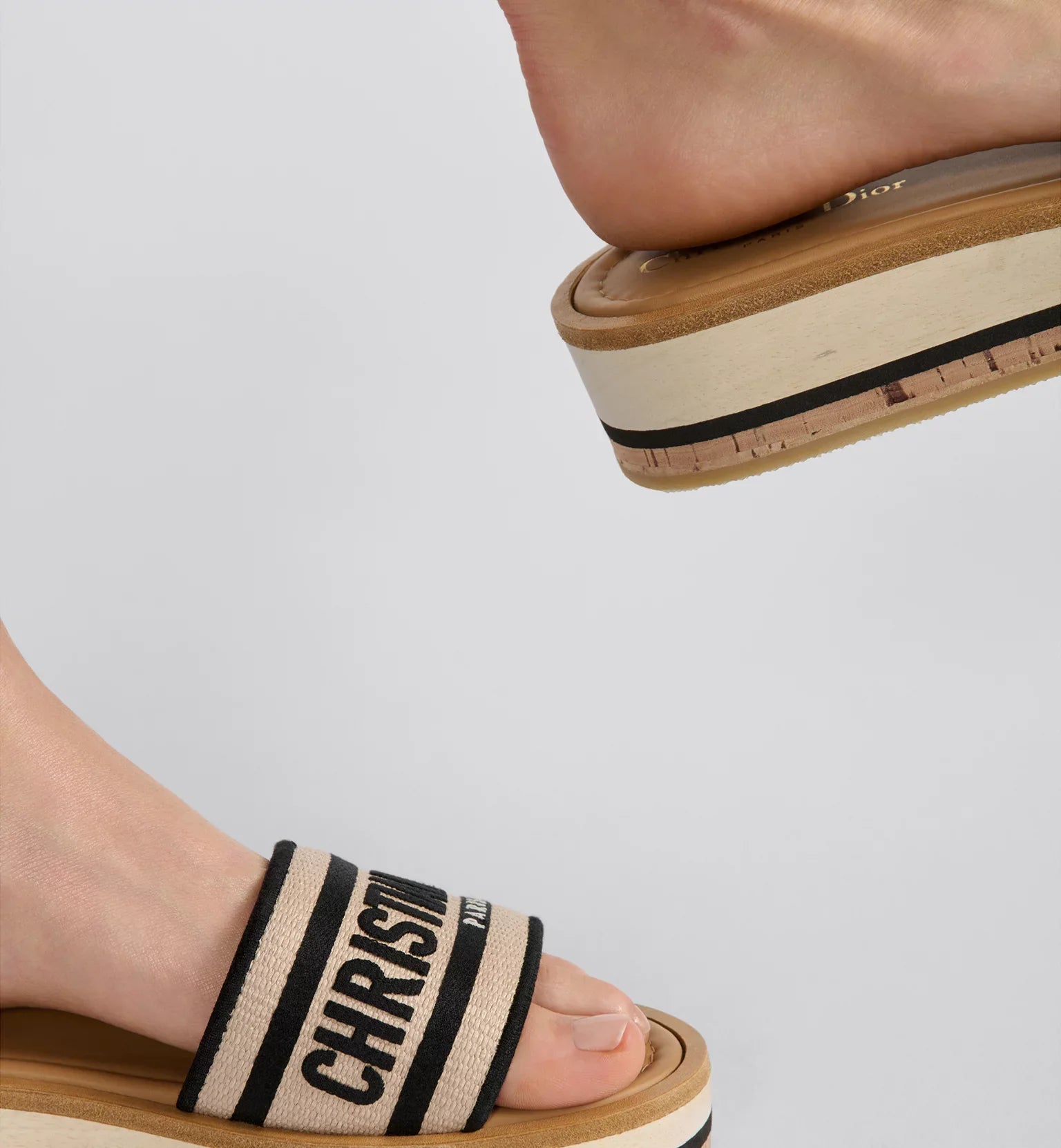 The Dway platform slide showcases a modern and elegant look. The powder beige grained calfskin upper is embroidered with a tonal Christian Dior Paris signature for an instantly recognizable touch. Completed by an ultralightweight cork platform and padded insole for optimum comfort, the shoe will enhance any of the season's outfits.