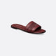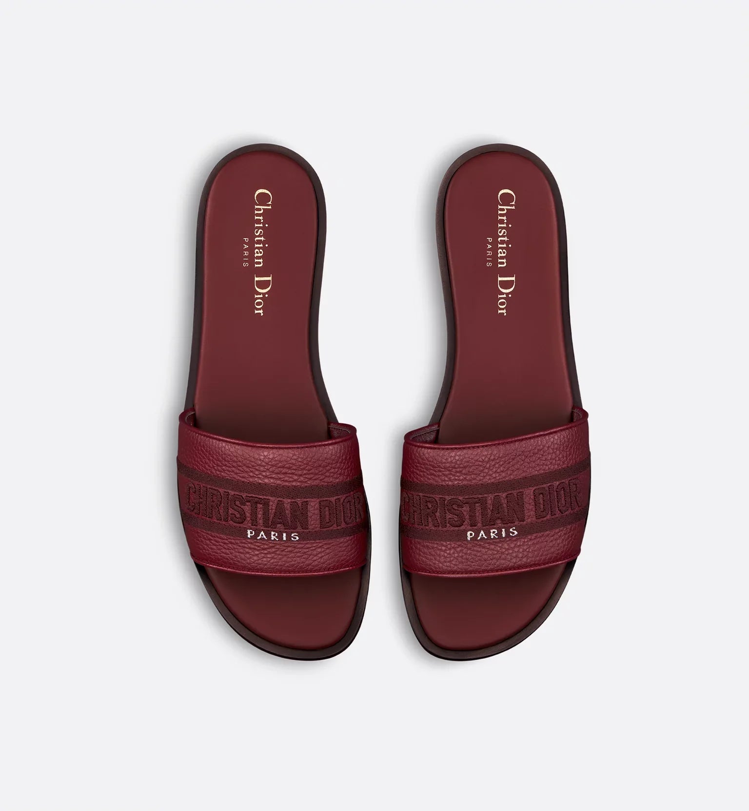 The Dway slide revisits a timeless and emblematic silhouette. The burgundy grained calfskin upper is embroidered with a tonal Christian Dior Paris signature for an instantly recognizable touch, while the padded insole offers optimum comfort. Its streamlined design allows it to be easily slipped on to complete a laid-back outfit.