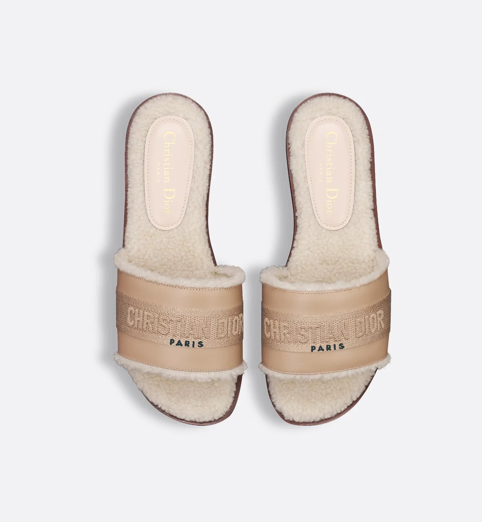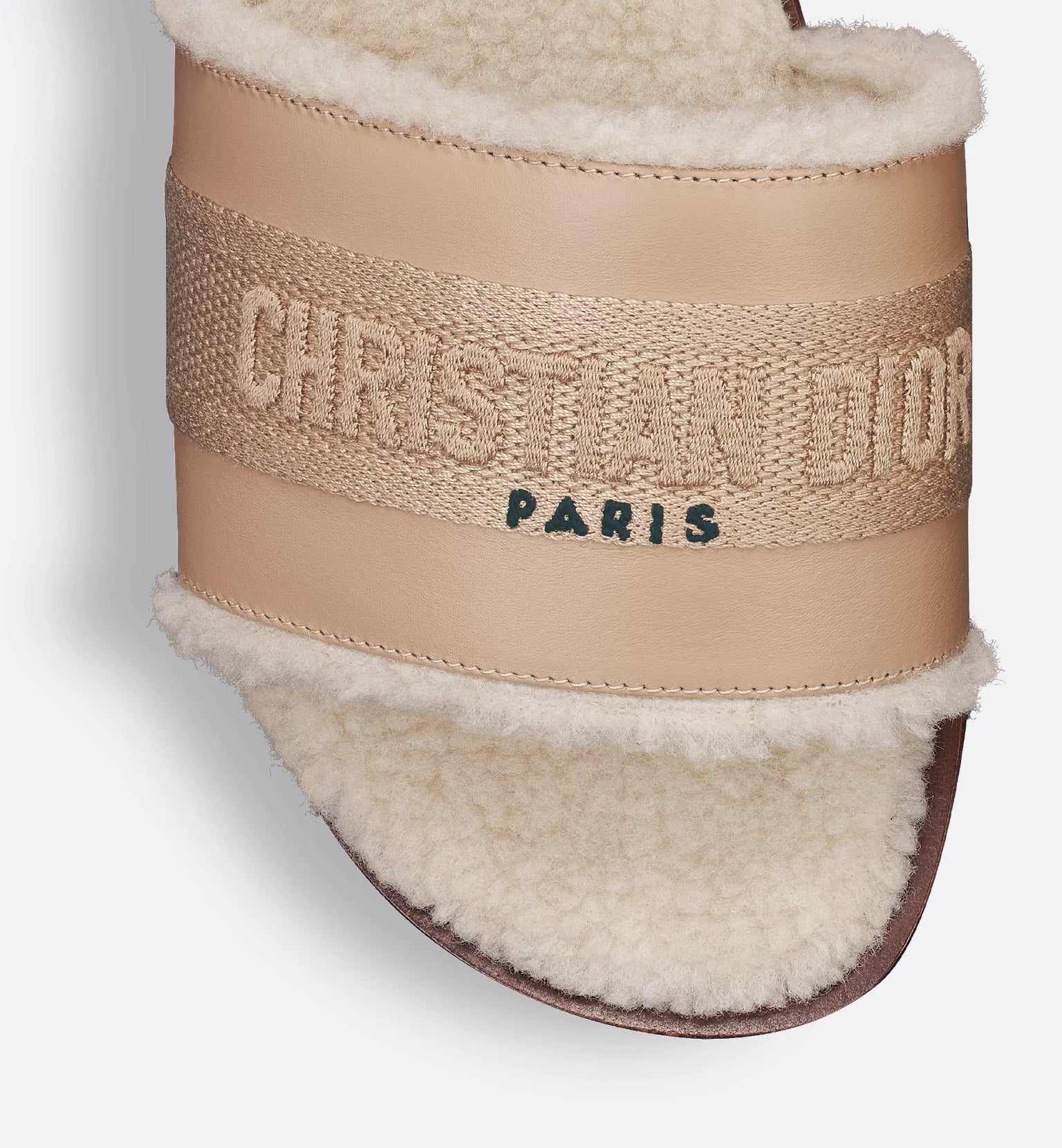 The Dway slide has a timeless and emblematic silhouette. The slide's natural raffia and deep blue cotton upper features an embroidered Christian Dior Paris signature for an unmistakable touch. The streamlined design slips on easily and offers effortless style.