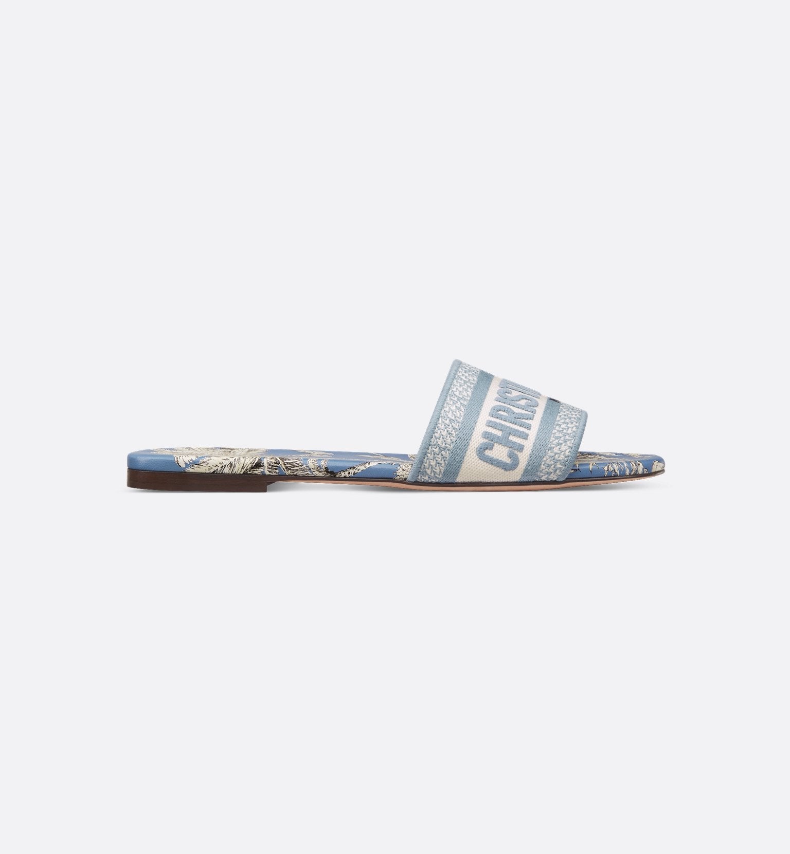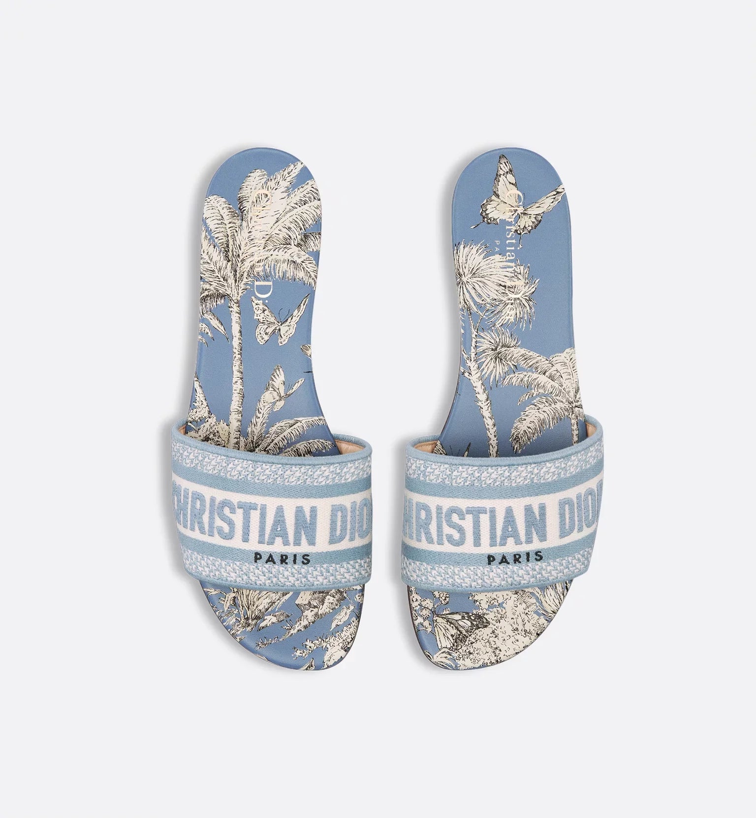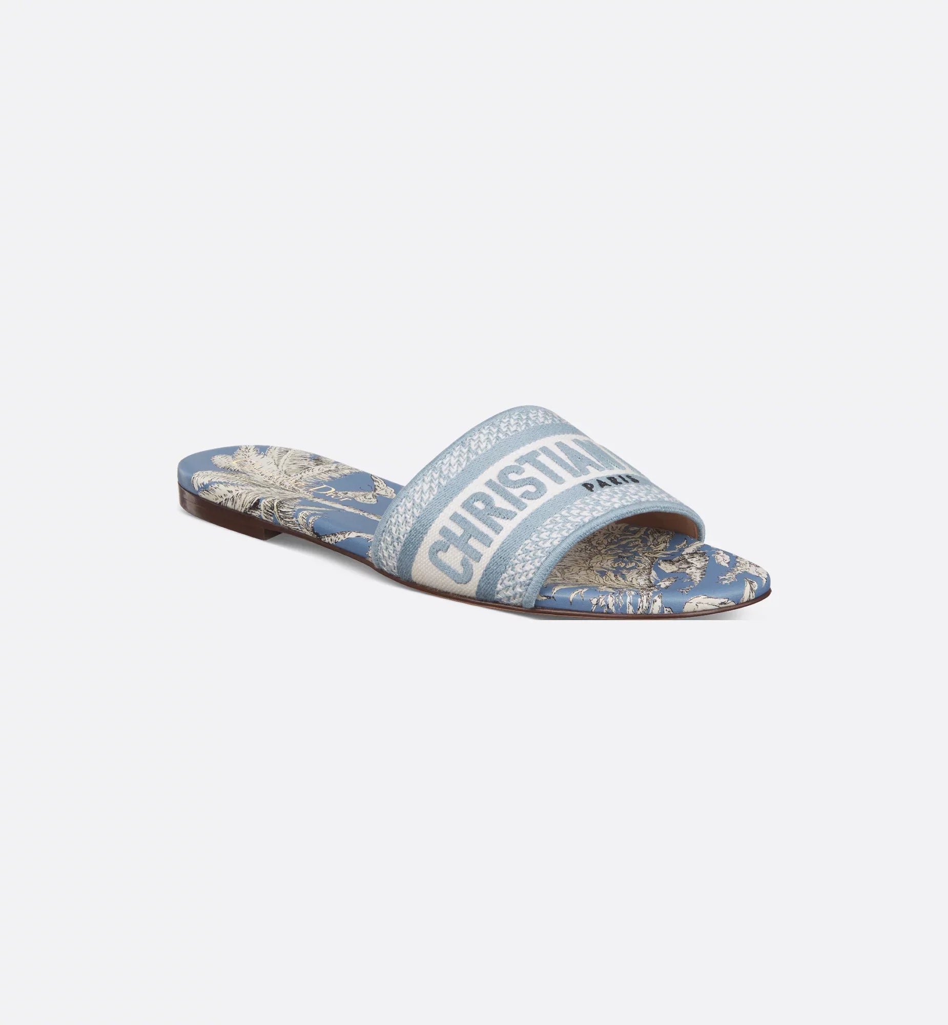 Part of the Dioriviera capsule, the Dway slide is a hallmark and timeless style showcasing Pietro Ruffo's beige and white Toile de Jouy Palms motif, capturing the beauty of nature with a vibrant jungle scene populated by diverse wildlife. The upper is embroidered with the Christian Dior Paris signature, adding an instantly recognizable touch. Its streamlined silhouette makes it easy to slip on to complete a relaxed look that will pair well with other Dioriviera creations from the capsule.
