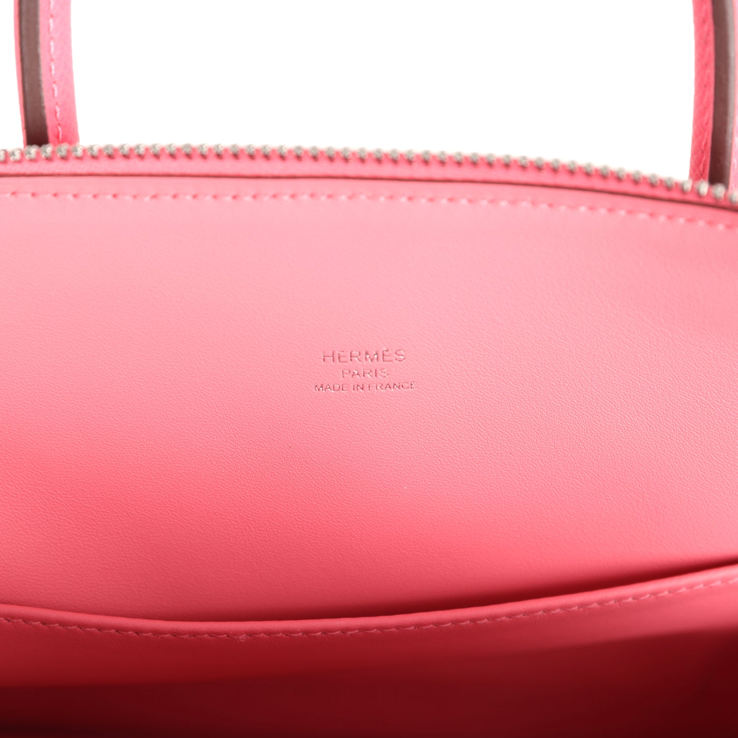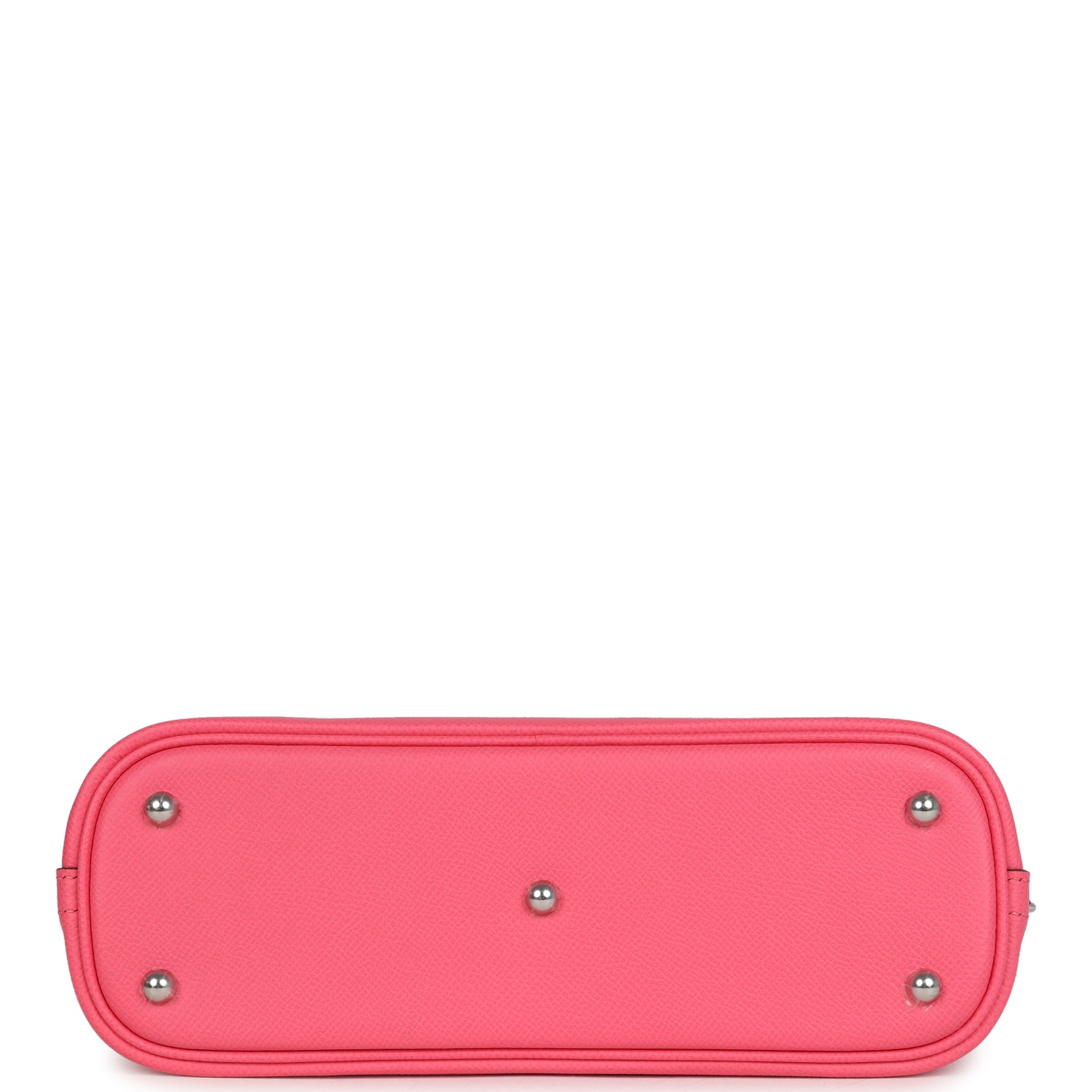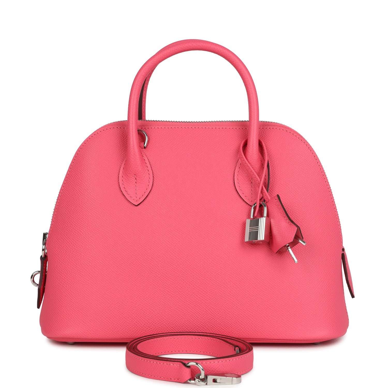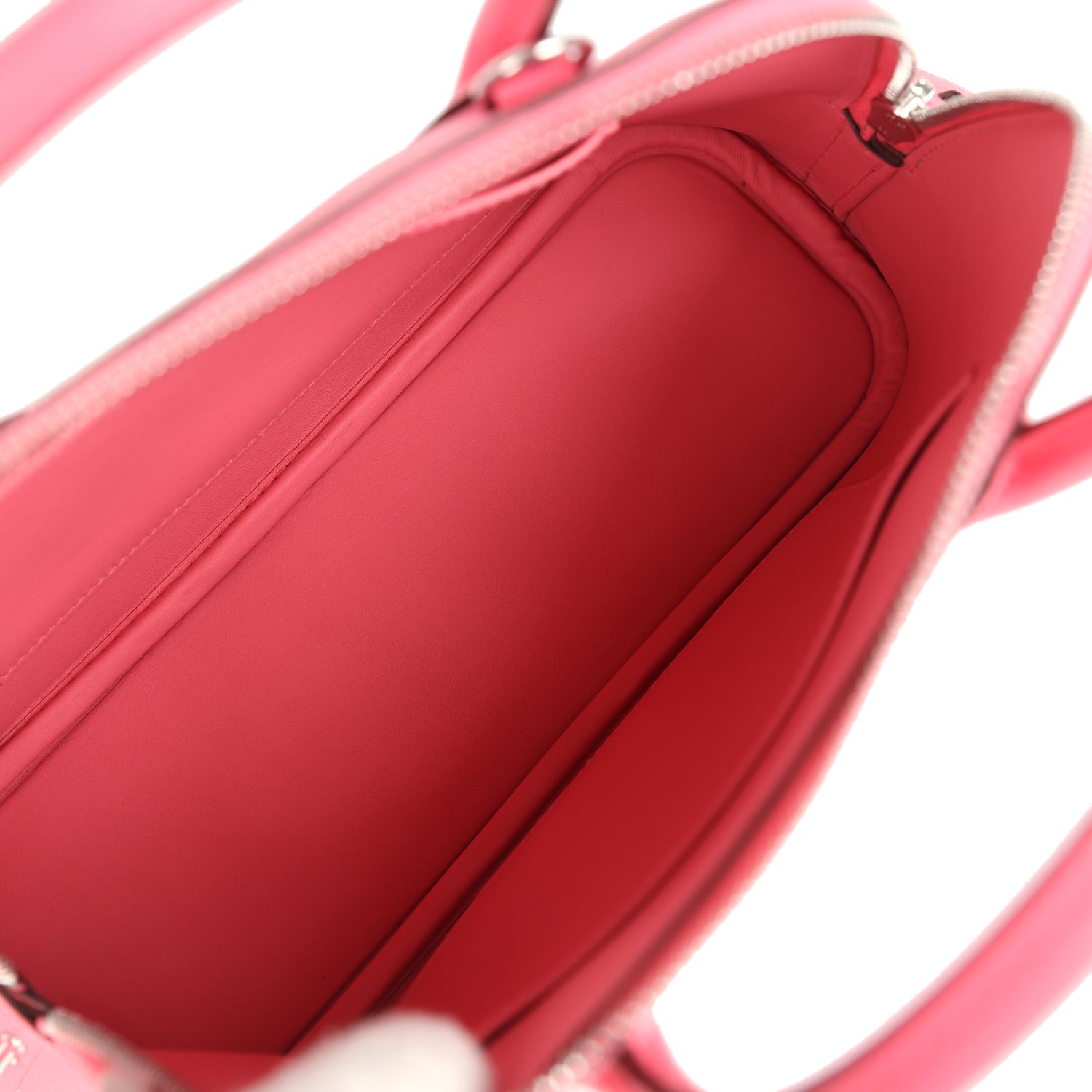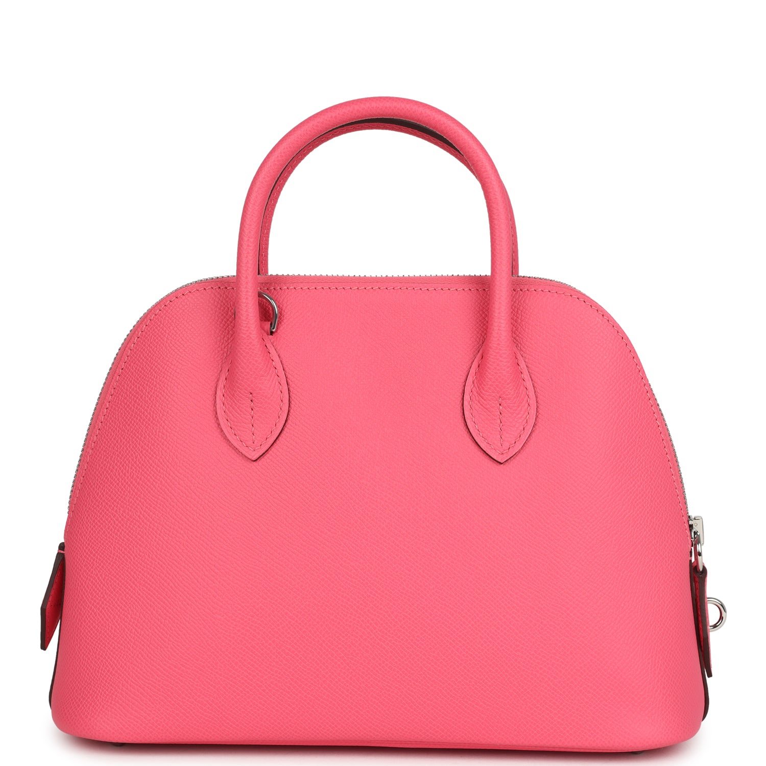 This 1923 Bolide is in Rose Azalee epsom leather with palladium hardware and has tonal stitching, a top zipper closure, double rolled handles and removable shoulder strap.