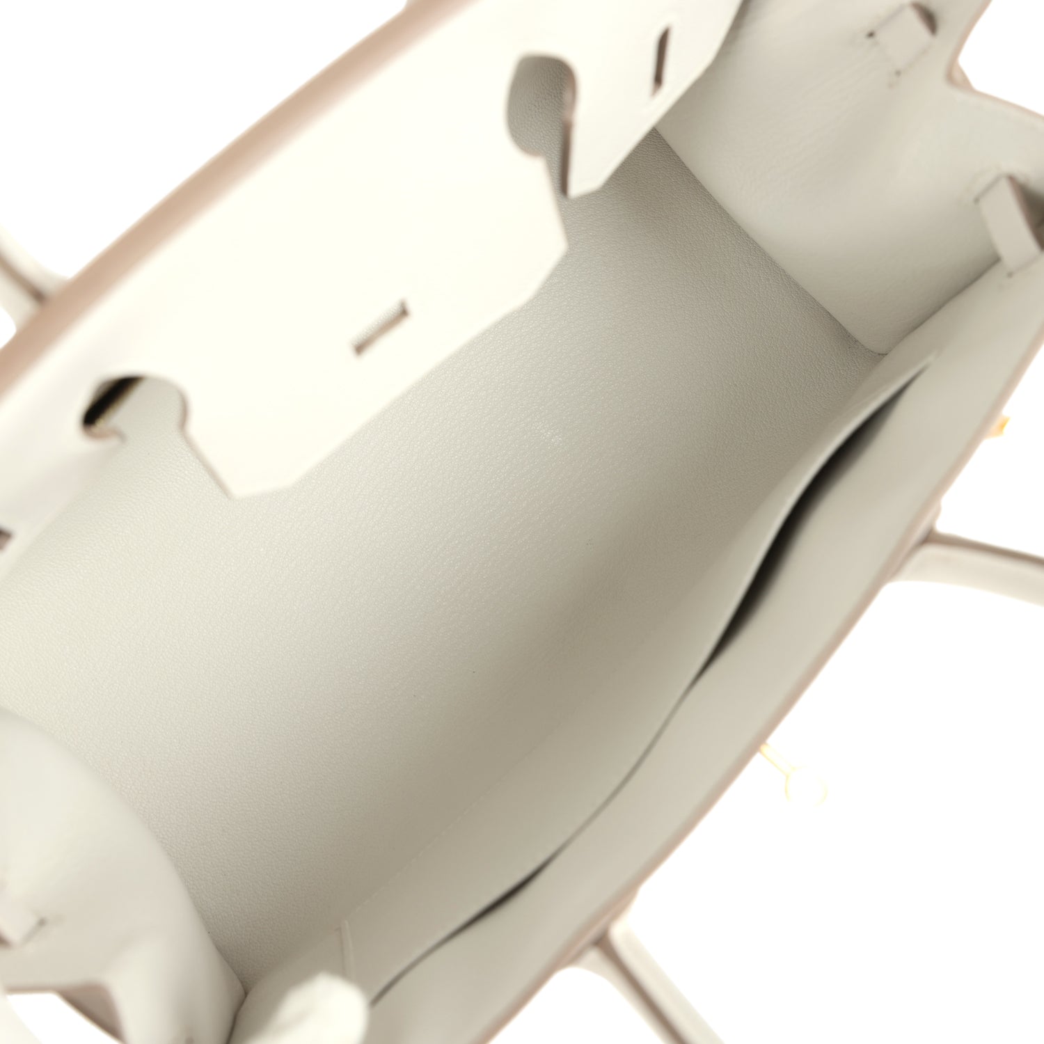 The interior is lined with Gris Pale chevre leather and has one zip pocket with an engraved zipper pull and an open pocket on the opposite side.