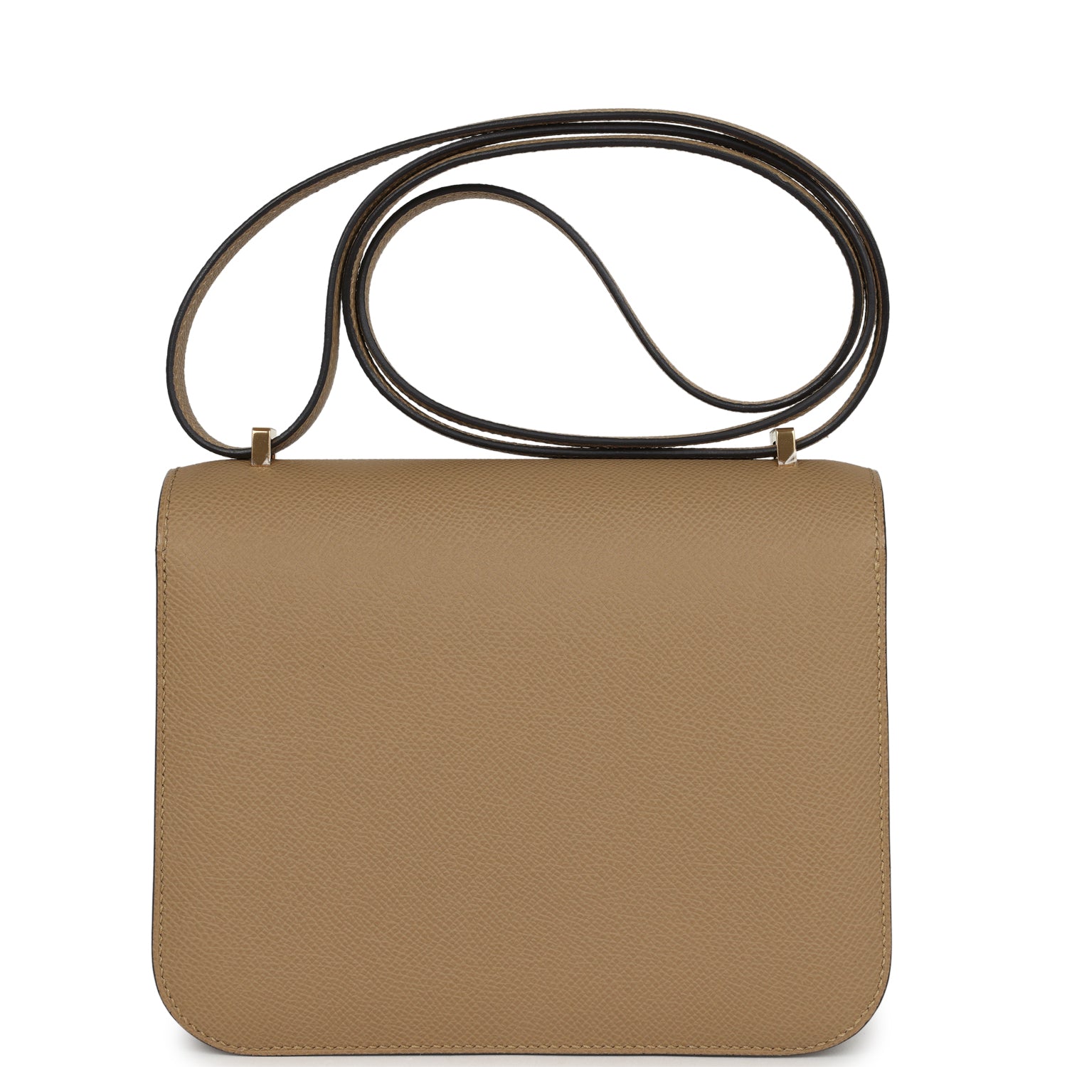 This Constance 1-18 is in Poussiere epsom leather with gold hardware and has tonal stitching, a metal "H" snap lock closure and adjustable shoulder strap.