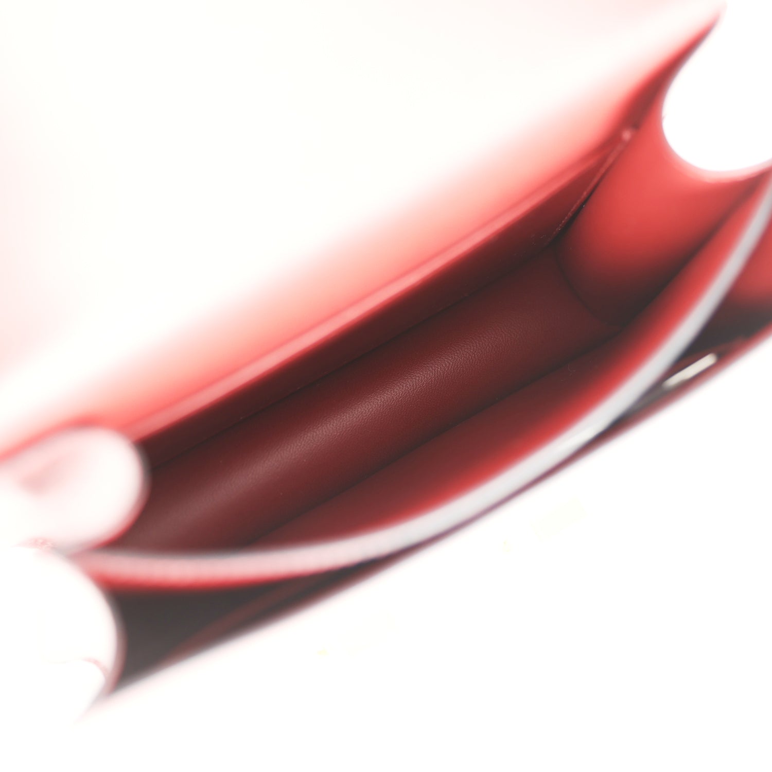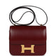 This Constance 1-18 is in Rouge H Box calfskin leather with gold hardware and has tonal stitching, a metal "H" snap lock closure and adjustable shoulder strap.