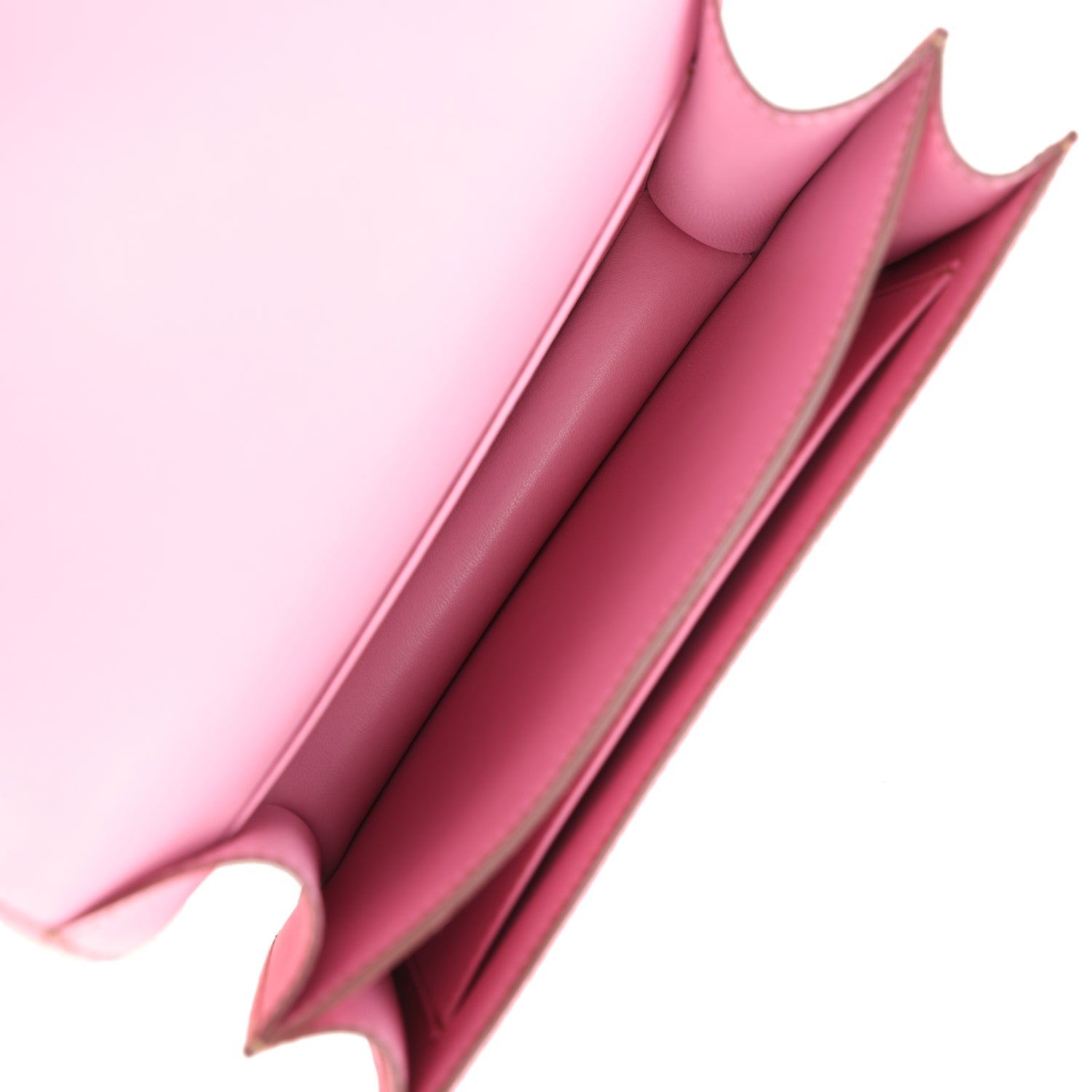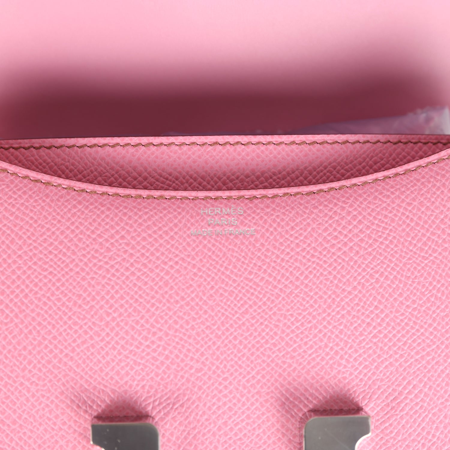 This Constance is in Bubblegum "5P" Pink epsom leather with palladium hardware and has contrast stitching, a metal "H" snap lock closure and an adjustable shoulder strap.