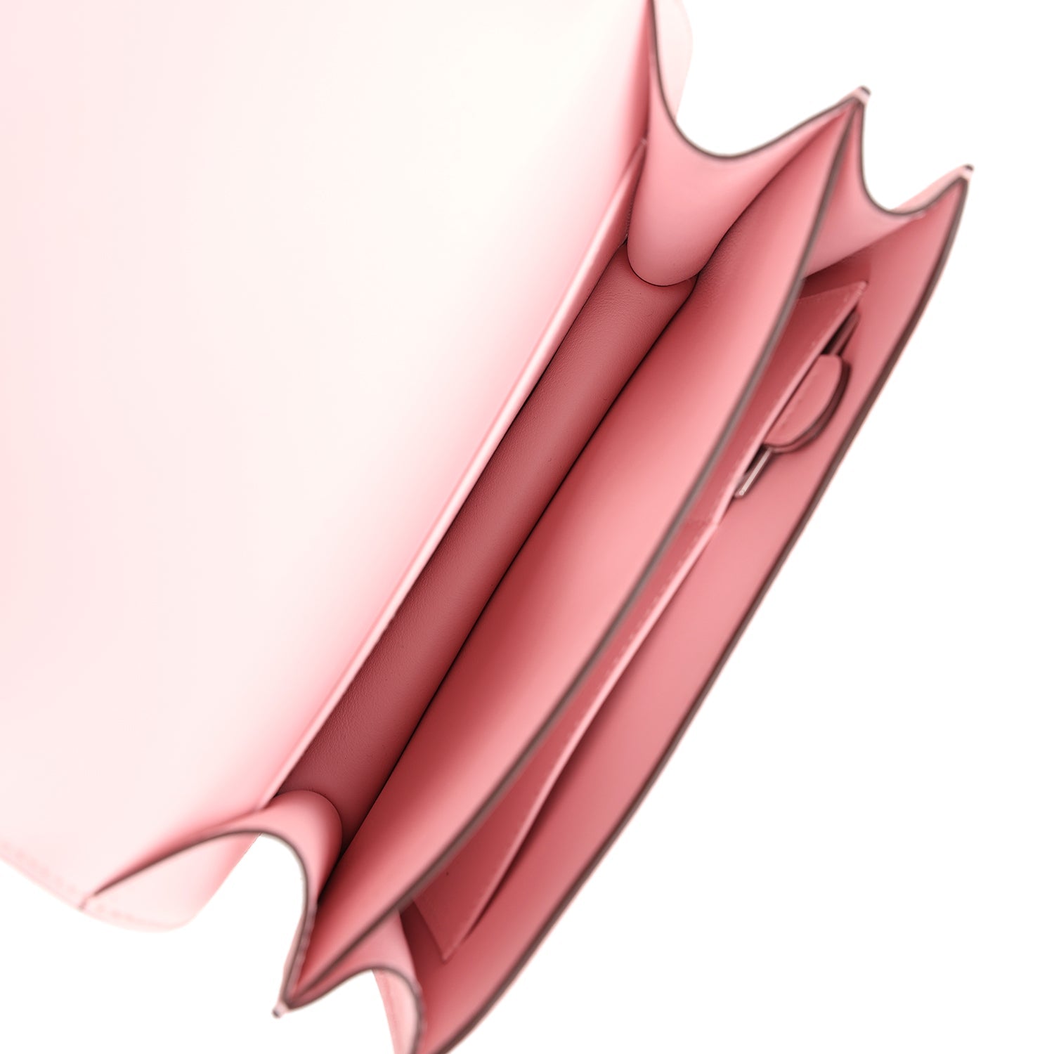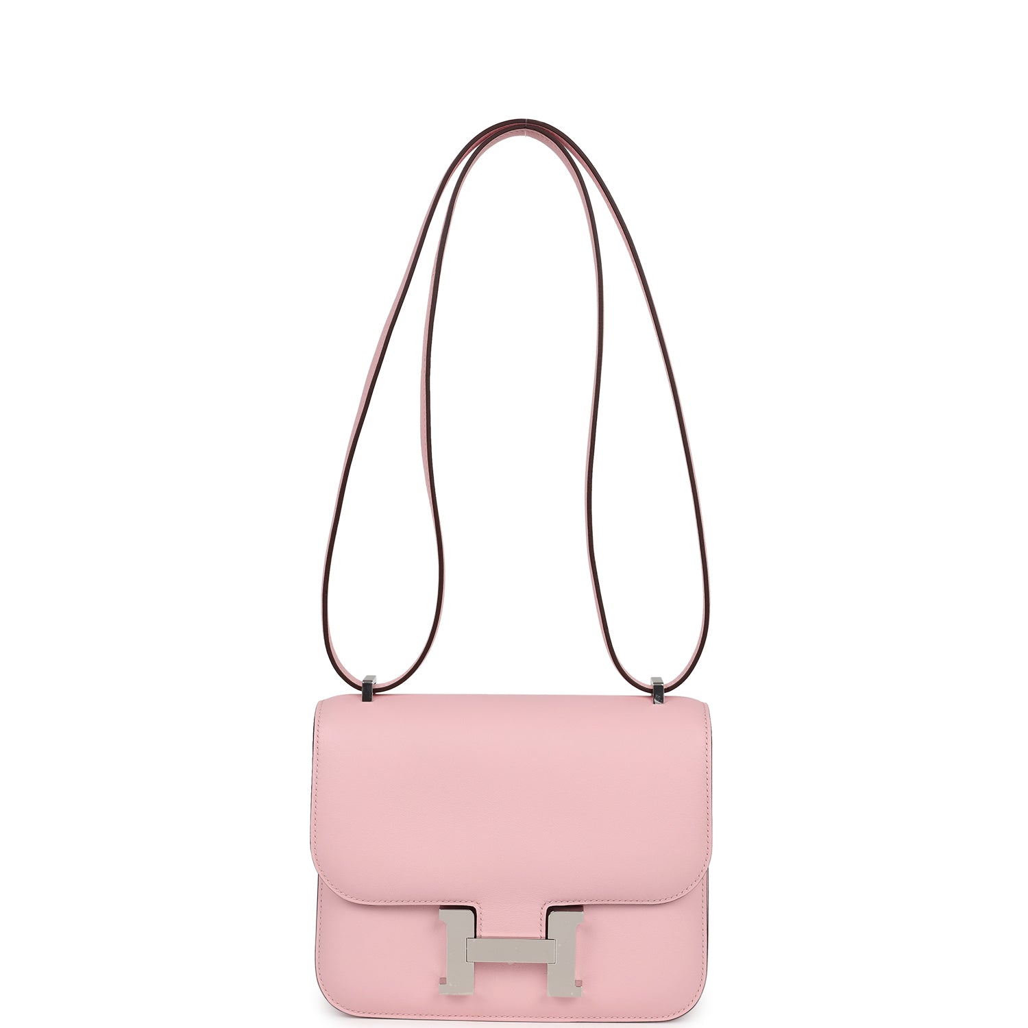 This Constance 18 is in Rose Sakura swift leather with palladium hardware, tonal stitching, a metal "H" snap lock closure and adjustable shoulder strap.