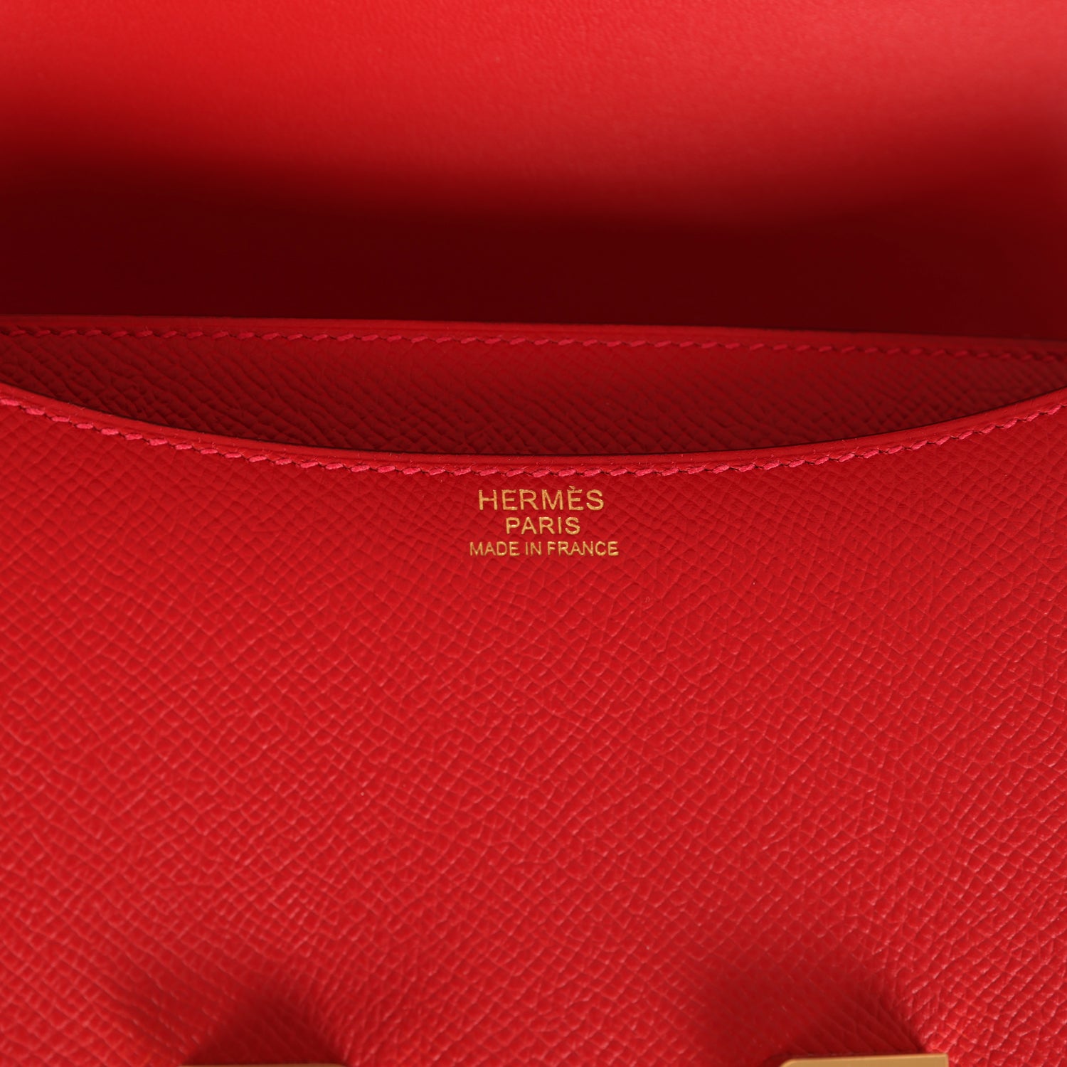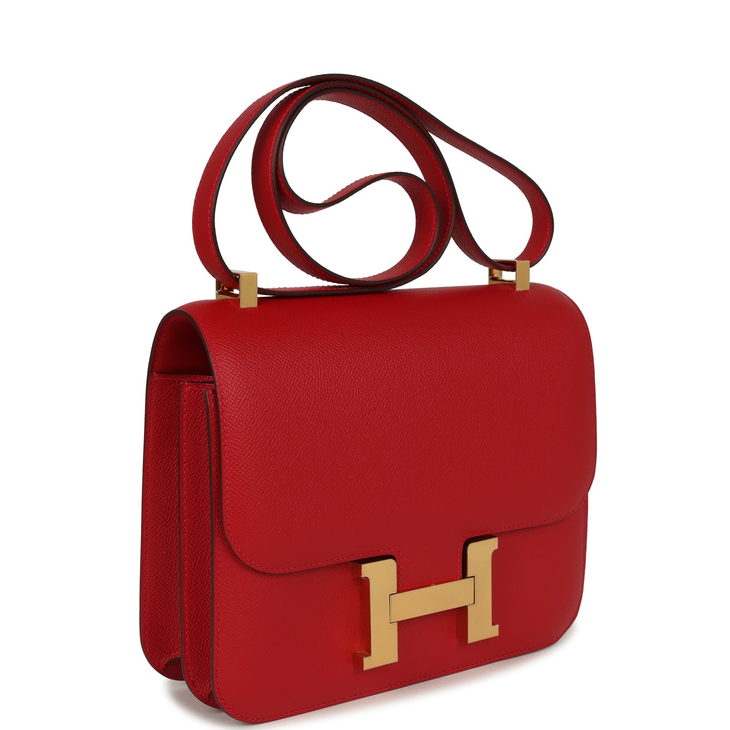 This Constance is in Rouge Casaque epsom leather with gold hardware and features tonal stitching, a "H" snap lock closure, and an adjustable shoulder strap.