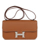 This Constance Elan is in Gold epsom leather with palladium hardware, featuring contrast white stitching, metal "H" snap closure, and an adjustable strap.