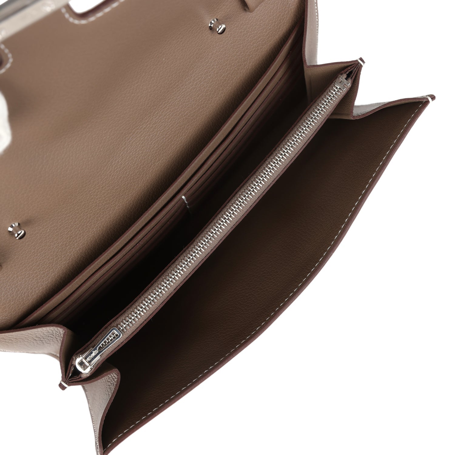 The interior is lined with Etoupe evercolor leather and two main compartments with six credit card slots and a zippered center compartment with H lock pull.