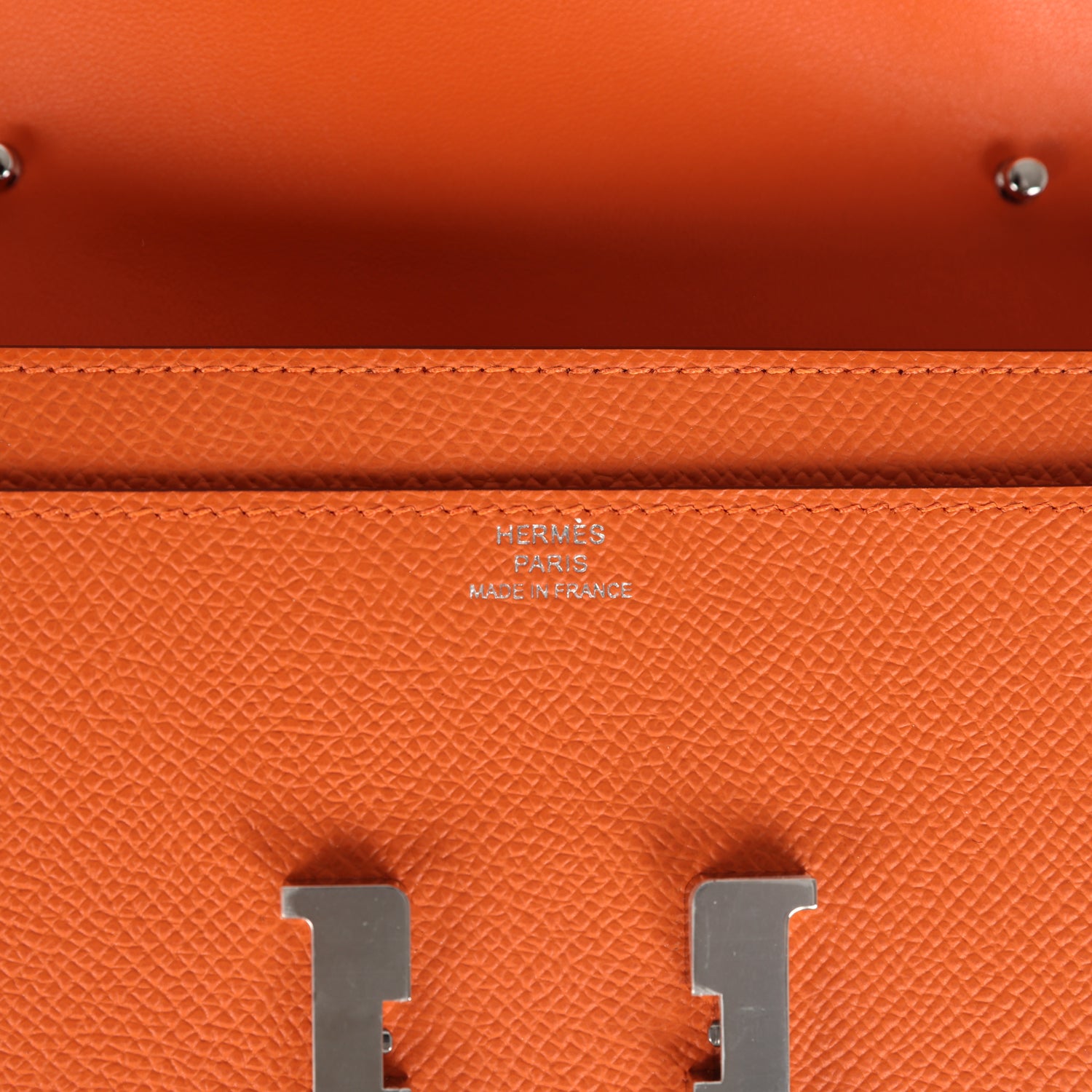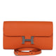 This Constance Wallet To Go is in Orange epsom leather with Palladium hardware and has tonal stitching, metal "H" snap lock closure, open front compartment and removable crossbody strap.