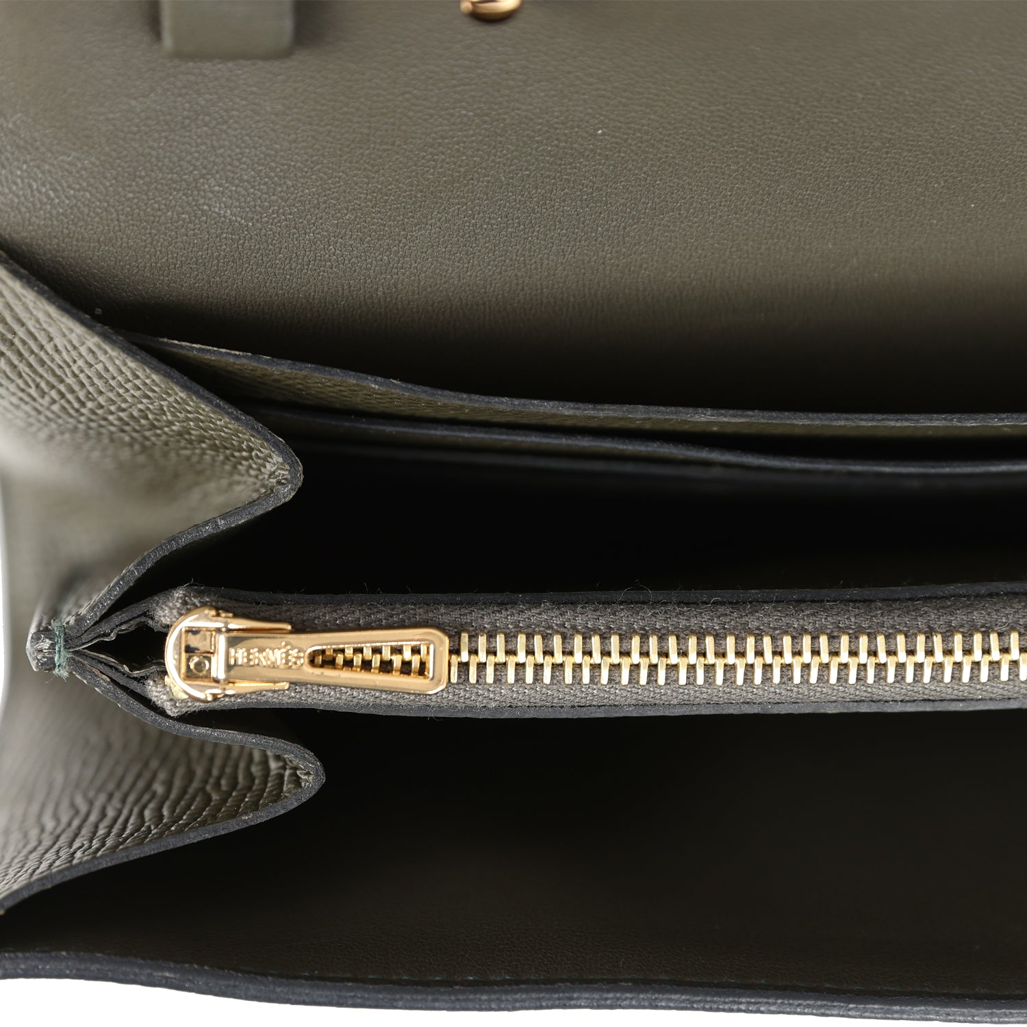 The interior is lined with Vert De Gris epsom leather and two main compartments with six credit card slots and a zippered center compartment with H lock pull.