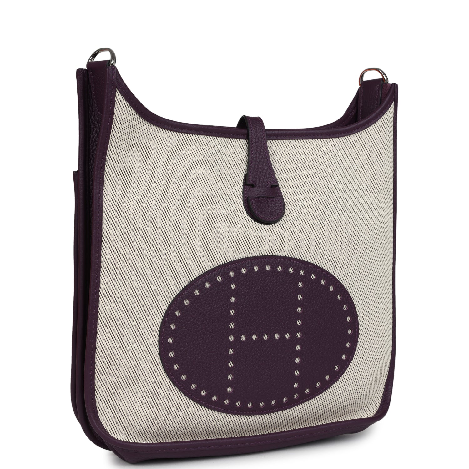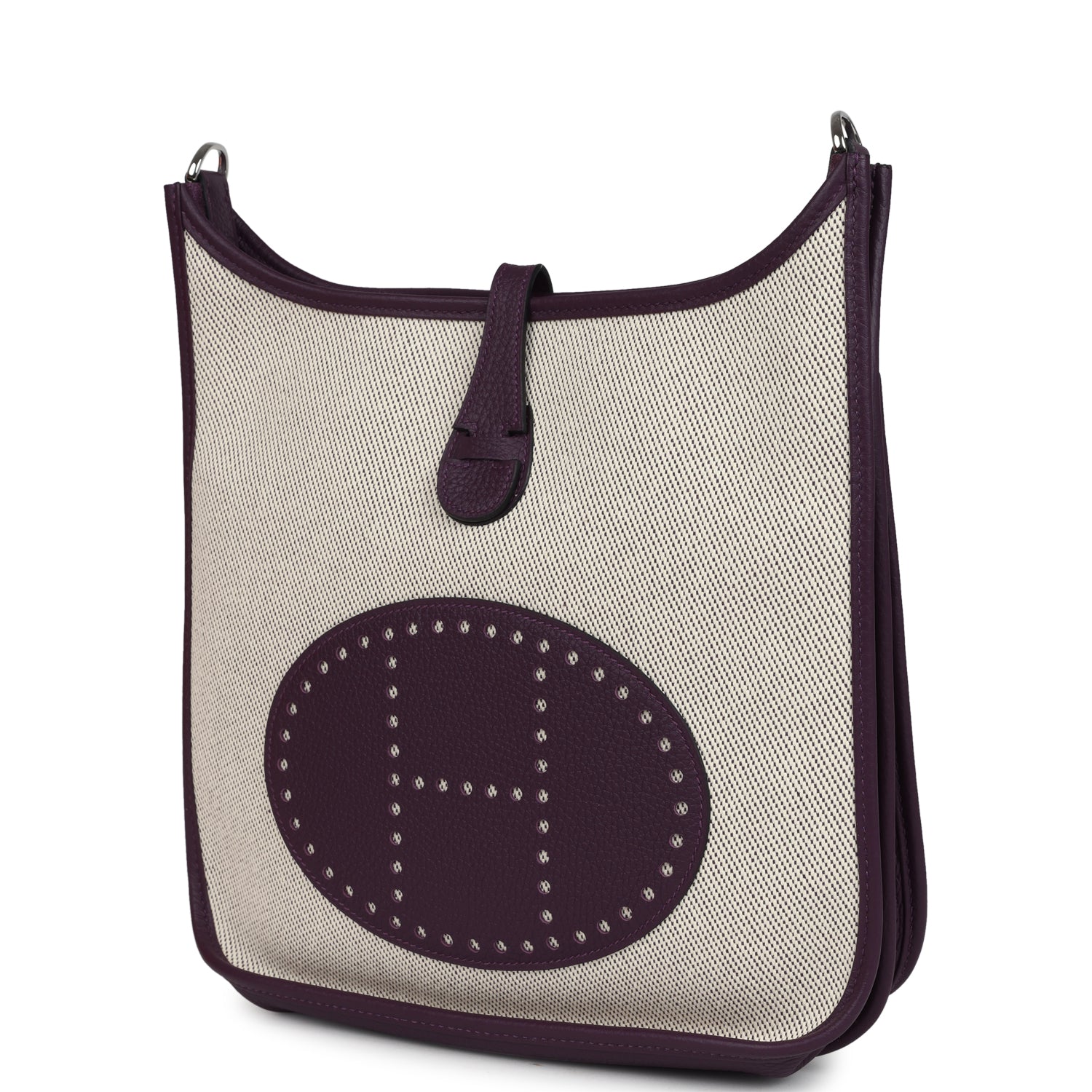 This Evelyne PM messenger bag is of Cassis Clemence leather and Ecru Toile H canvas leather with Palladium Hardware, tonal stitching, large perforated H in circle (front), pull tab top snap closure and removable Cassis shoulder/crossbody strap.