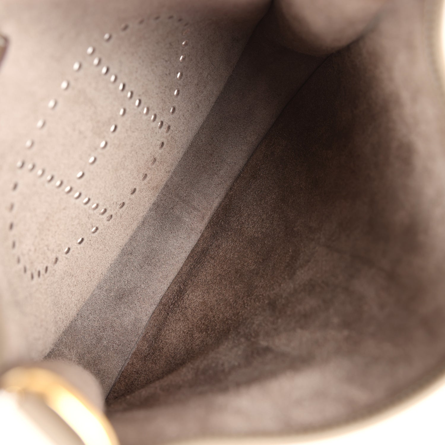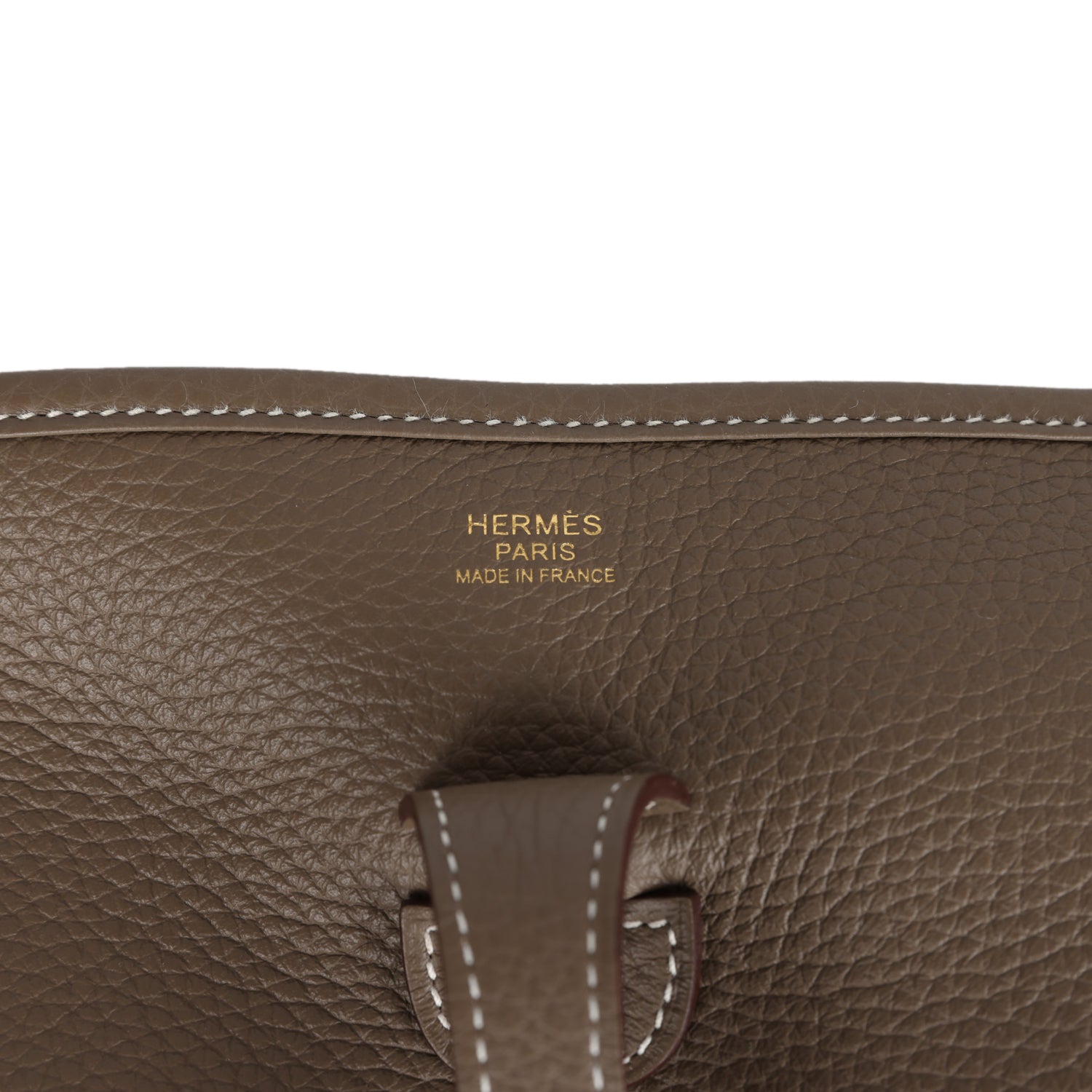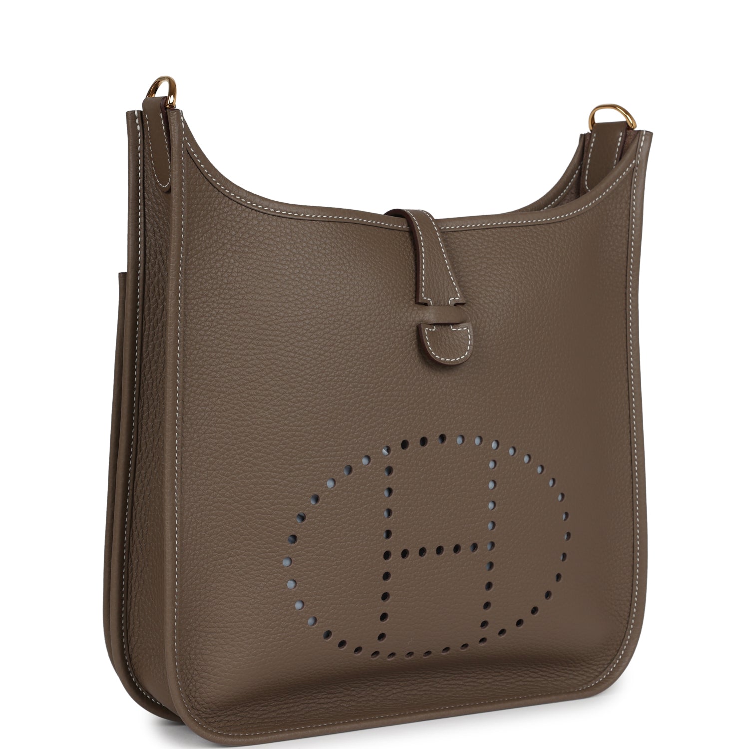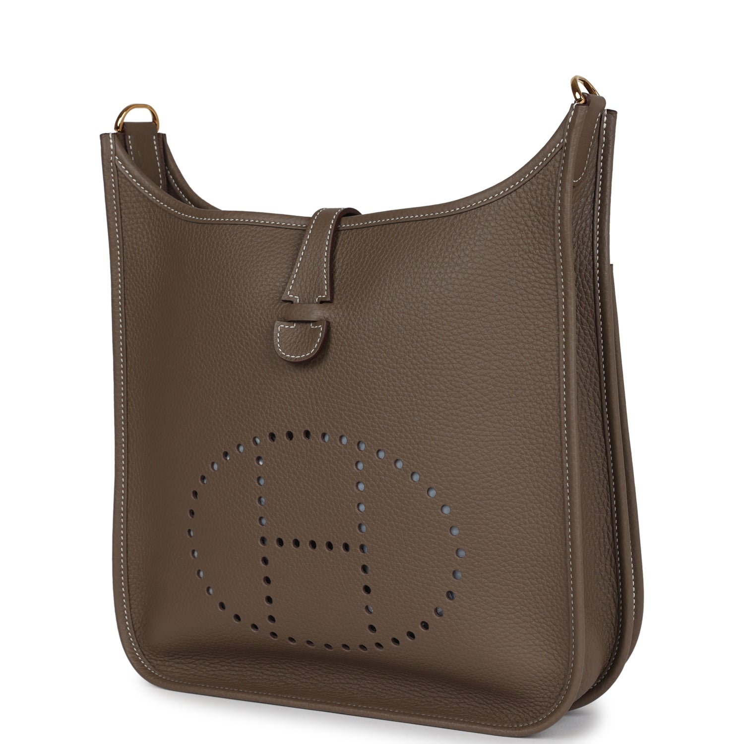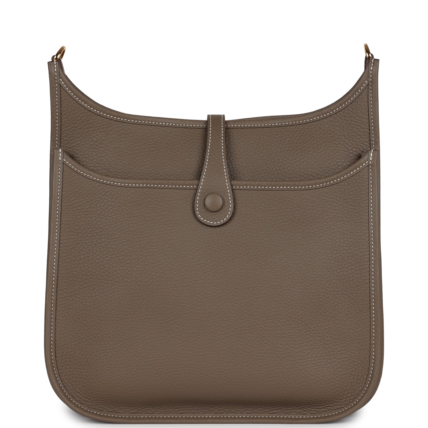 This Evelyne is in Etoupe clemence leather with gold hardware and has contrast stitching, pull tab top closure and Etoupe removable canvas and leather shoulder/crossbody strap.
