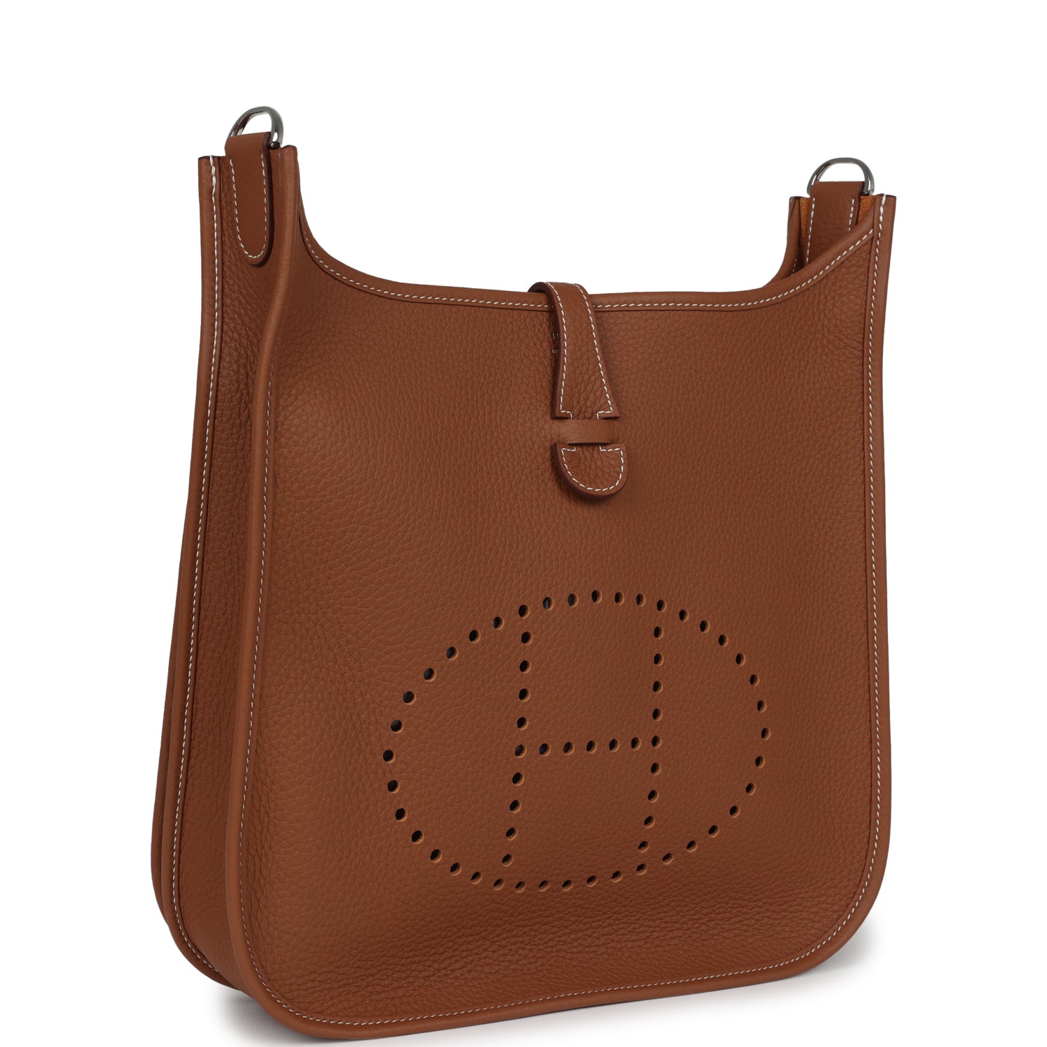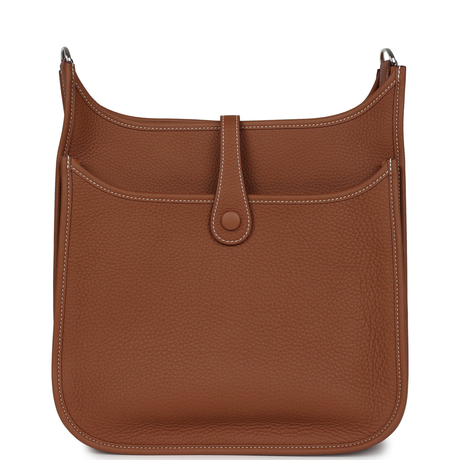 This Evelyne is in Gold clemence leather with palladium hardware and has contrast stitching, pull tab top closure and Gold removable canvas and leather shoulder/crossbody strap.
