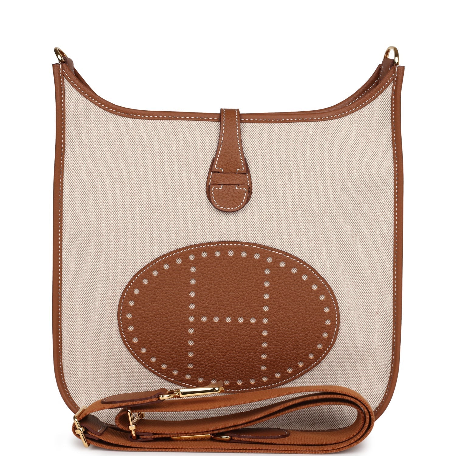 This Evelyne is in Gold and Ecru toile canvas with Gold clemence leather trim with gold hardware, tonal stitching, large perforated H in circle (front), pull tab top snap closure and removable Gold shoulder/crossbody strap, with exterior back pocket.