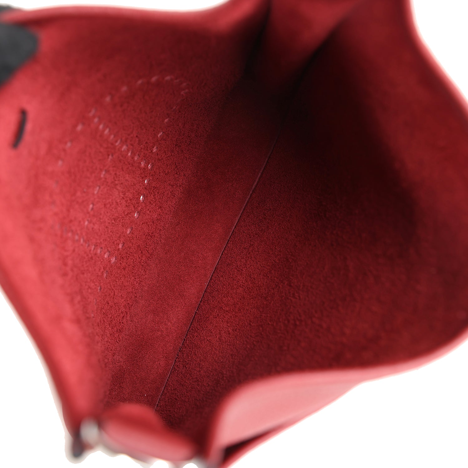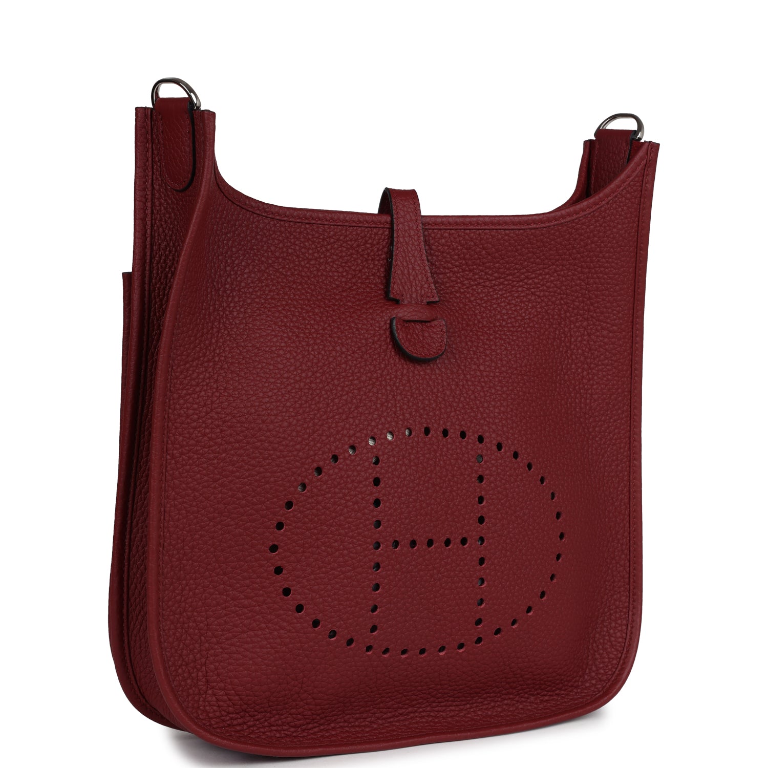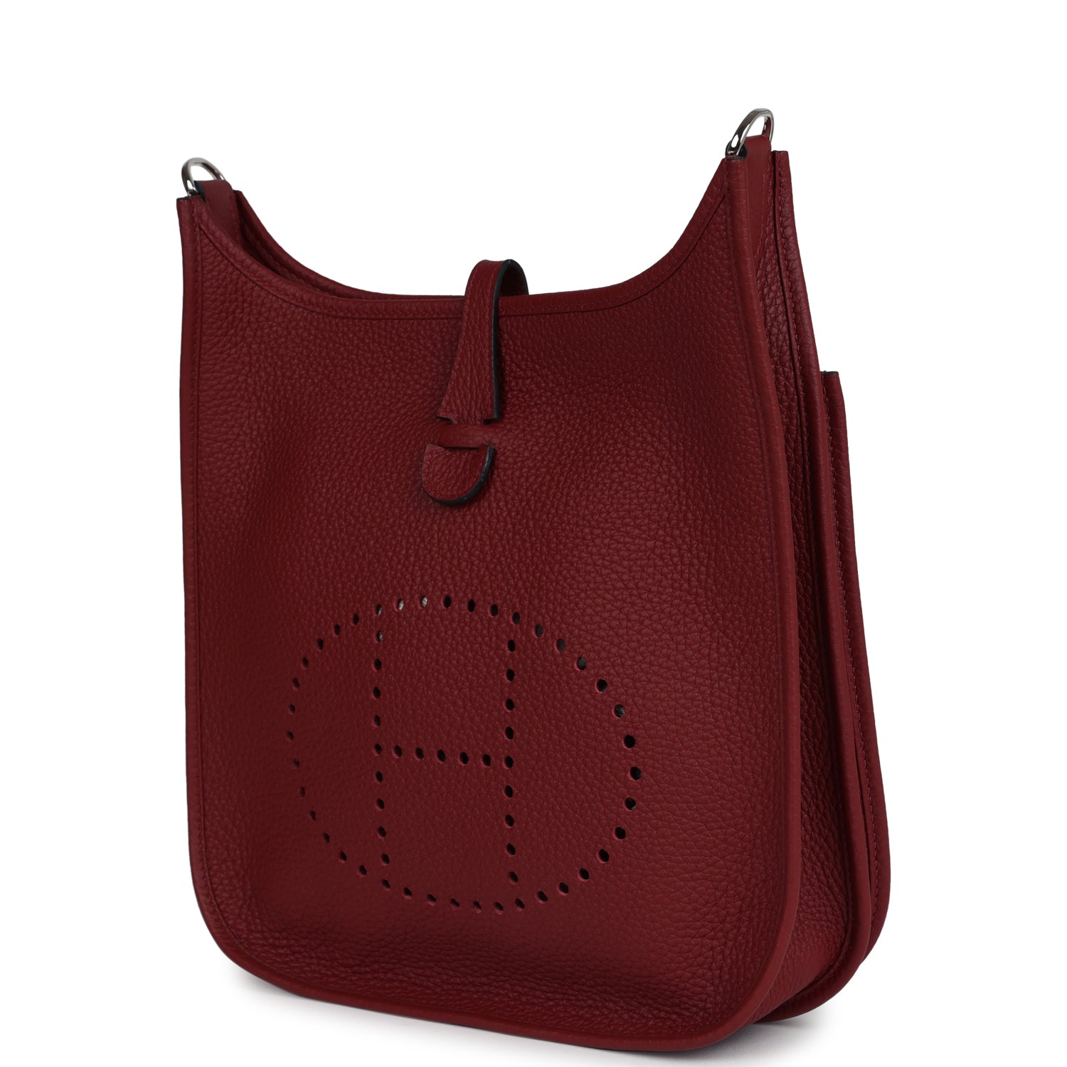This Evelyne is in Rouge H clemence leather with palladium hardware, tonal stitching, large perforated H in circle (front), pull tab top snap closure and a removable Rouge H shoulder/crossbody strap.