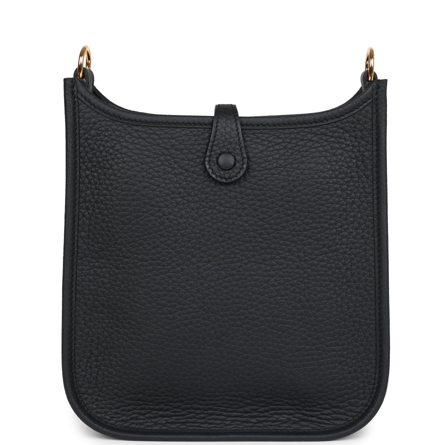This Evelyne TPM is in Black clemence leather with gold hardware and features tonal stitching stitching, pull tab top closure and a removable Black canvas and leather shoulder/crossbody strap.