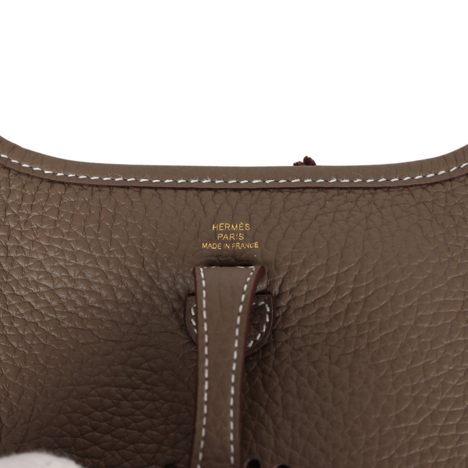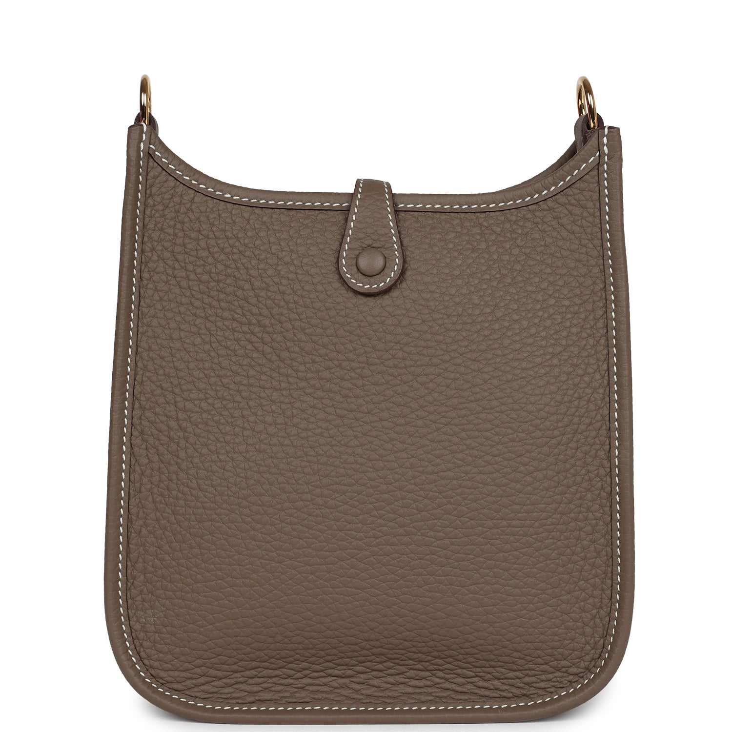 This Evelyne TPM is in Etoupe clemence leather with gold hardware and has contrast stitching, pull tab top closure and a removable canvas and leather shoulder/crossbody strap.