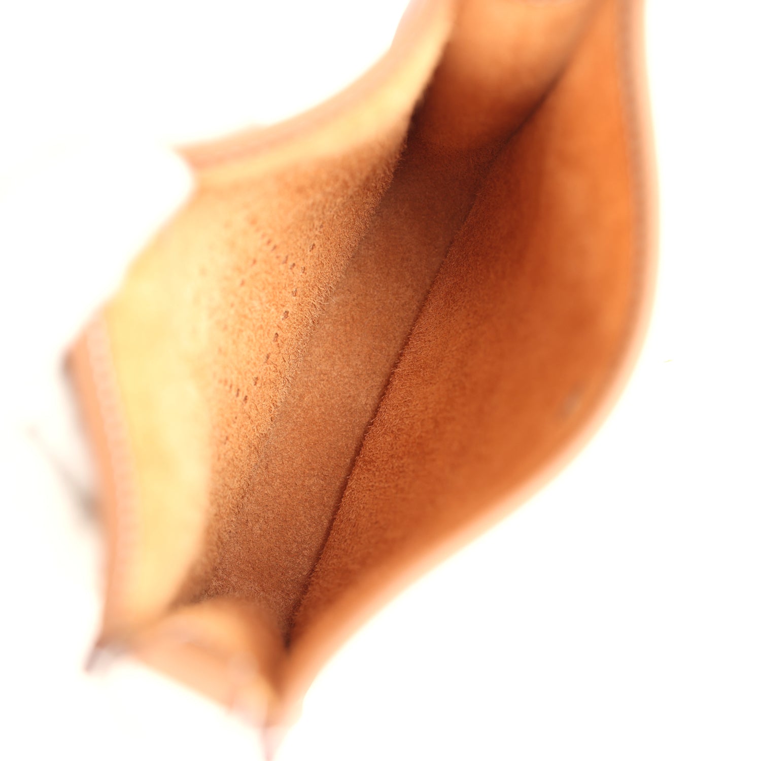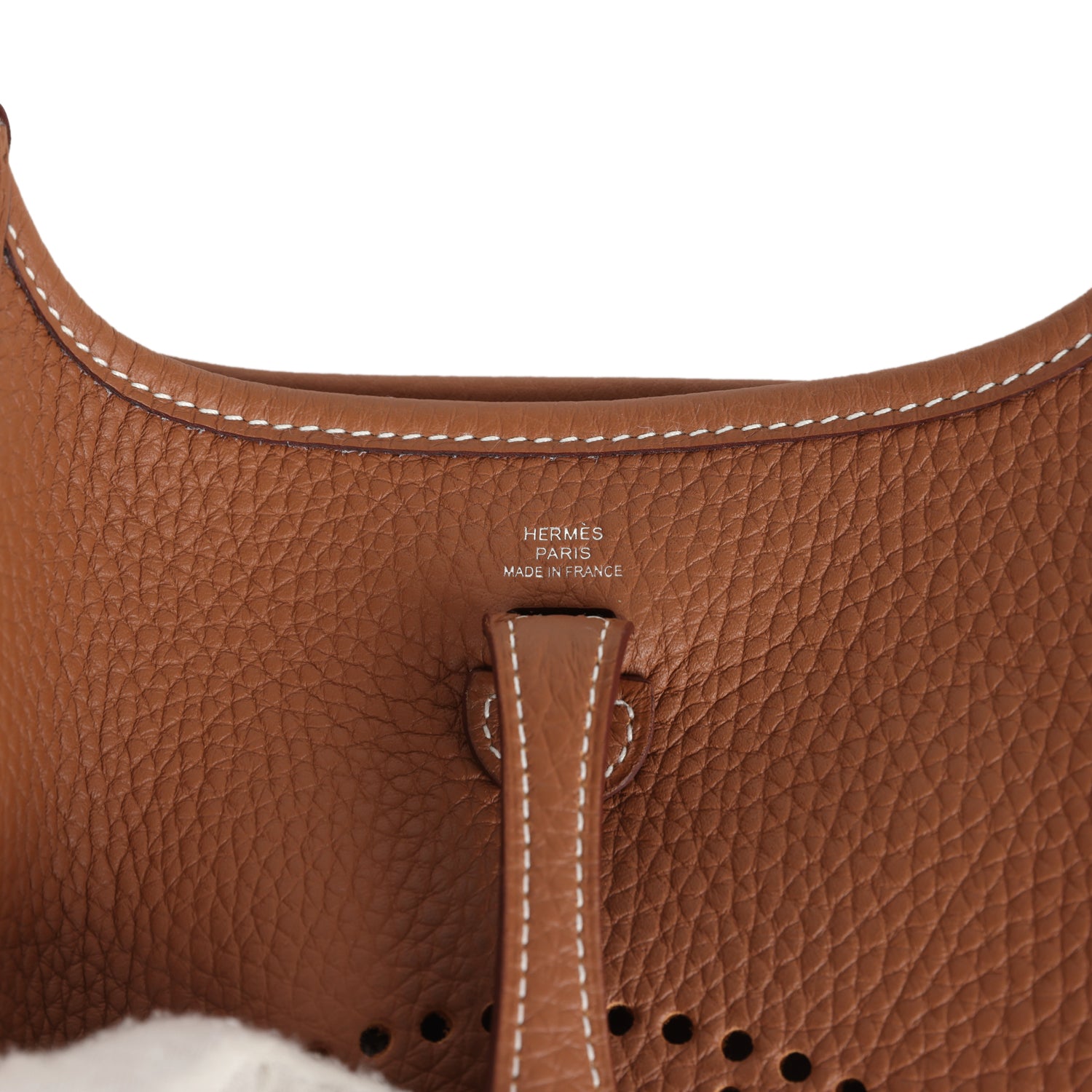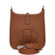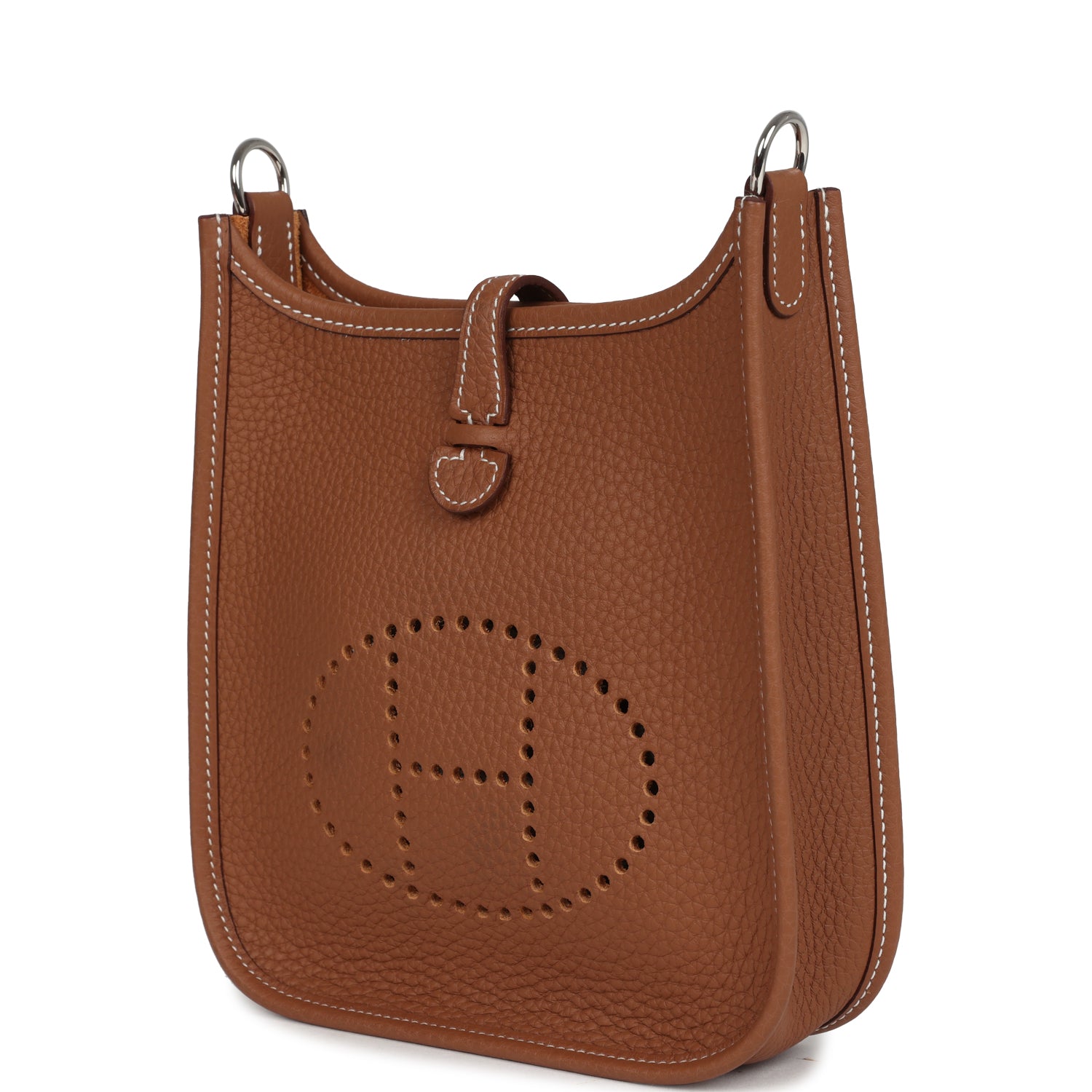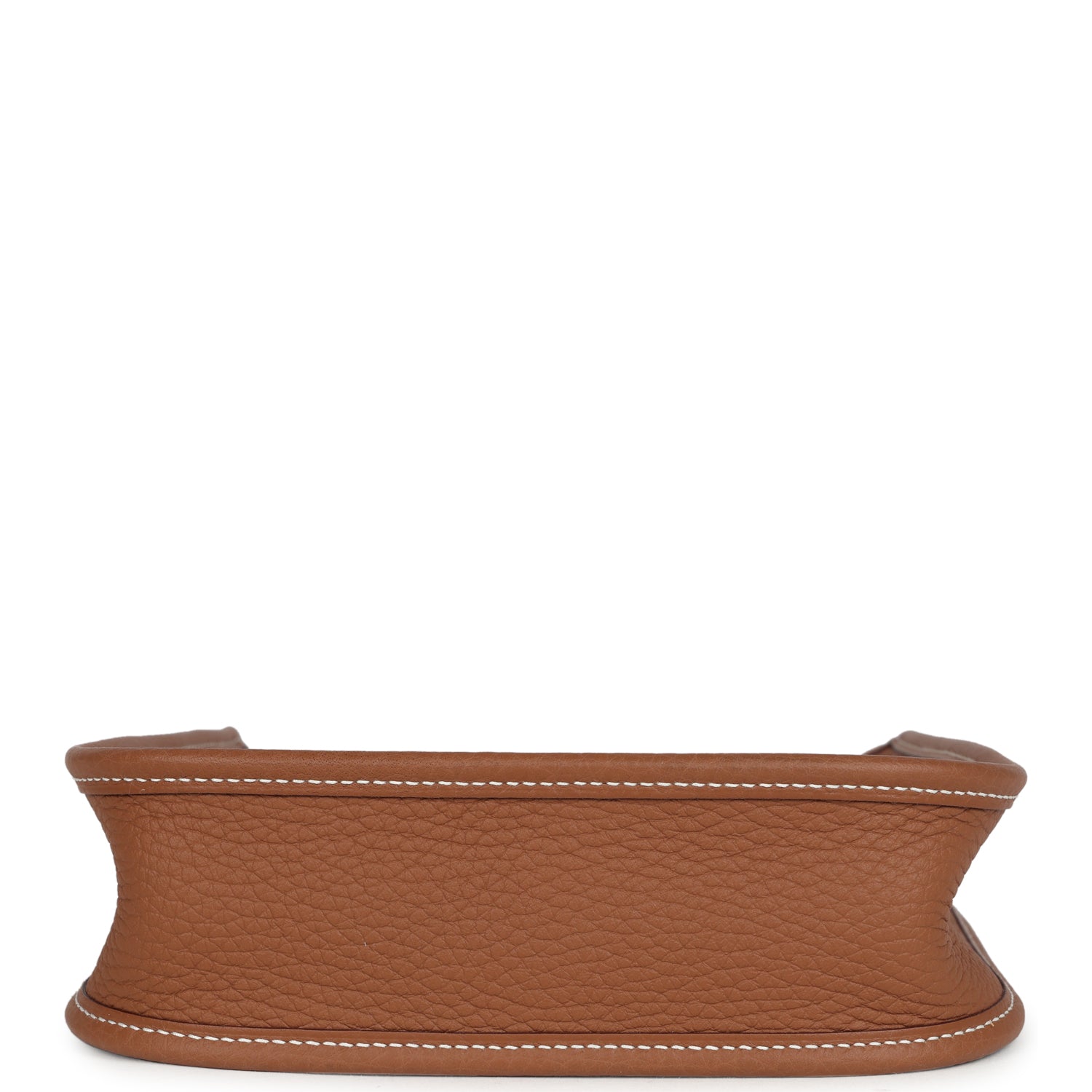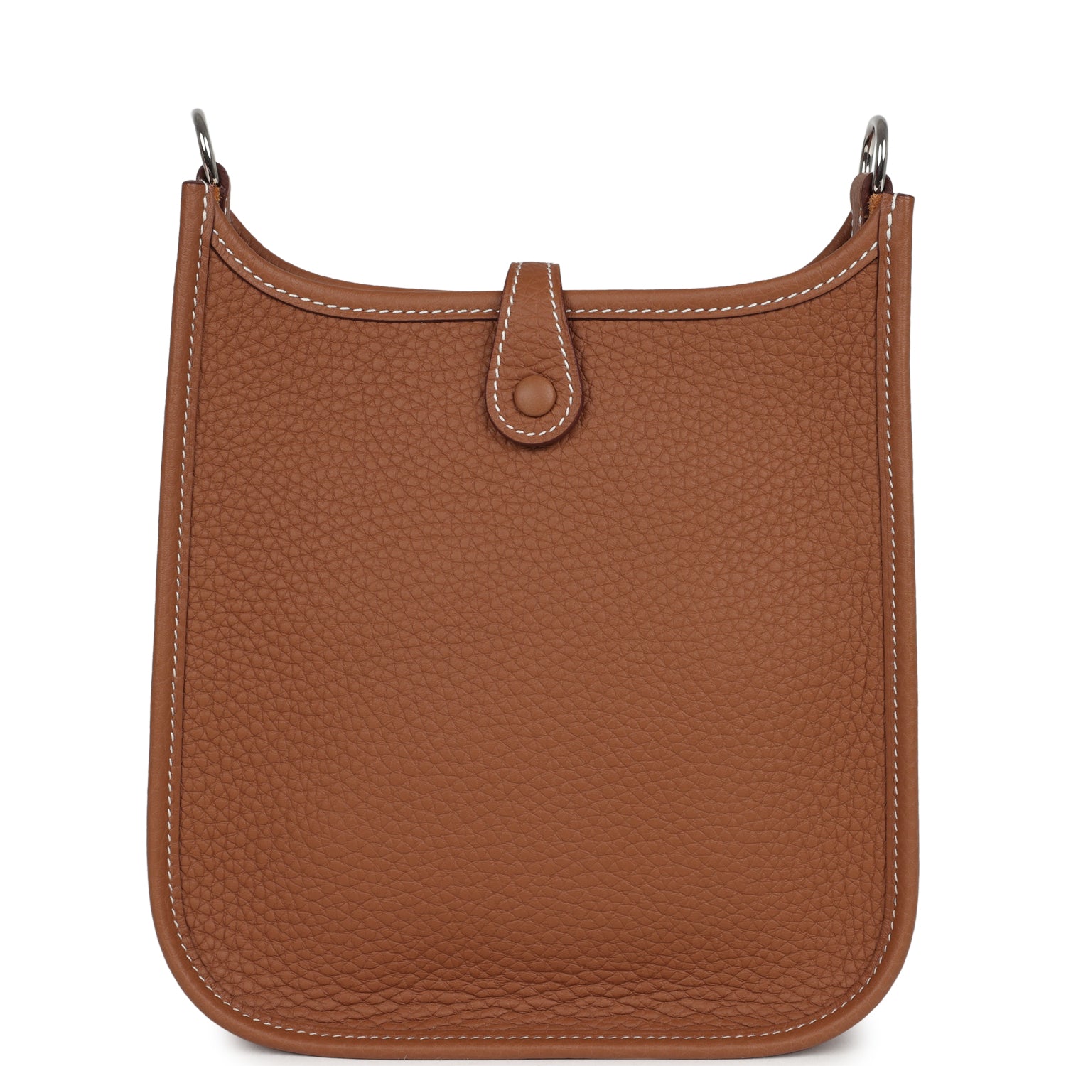 This Evelyne TPM is in Gold clemence leather with palladium hardware and features contrast stitching stitching, pull tab top closure and a removable Gold canvas and leather shoulder/crossbody strap.
