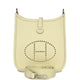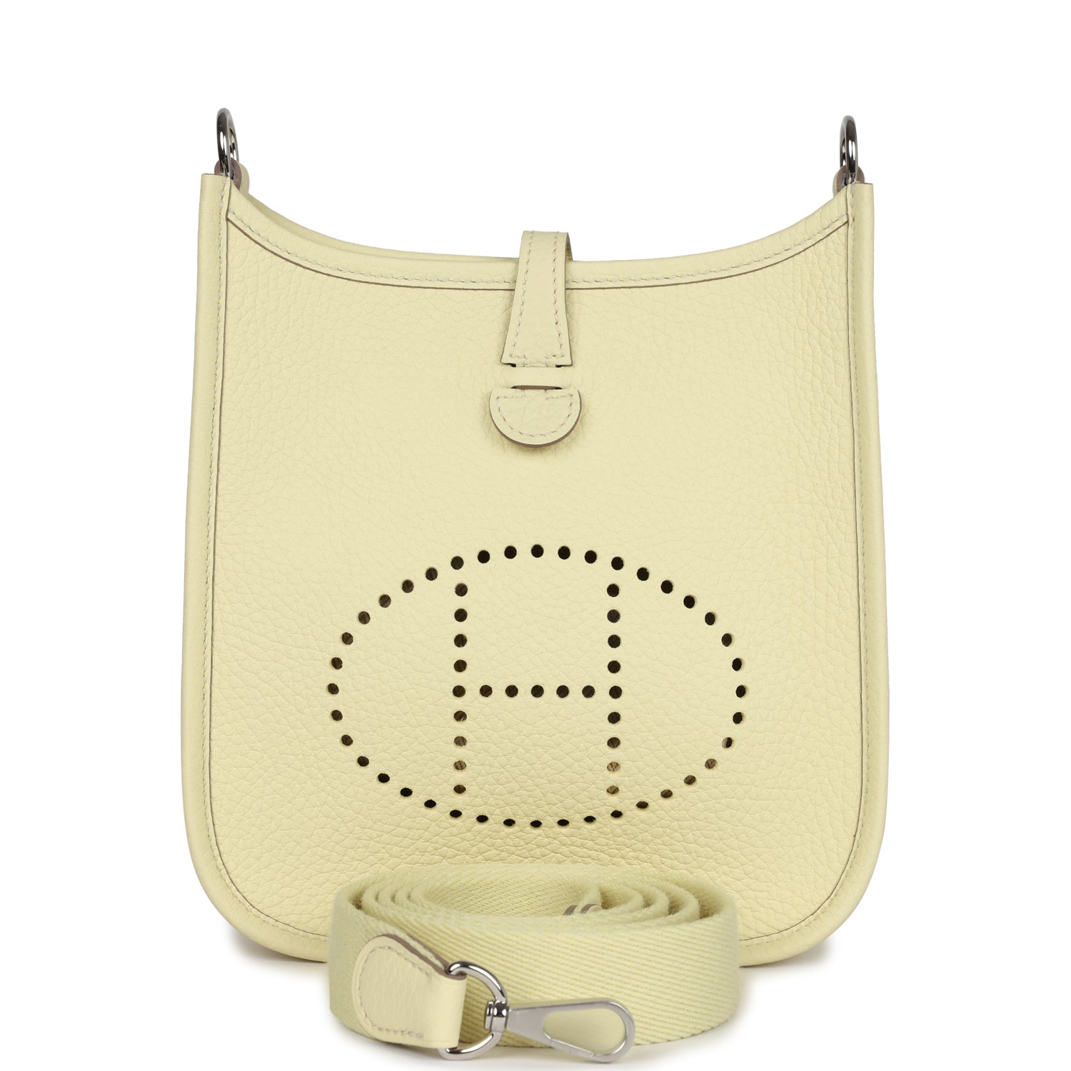 This Evelyne TPM is in Jaune Milton clemence with palladium hardware, tonal stitching large perforated H in circle (front), pull tab snap closure and a removable Jaune Milton wooly/canvas shoulder/crossbody strap.