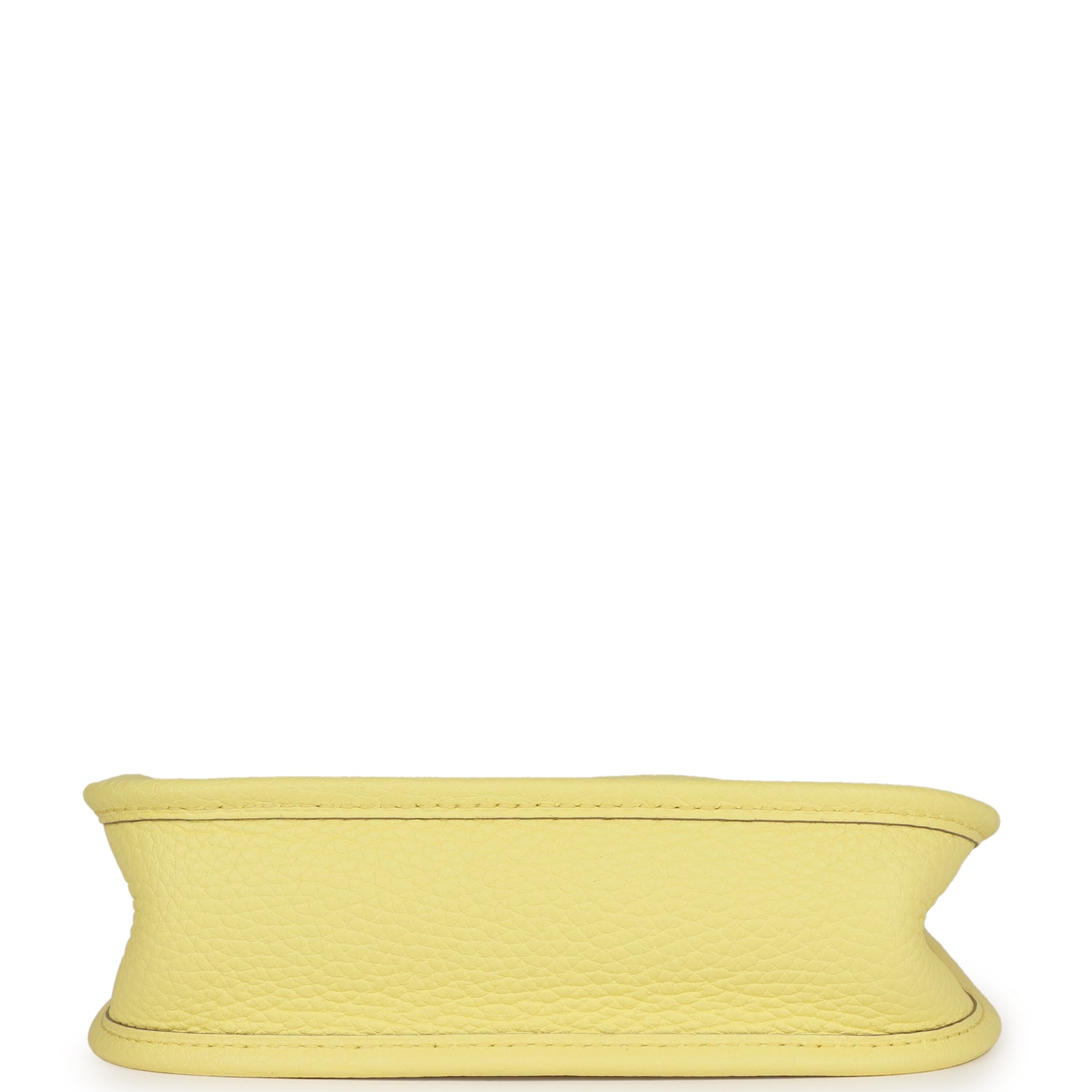 This Evelyne TPM is in Limoncello clemence leather with palladium hardware and features tonal stitching stitching, pull tab top closure and a Limoncello removable canvas and leather shoulder/crossbody strap.