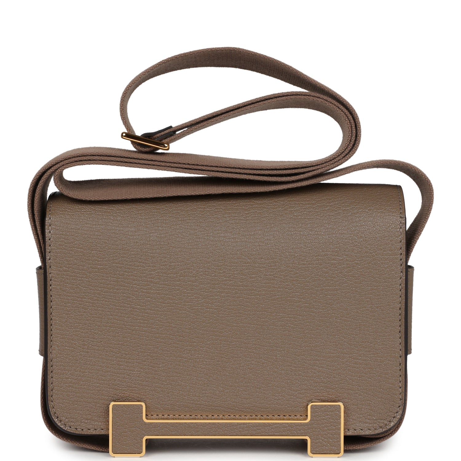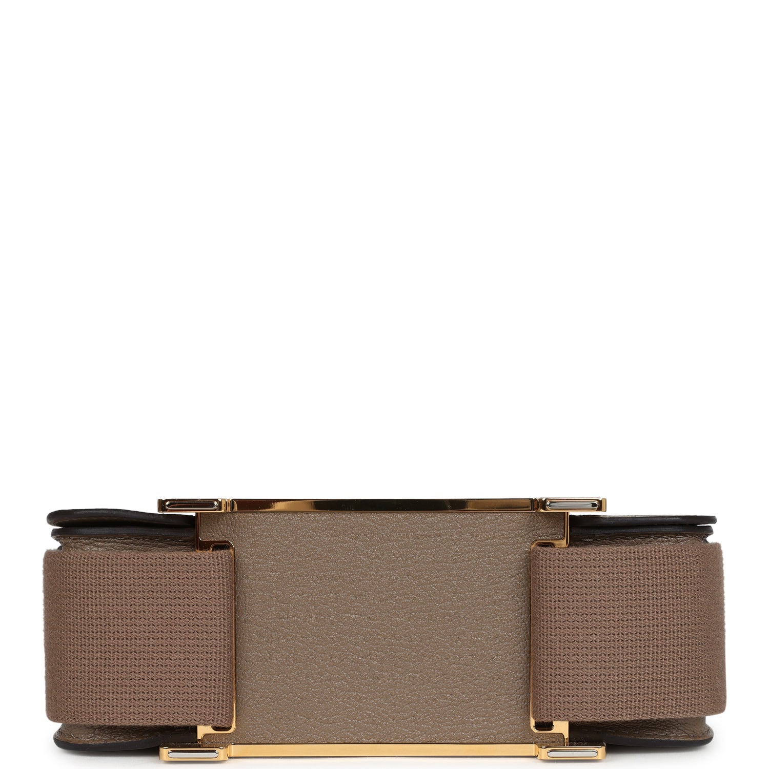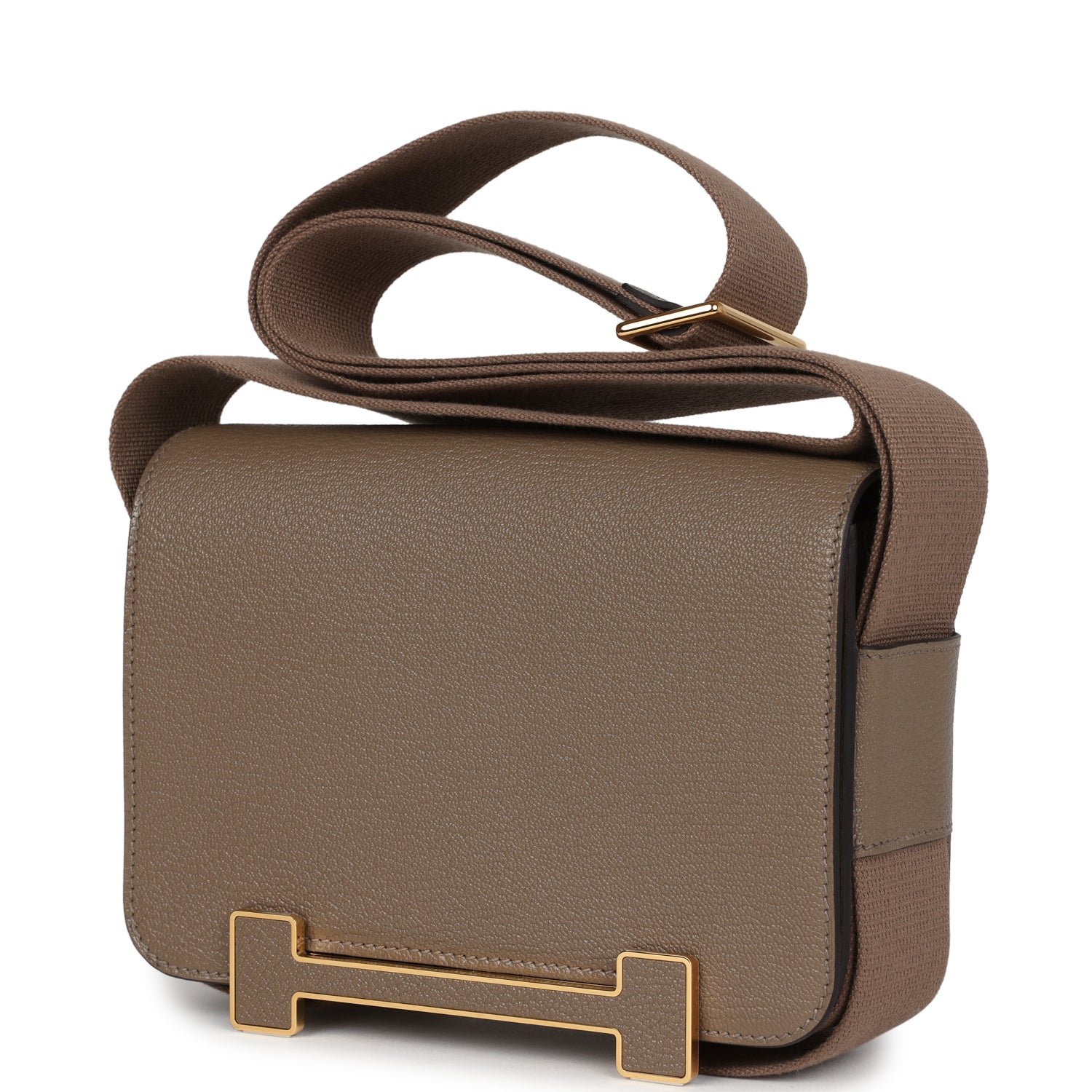 This Geta is in Etoupe chevre mysore leather with gold hardware and has tonal stitching, an Etoupe magnetic flap closure and adjustable shoulder strap.