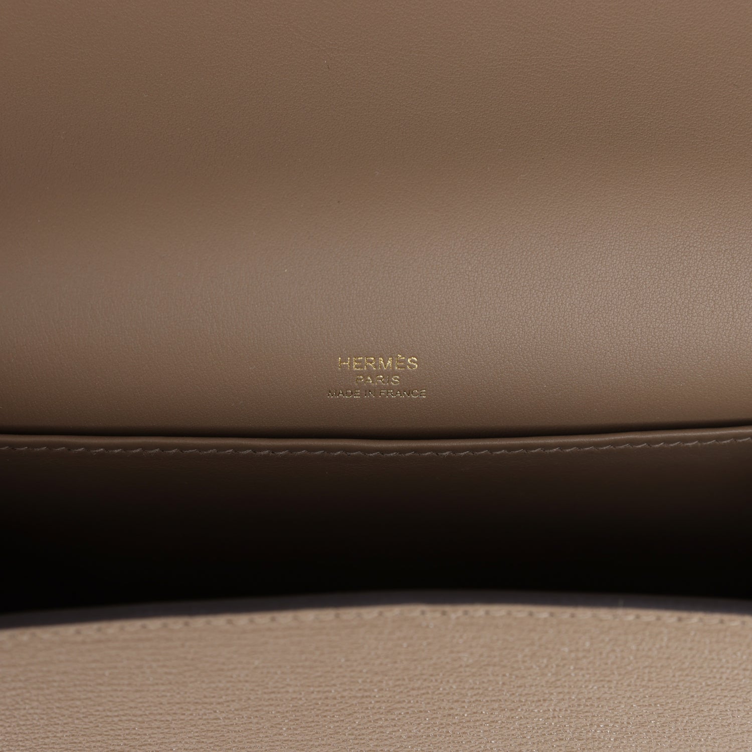 The interior is lined with Etoupe leather with one slip pocket on the back wall and two slip pockets on the front wall.