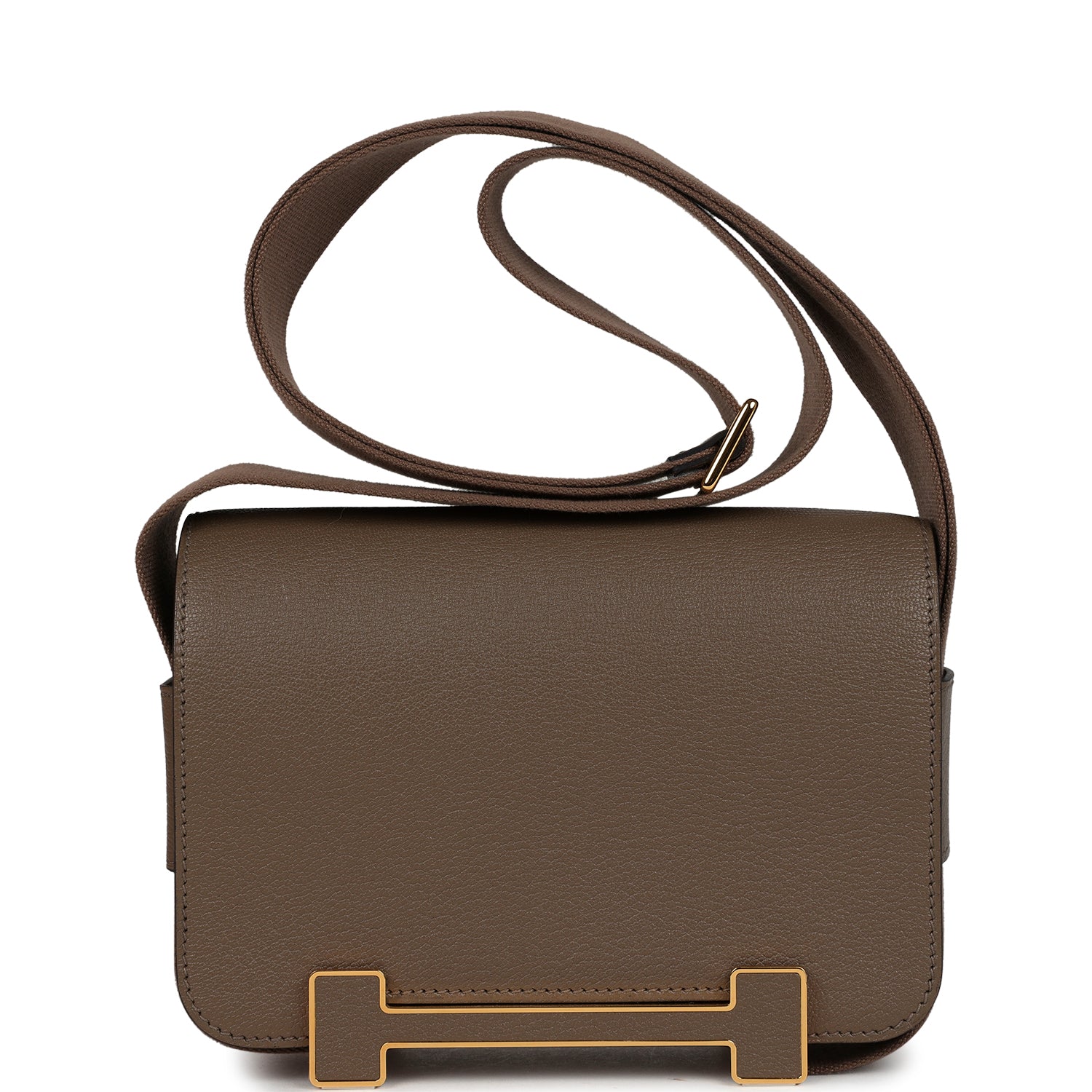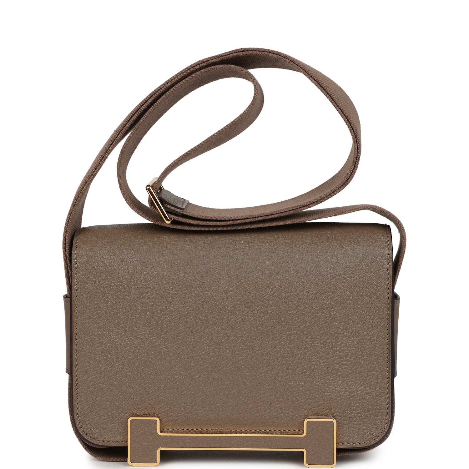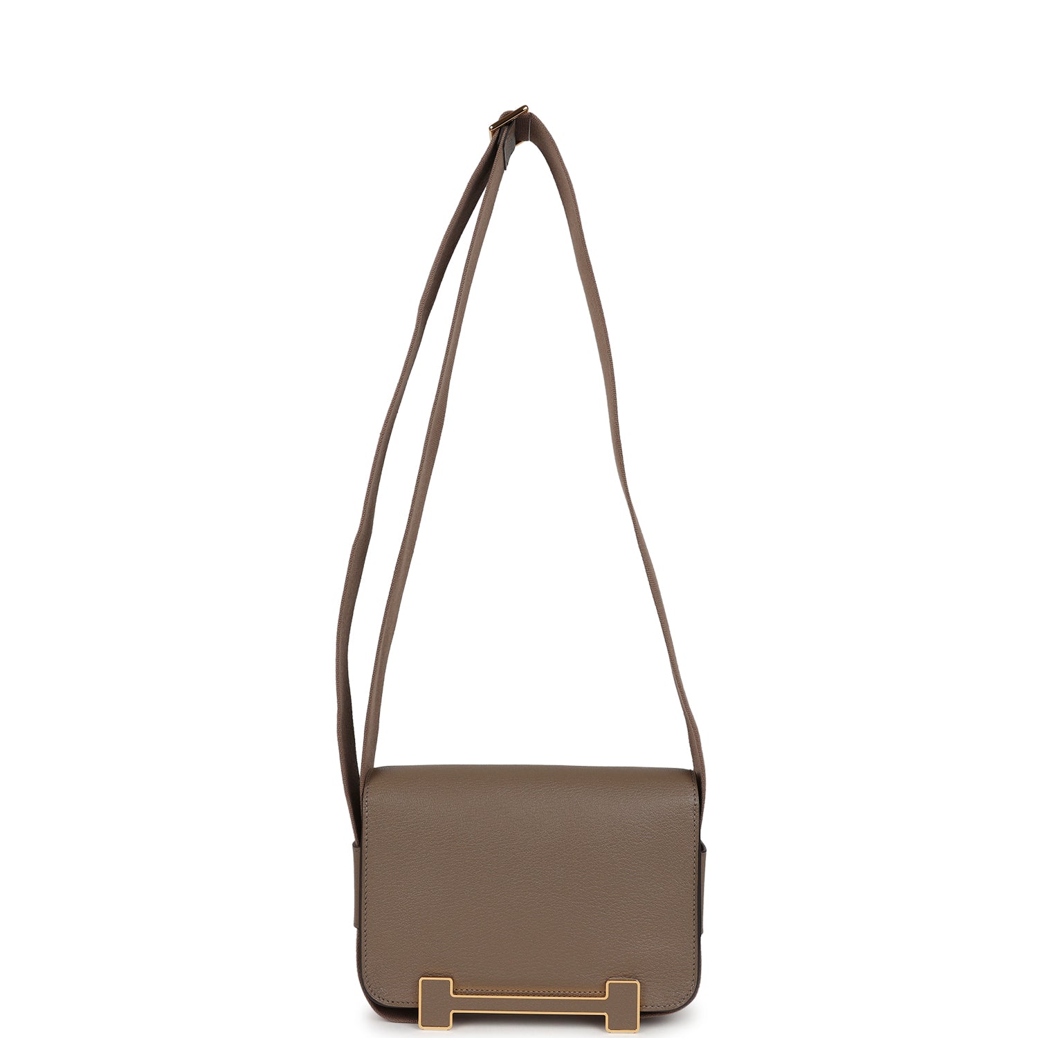 This Geta is in Etoupe chevre mysore leather with gold hardware and has tonal stitching, an Etoupe magnetic flap closure and adjustable shoulder strap.