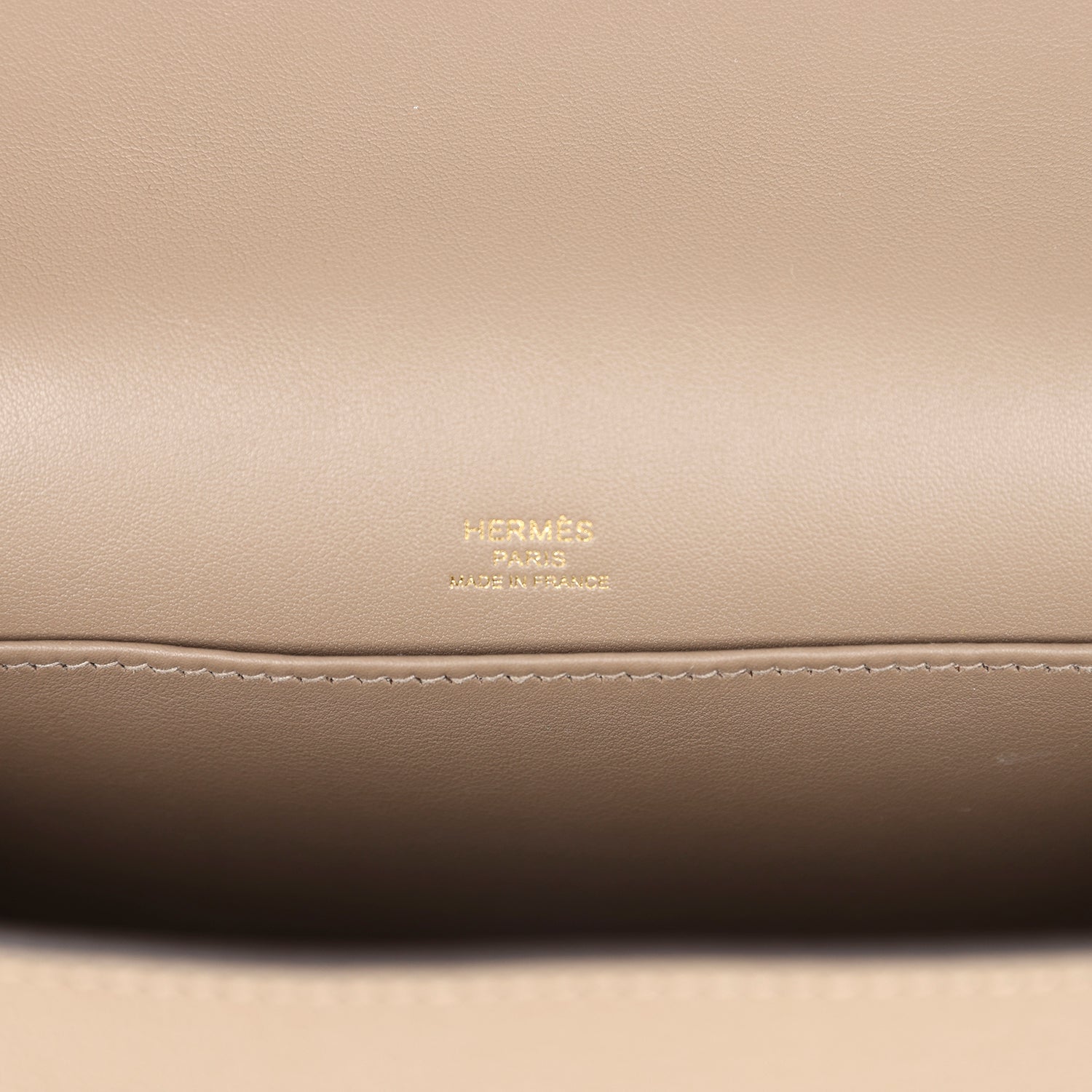 The interior is lined with Etoupe leather with one slip pocket on the back wall and two slip pockets on the front wall.