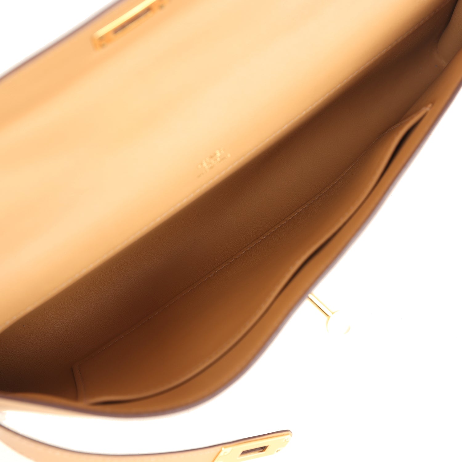 This Kelly Cut Biscuit swift leather with gold hardware, features tonal stitching, front flap, pull straps that attach to a toggle, and small top handle.