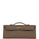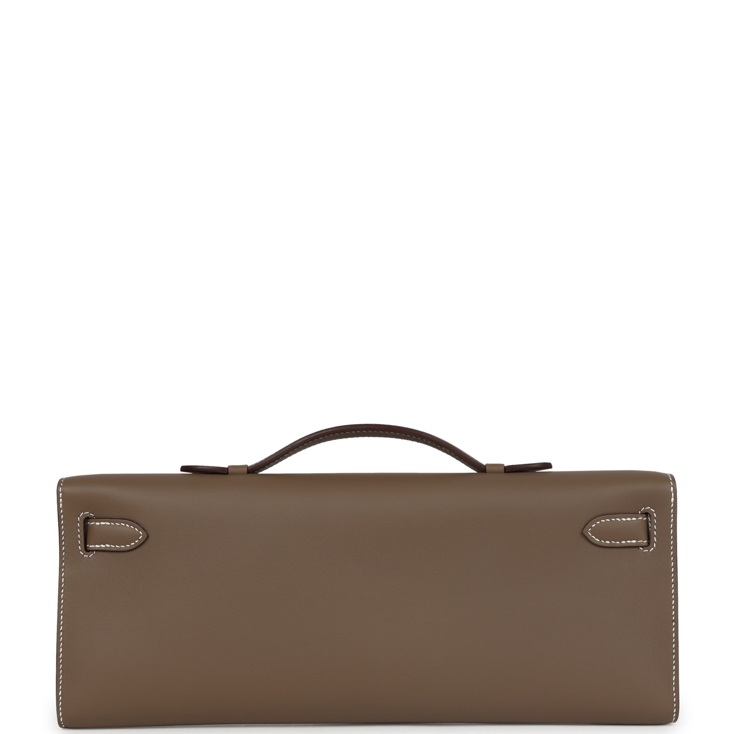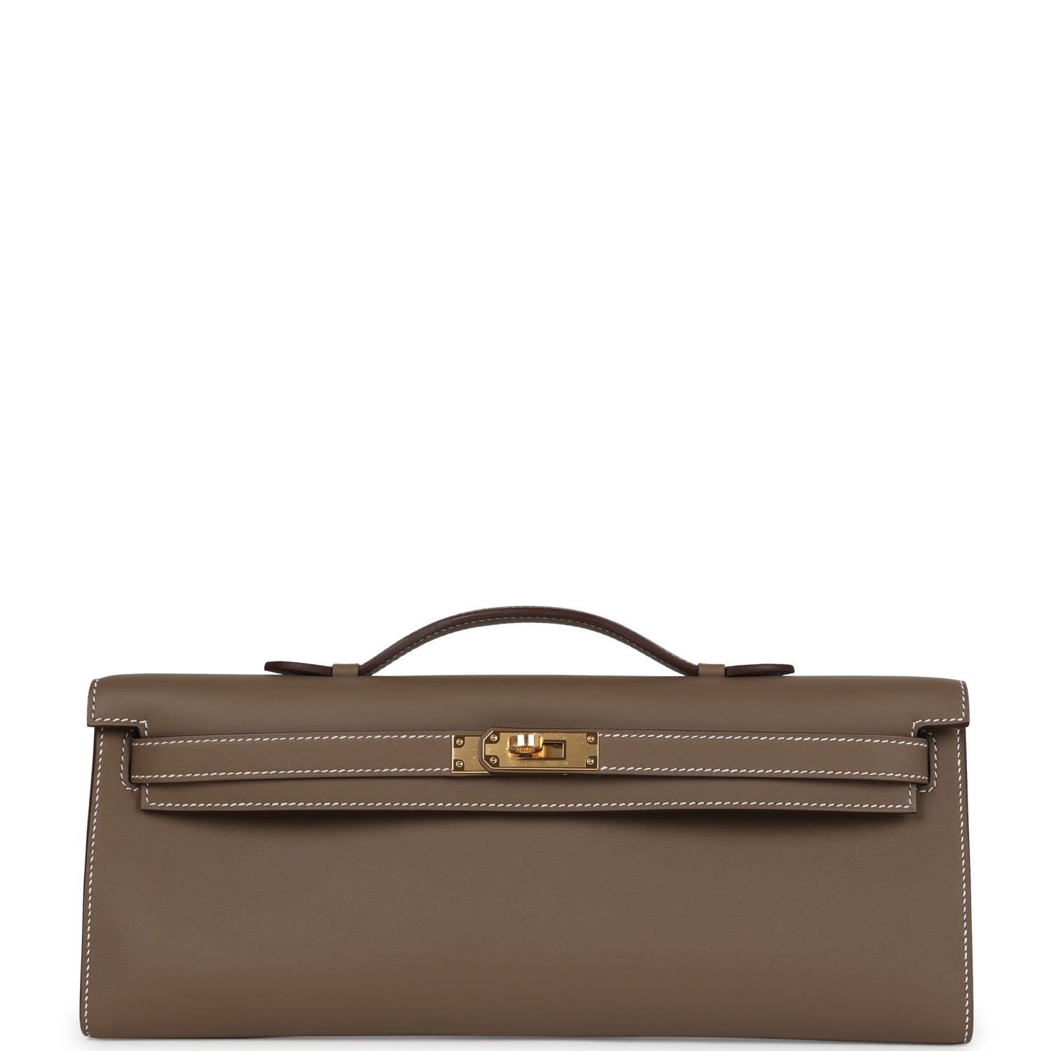 This Kelly Cut Etoupe swift leather with gold hardware, features contrast stitching, front flap, pull straps that attach to a toggle, and small top handle.