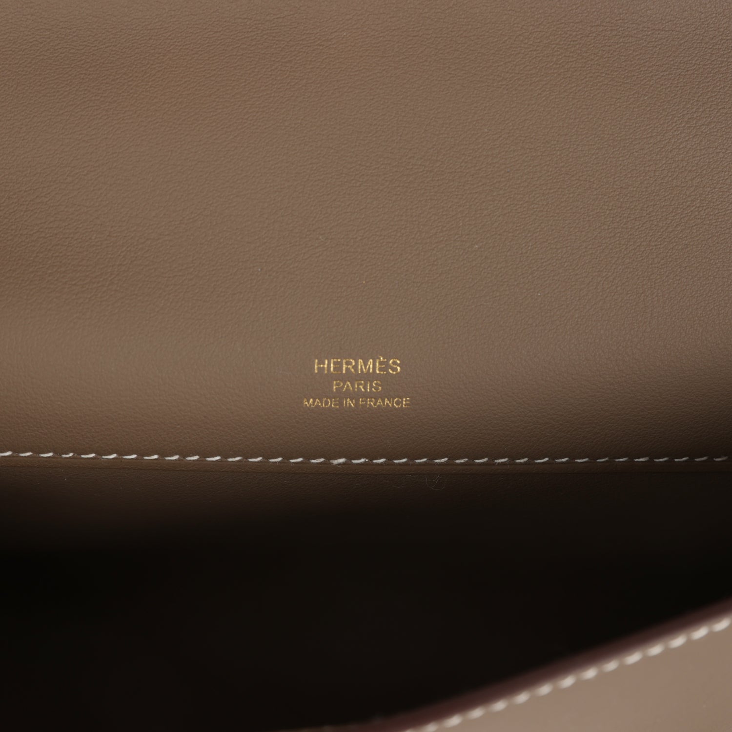 The interior is lined in Etoupe swift leather and has one interior slip pocket on rear wall.