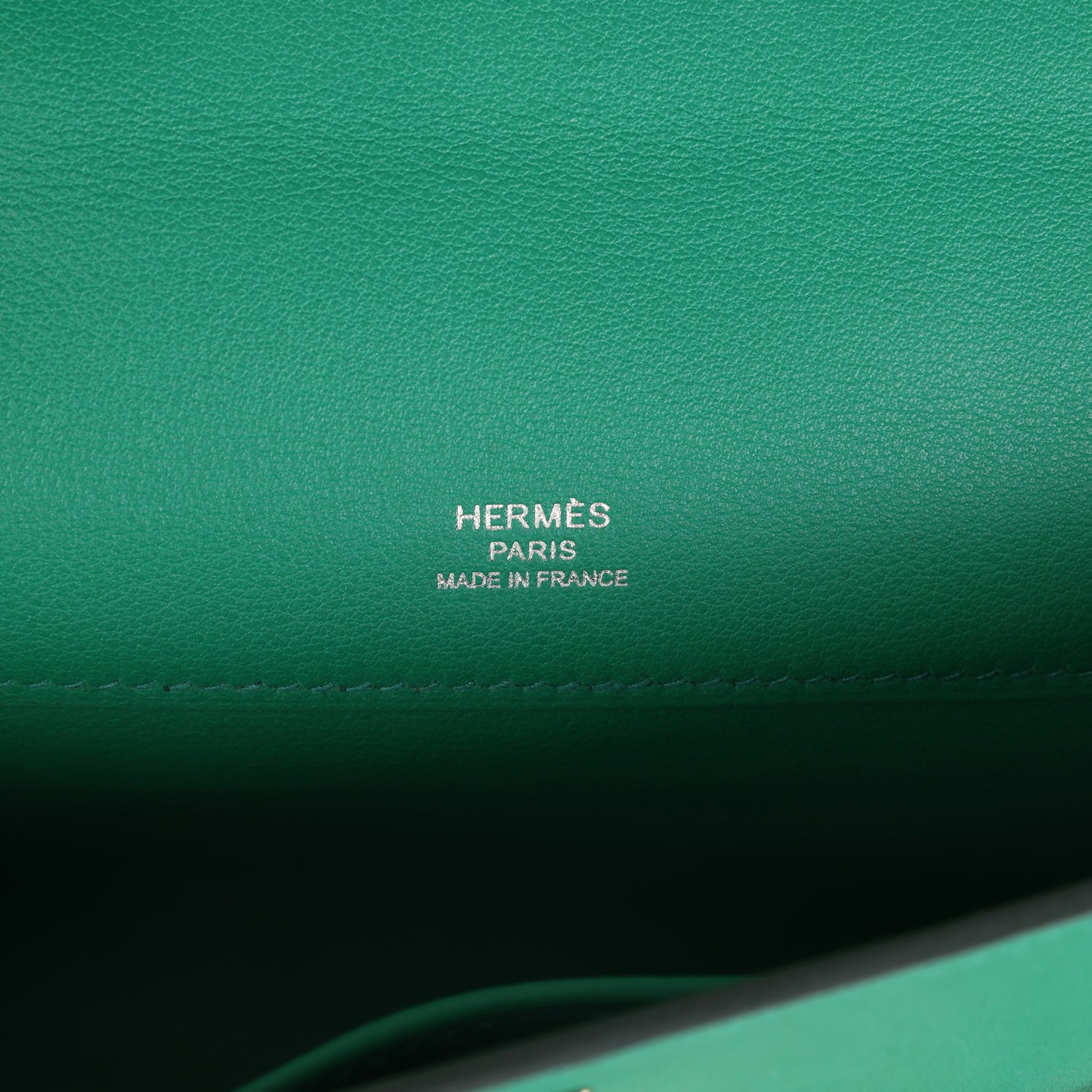 This Kelly Cut Vert Vertigo swift leather with palladium hardware, features tonal stitching, front flap, pull straps that attach to a toggle, and small top handle.