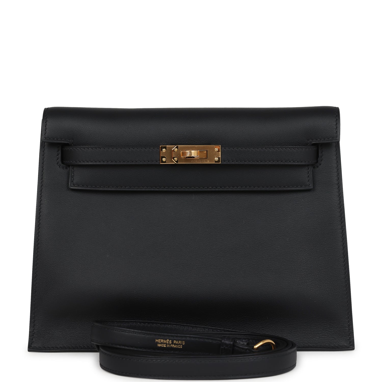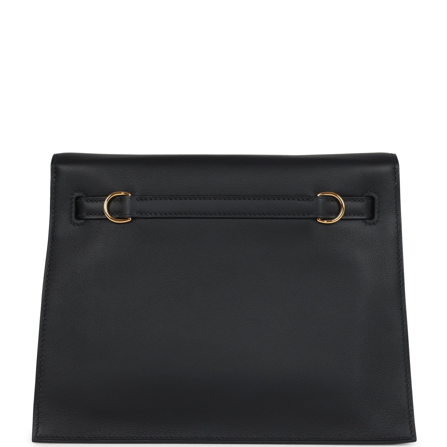 This Kelly Danse II is in Black swift leather with gold hardware and has tonal stitching, two straps with front flap closure and an adjustable flat shoulder strap for multistyle wear.