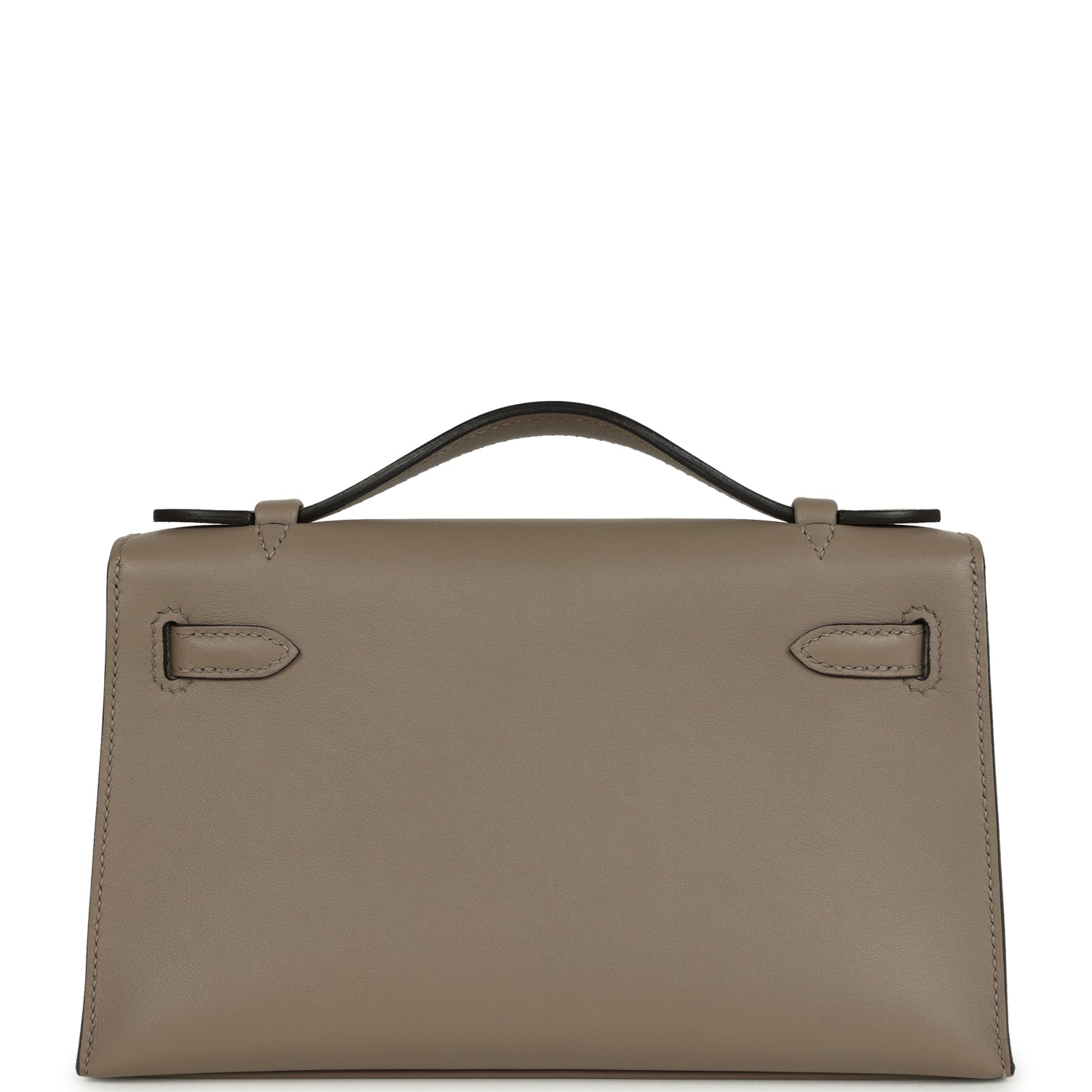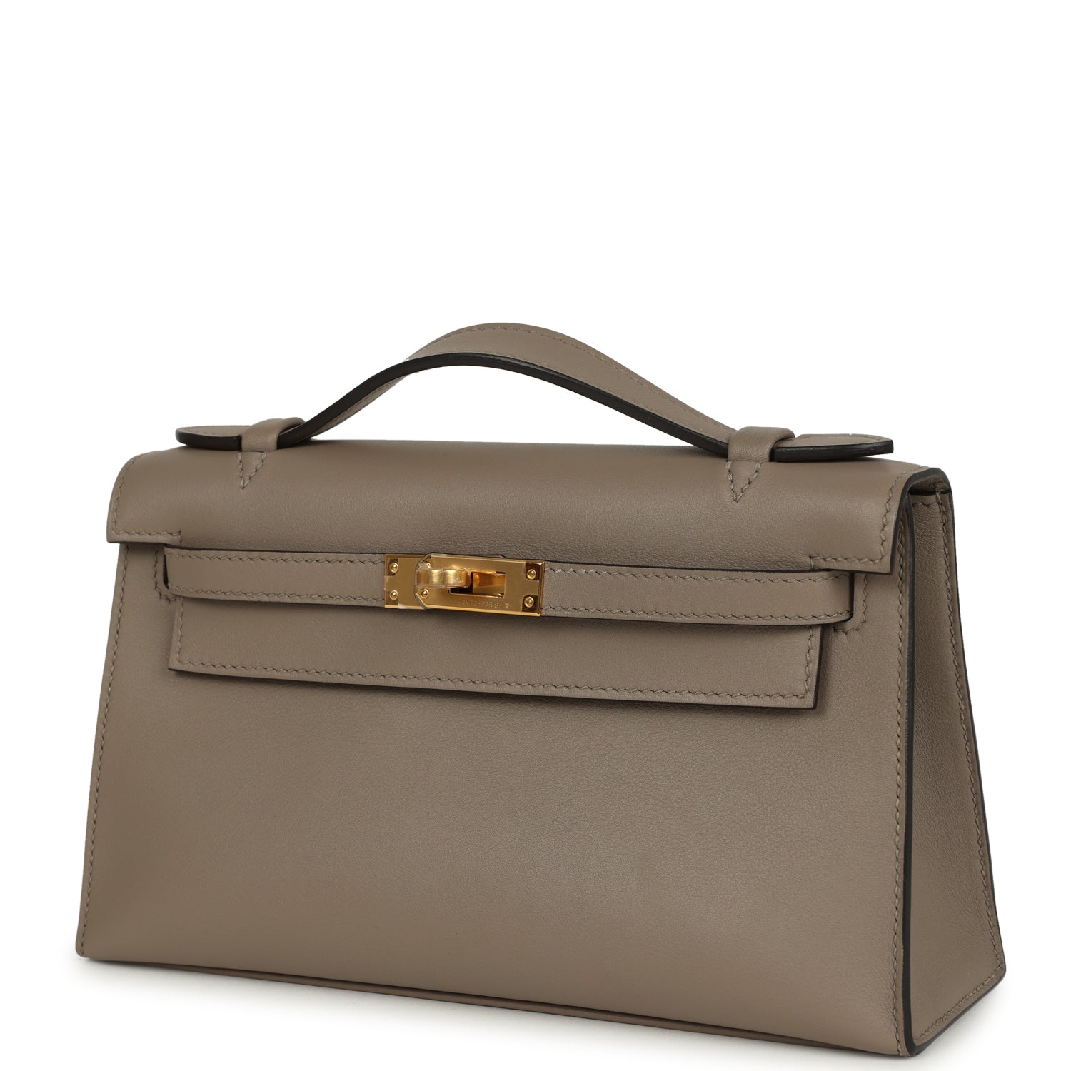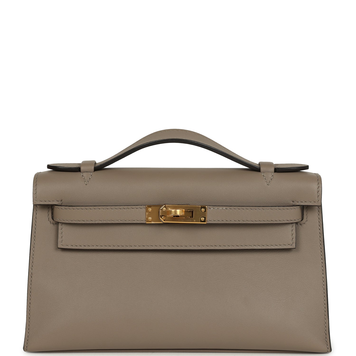 This Kelly Pochette is in Gris Asphalte swift leather with gold hardware and has tonal stitching, front flap, two straps with center toggle closure and a top flat handle.