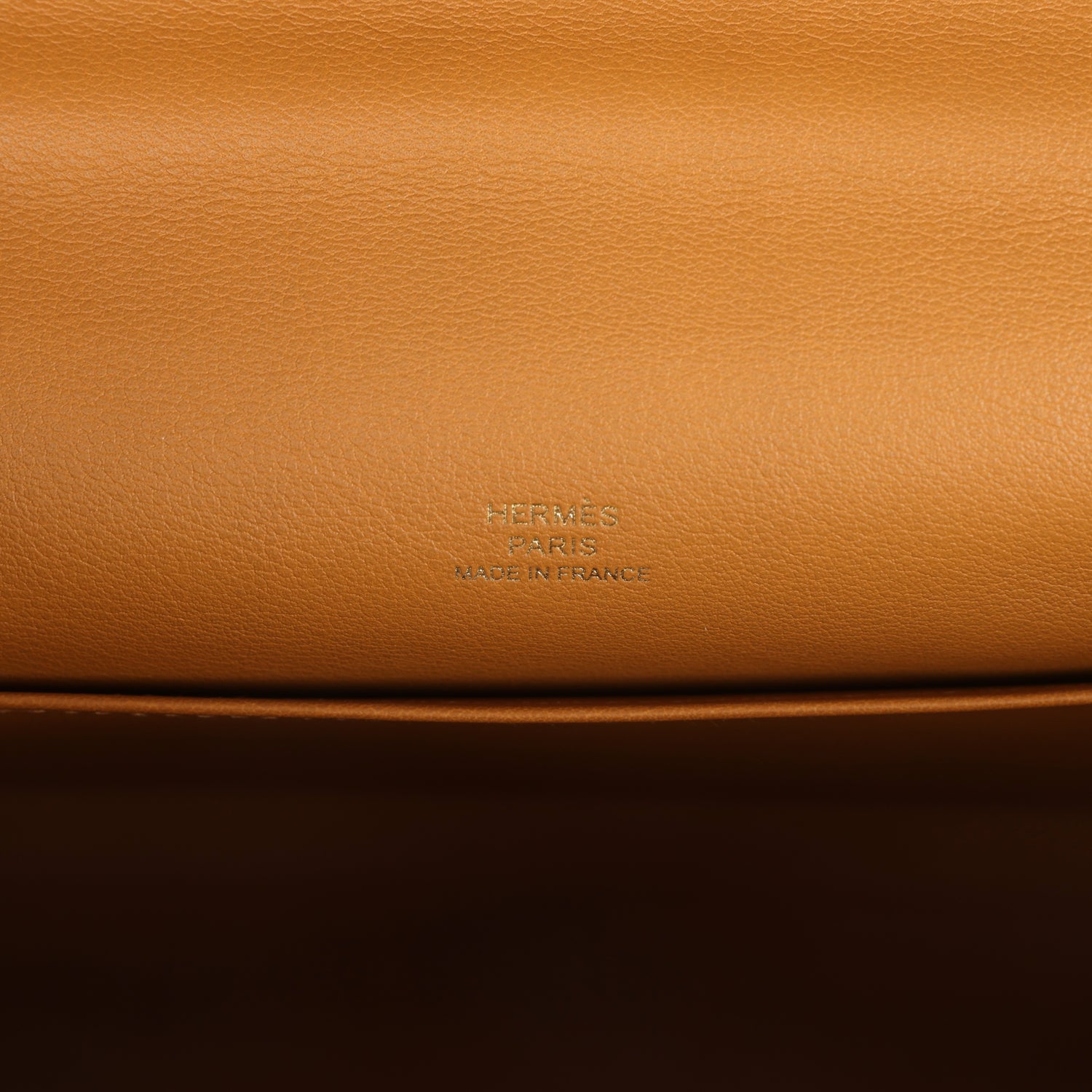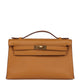 This Mini Kelly Pochette is in is in Sesame swift leather with gold hardware and has tonal stitching, front flap, two straps with center toggle closure and a top flat handle.