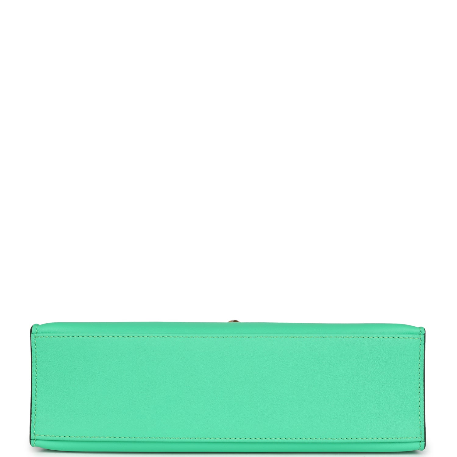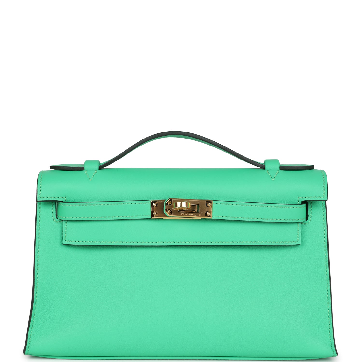 This Kelly Pochette is in Vert Comics swift leather with gold hardware and has tonal stitching, front flap, two straps with center toggle closure and a top flat handle.